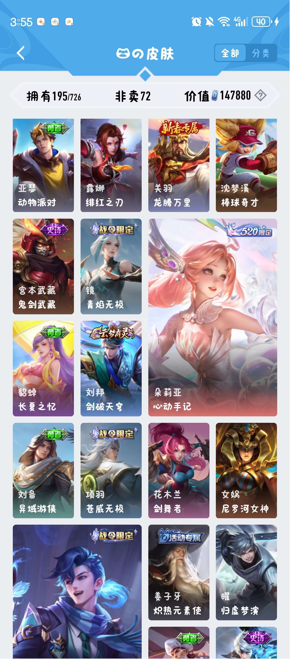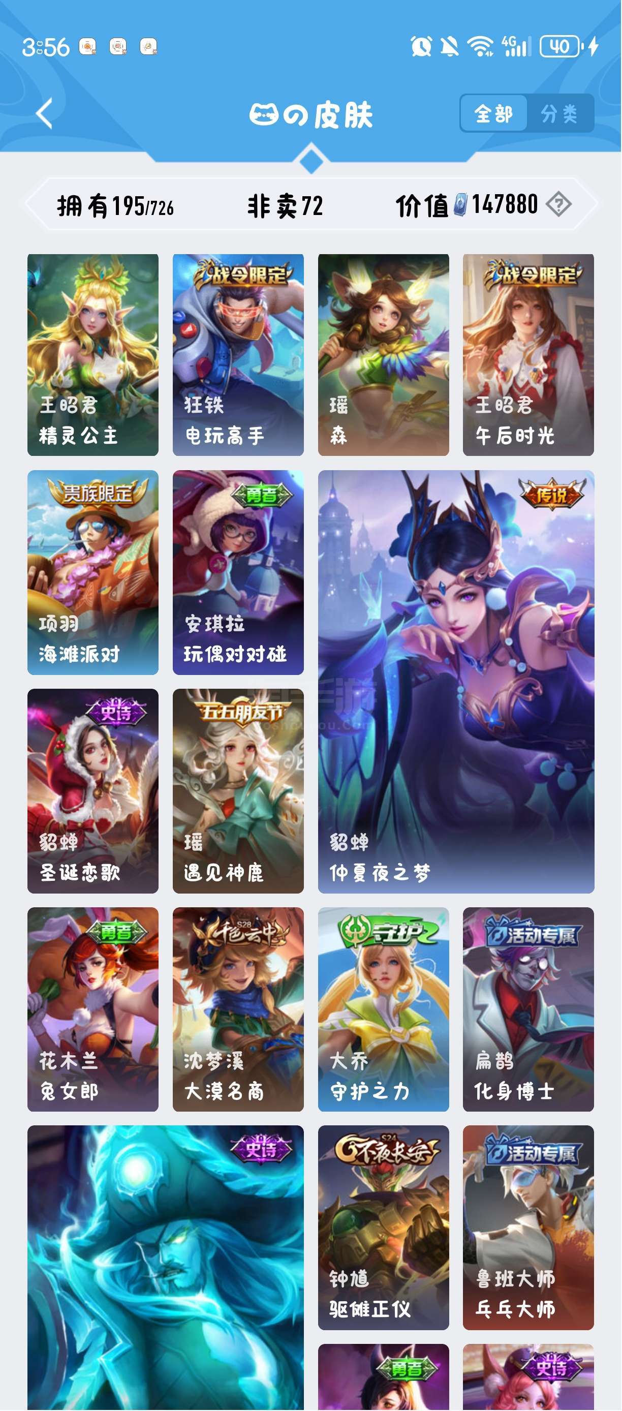 王者荣耀-安卓QQ-195个皮肤-无双1个-珍品传说1个-