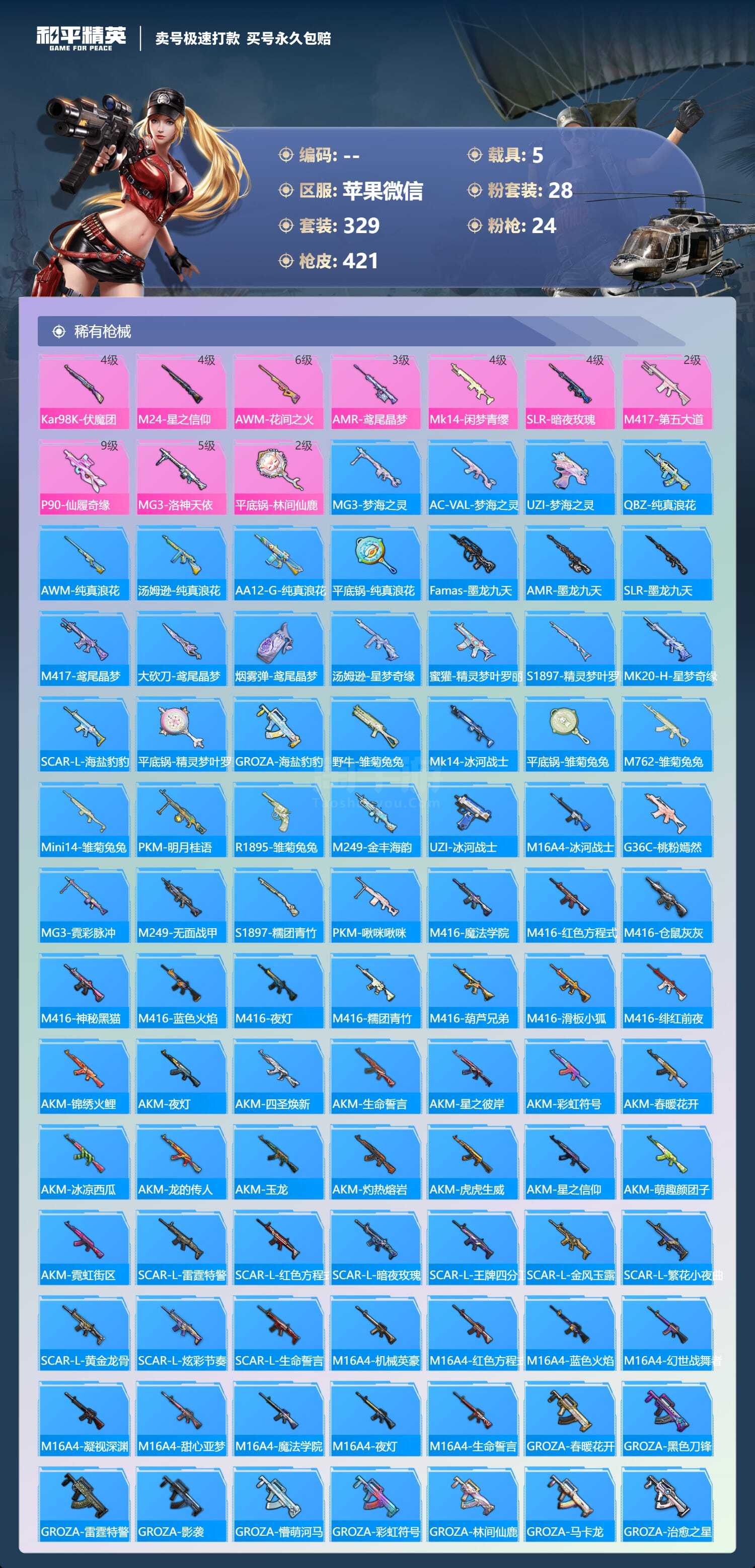 苹果微信-a3839/苹果微/-19王牌印记-28粉装-24特效枪-5载具-167184热力值-329套装-