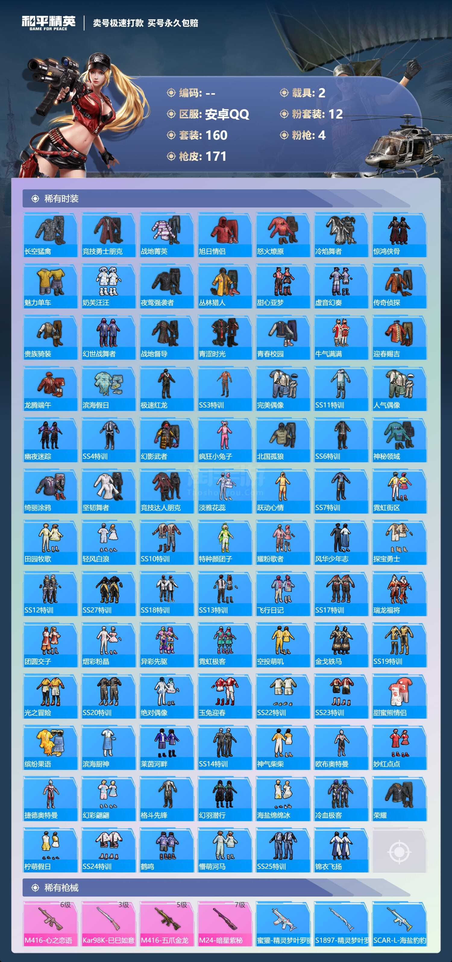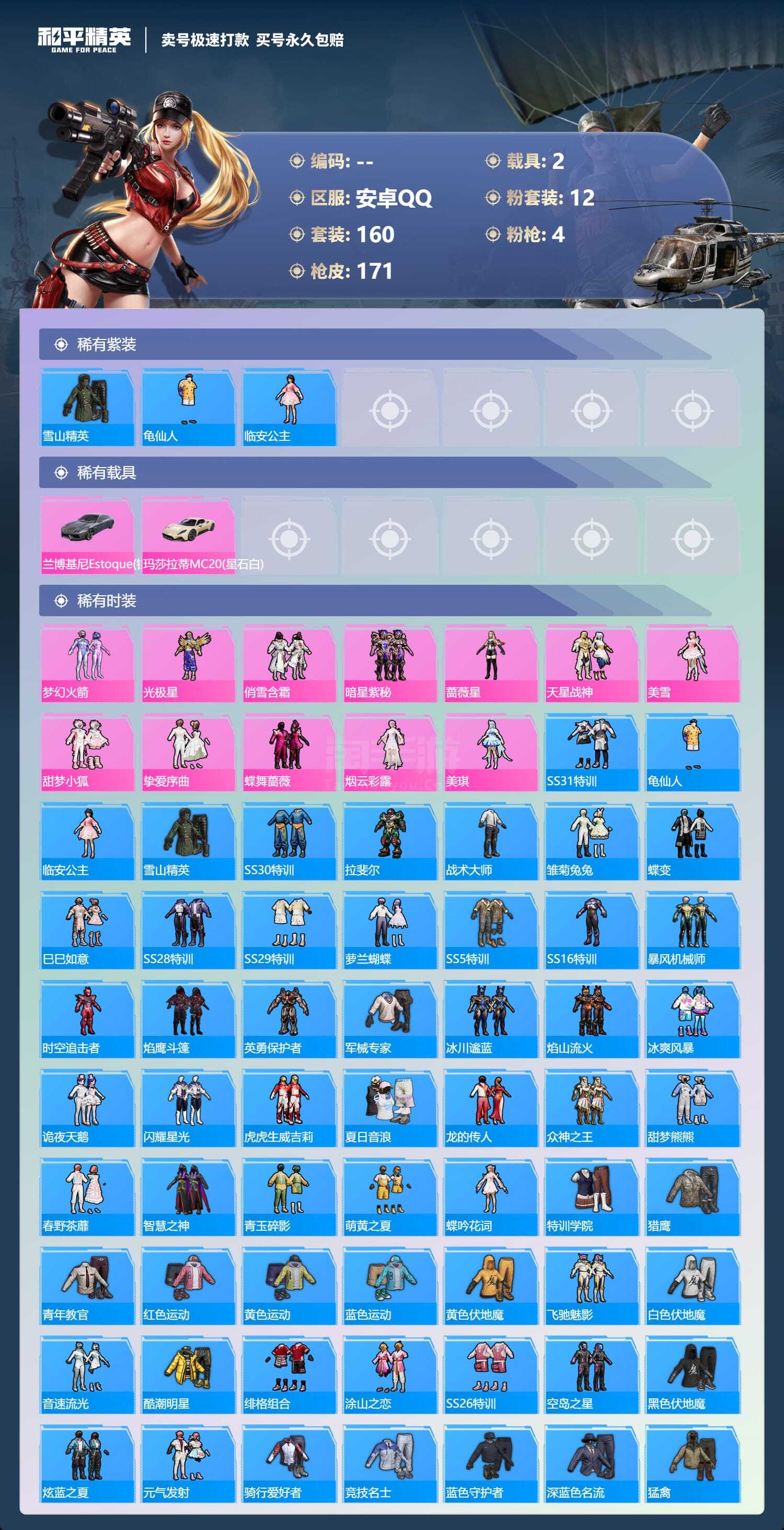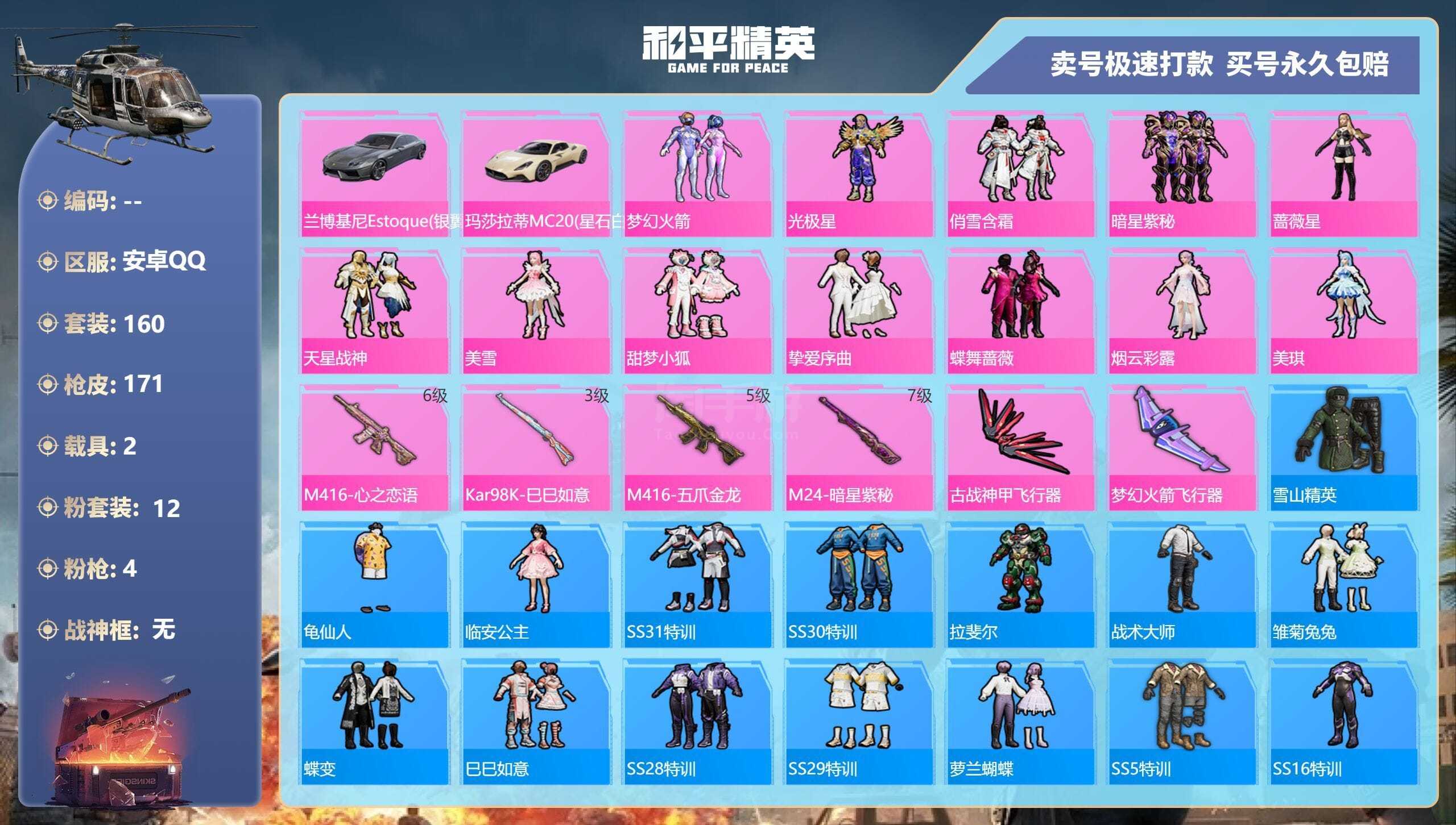 a3835/安卓QQ/-4王牌印记-12粉装-4特效枪-2载具-63158热力值-160套装-171