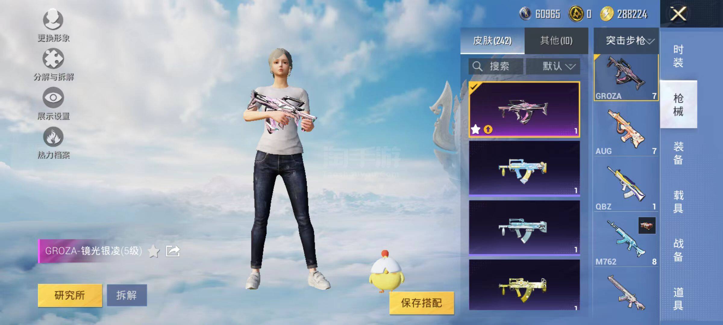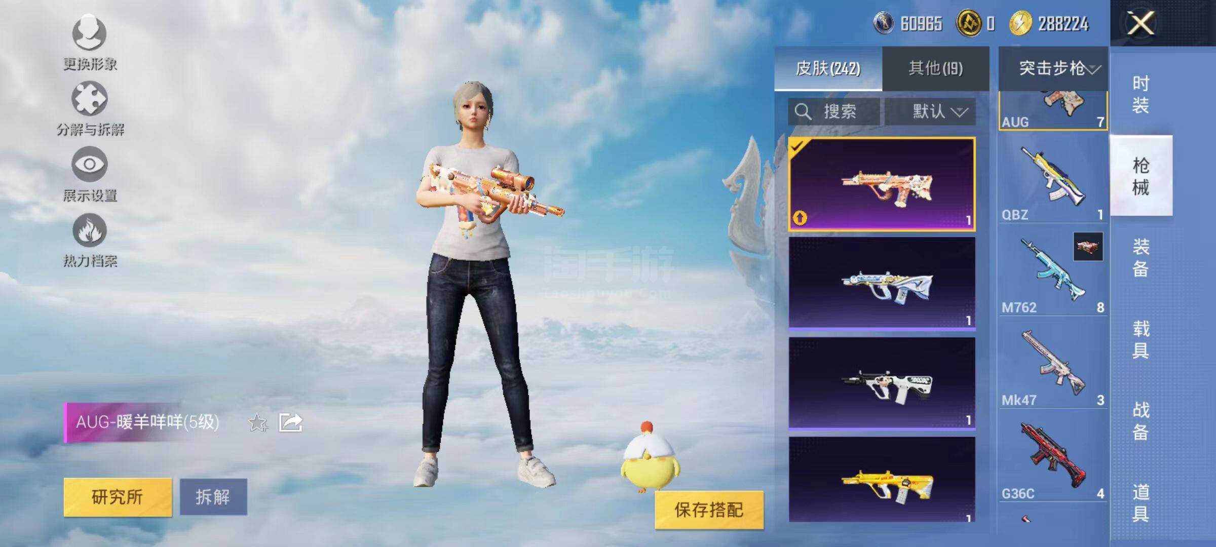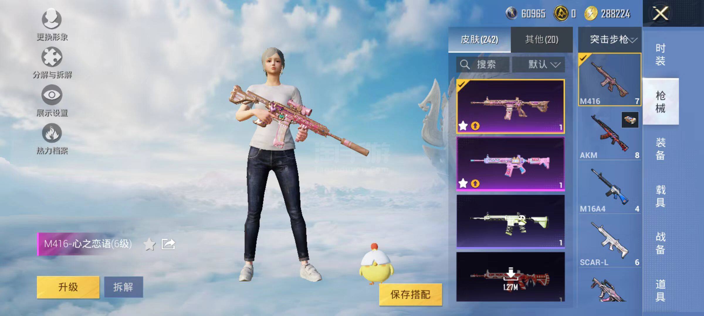 【特效枪等级】:SCAR-L-纯梦嫁纱(七级),M416-心之恋语(六级),M416-电玩时刻(五级),GROZA-镜光银凌(五级),AUG-暖羊咩咩(五级),Kar98K-巳巳如意(五级),Mk14-甜梦熊击(五级),SLR-暗夜玫瑰(四级),M249-绒雪飘舞(四级),DP-28-豹影疾