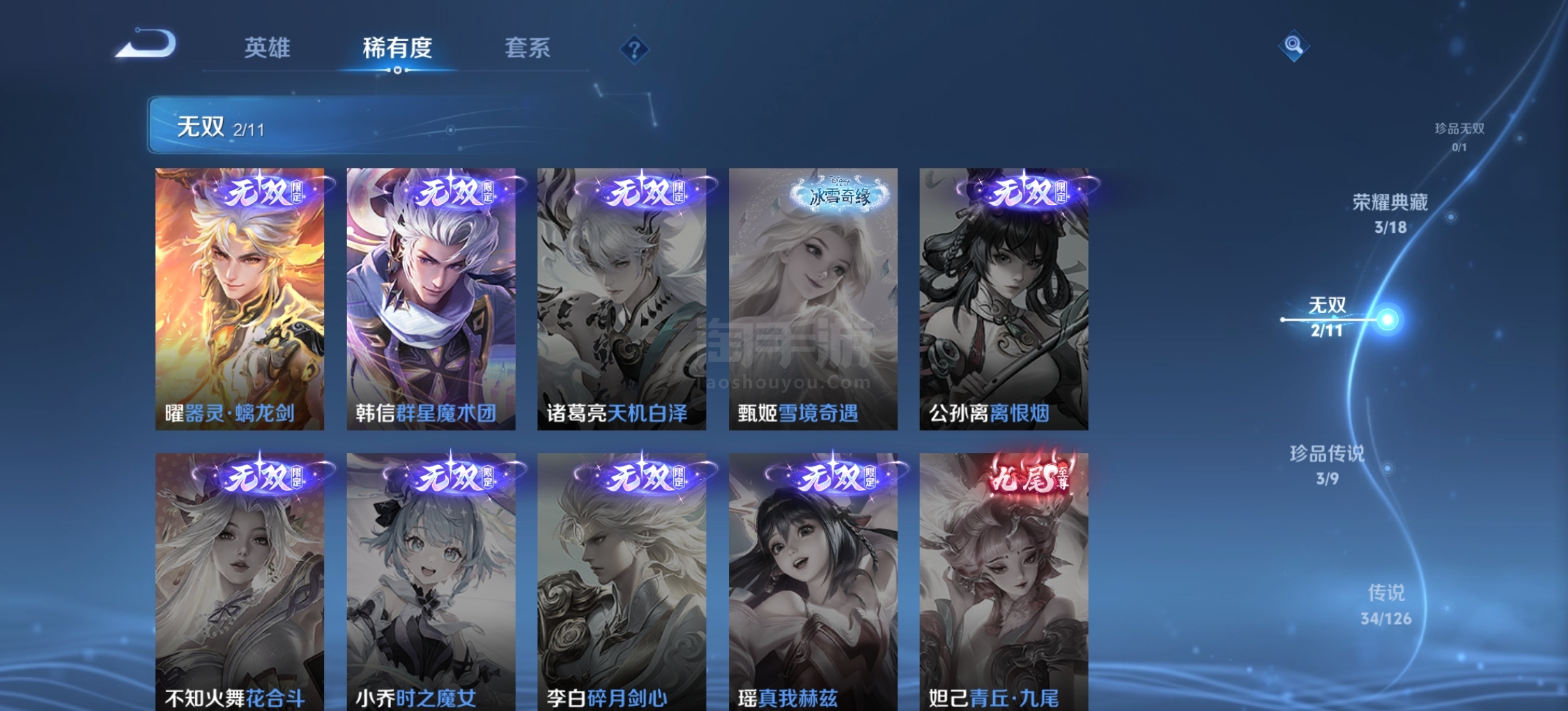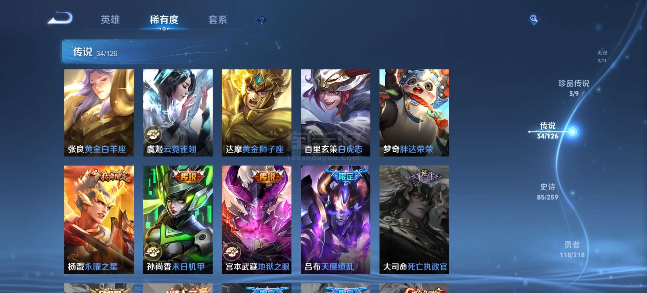 安卓qqv9-298皮125英雄-3典藏2无双3珍品传说-34传说-详情看图!