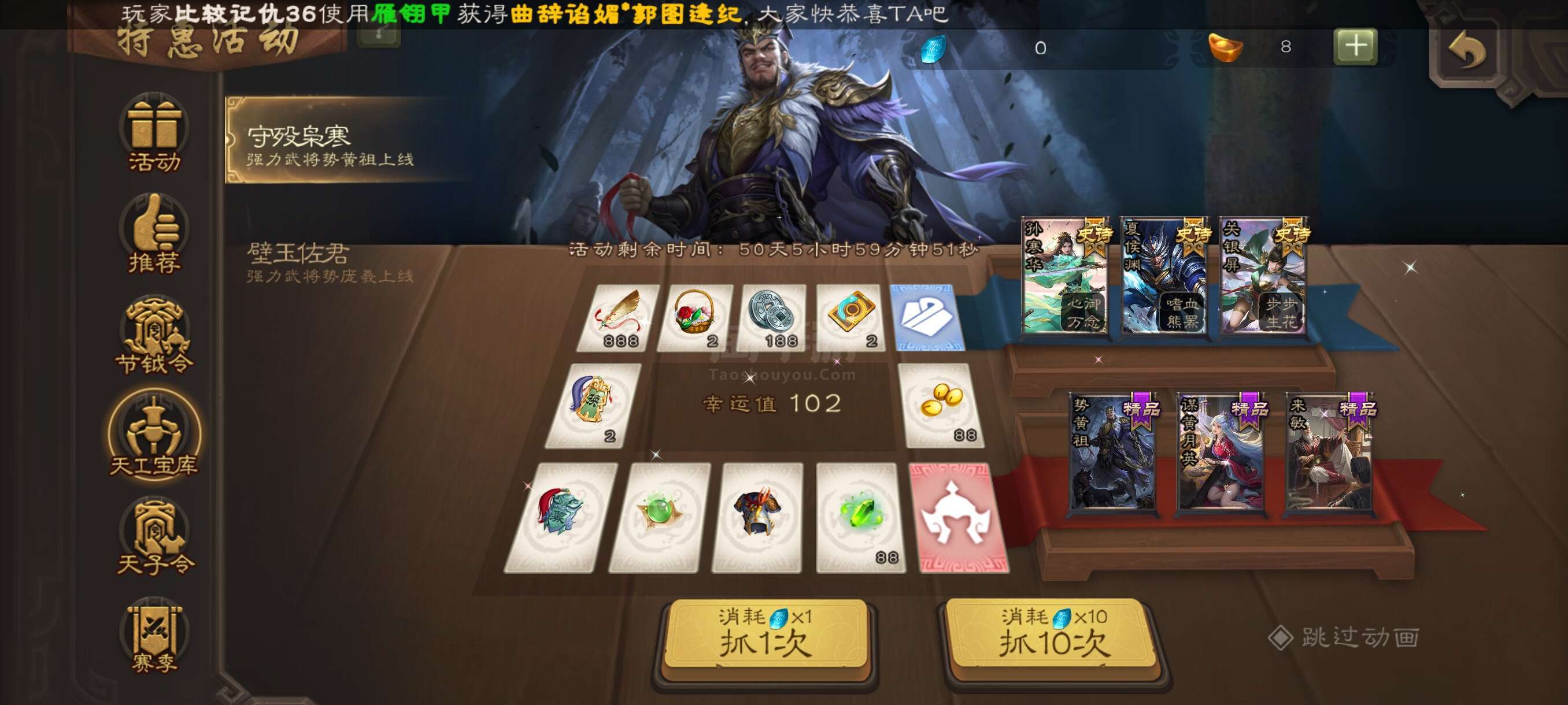 安卓官方-精品有友徐庶+谋郭嘉嘉+闫象,势陈到 材料有1w将魂,4w羽毛,金票和豆子加起来共10w全网最低一体号便宜卖了