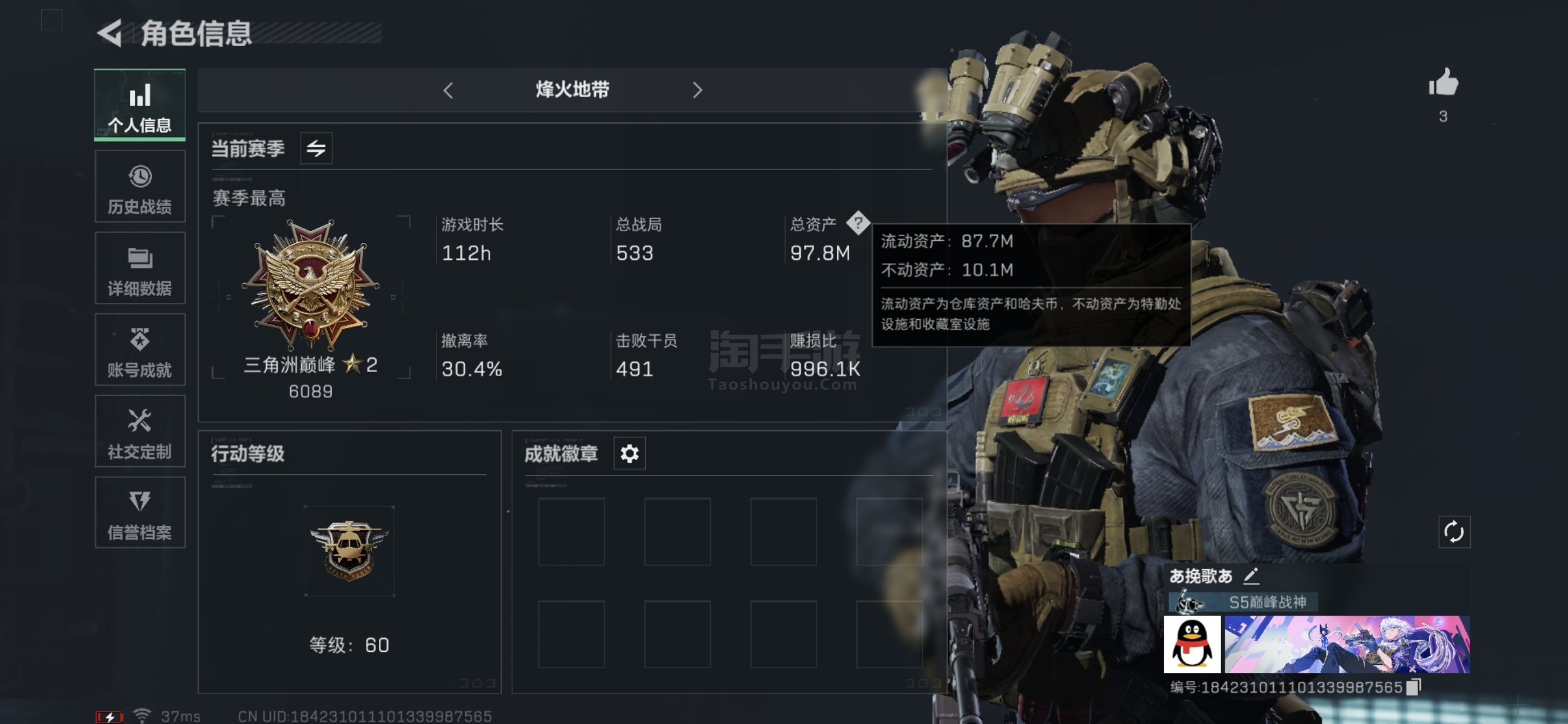 XX926,总资产97m,段位三角洲巅峰,等级:60,三角券573,黑鹰,无名-夜鹰(S4),AK-12突击步枪-夜鹰,复合弓-黑-天际线,CAR-15突击步枪-阿米娅,SMG-45冲锋枪-骑士,三角券,非洲之心,三端互通Q区实名:可二次
