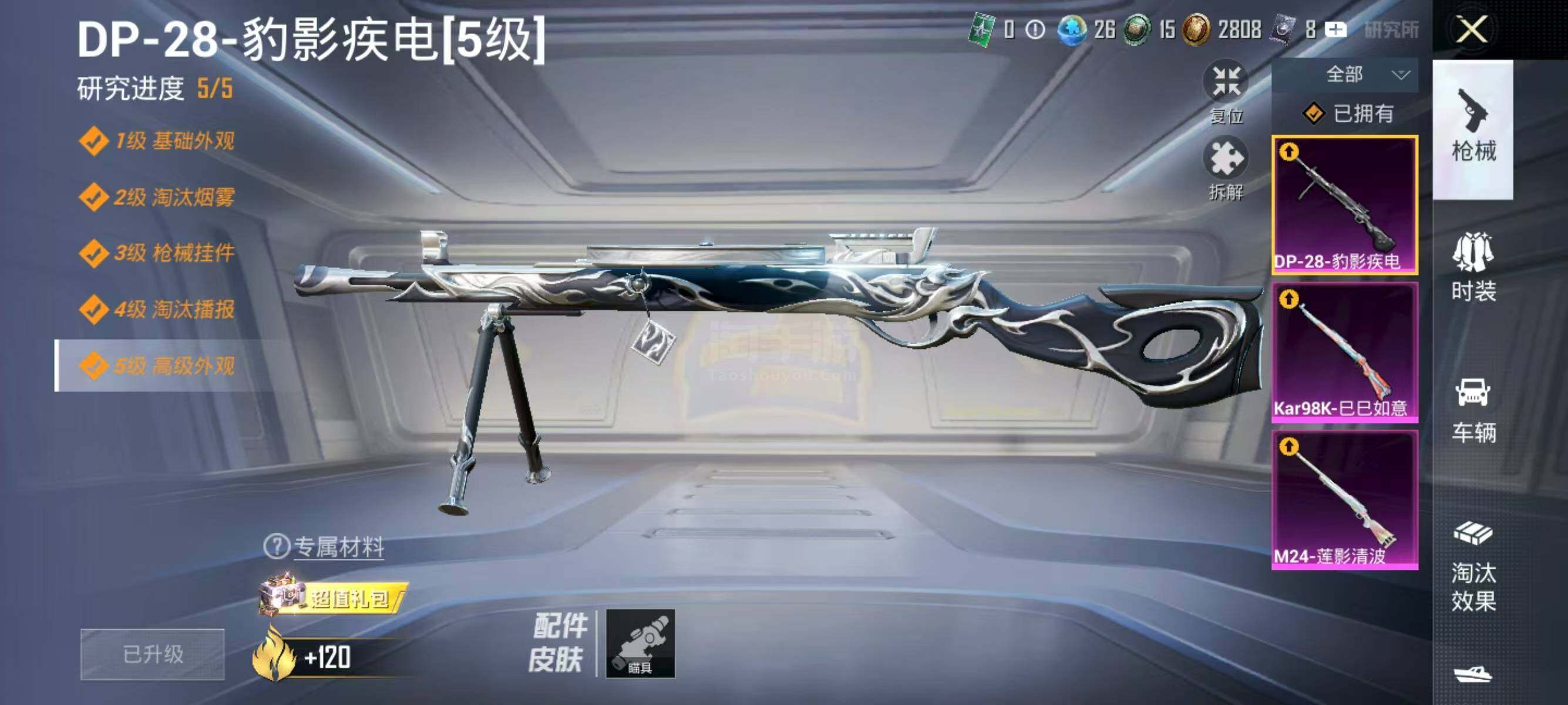 【特效枪等级】:Kar98K-巳巳如意(五级),M24-莲影清波(二级),DP-28-豹影疾电(五级)