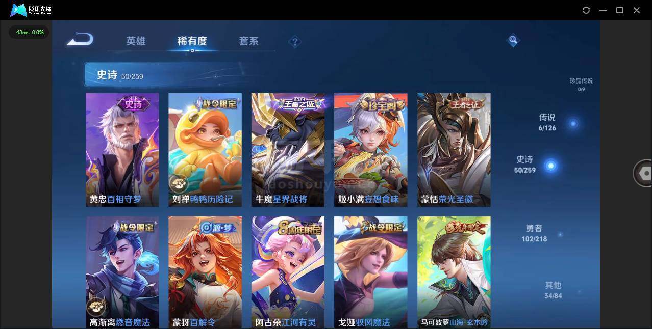 实名: 可修改 贵族等级: V6 英雄数: 124 皮肤数: 192 传说皮: