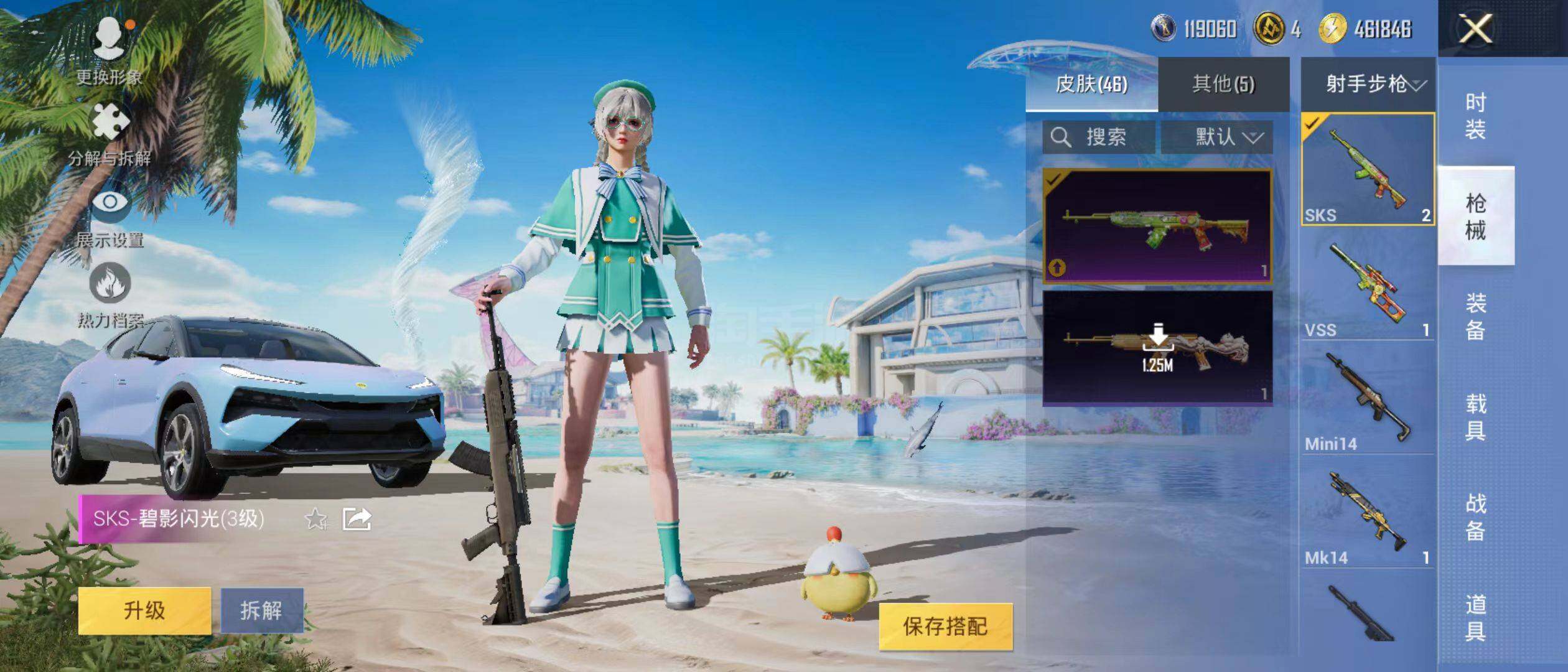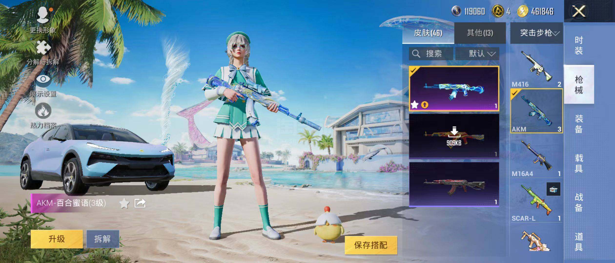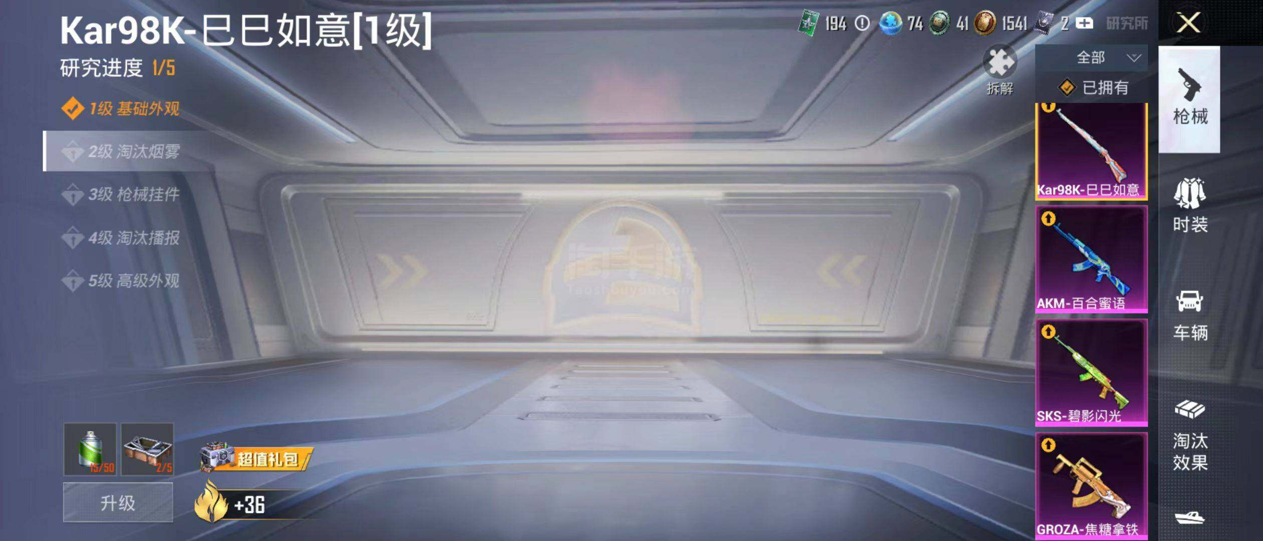 【特效枪等级】:AKM-百合蜜语(三级),GROZA-焦糖拿铁(七级),Kar98K-巳巳如意(一级),SKS-碧影闪光(三级)