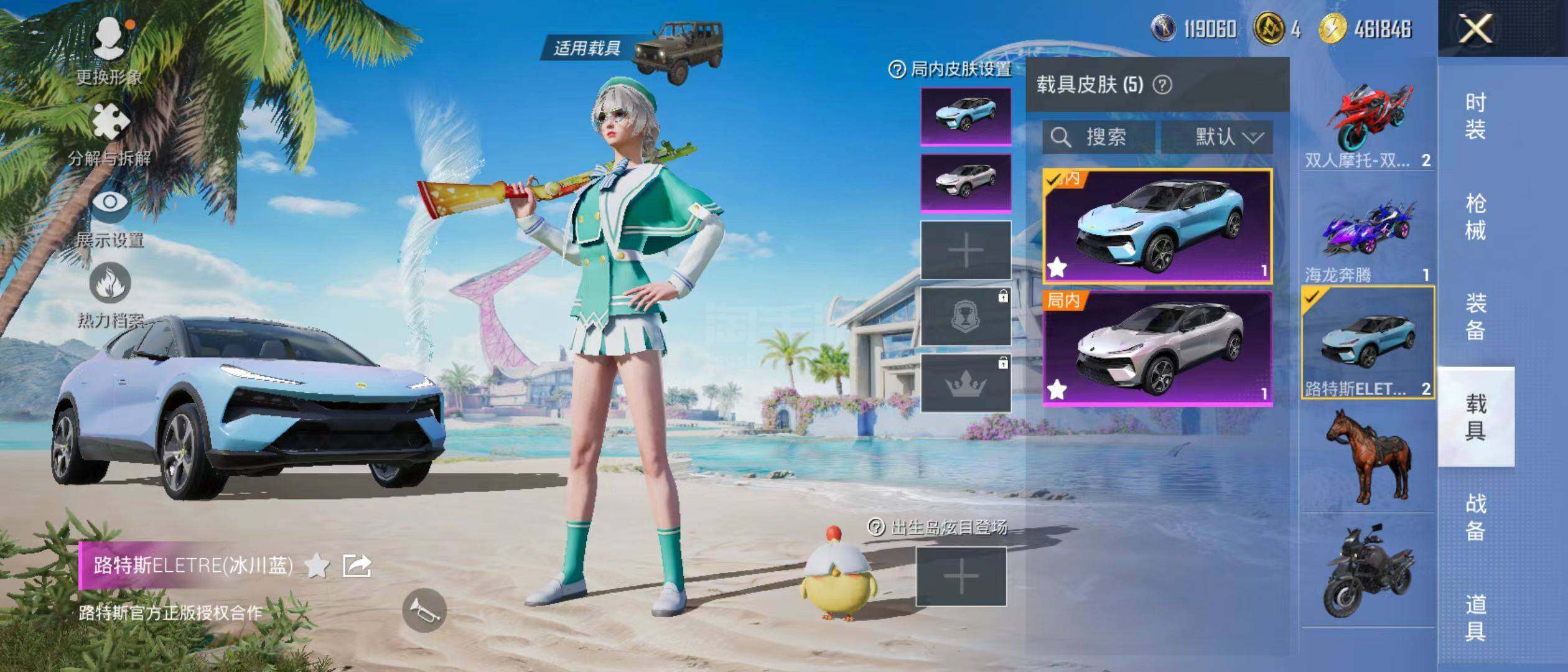 【稀有载具】:路特斯ELETRE(冰川蓝),路特斯ELETRE(花绽灰),海龙奔腾,双人摩托-双刃魅影(红),极速兔兔车