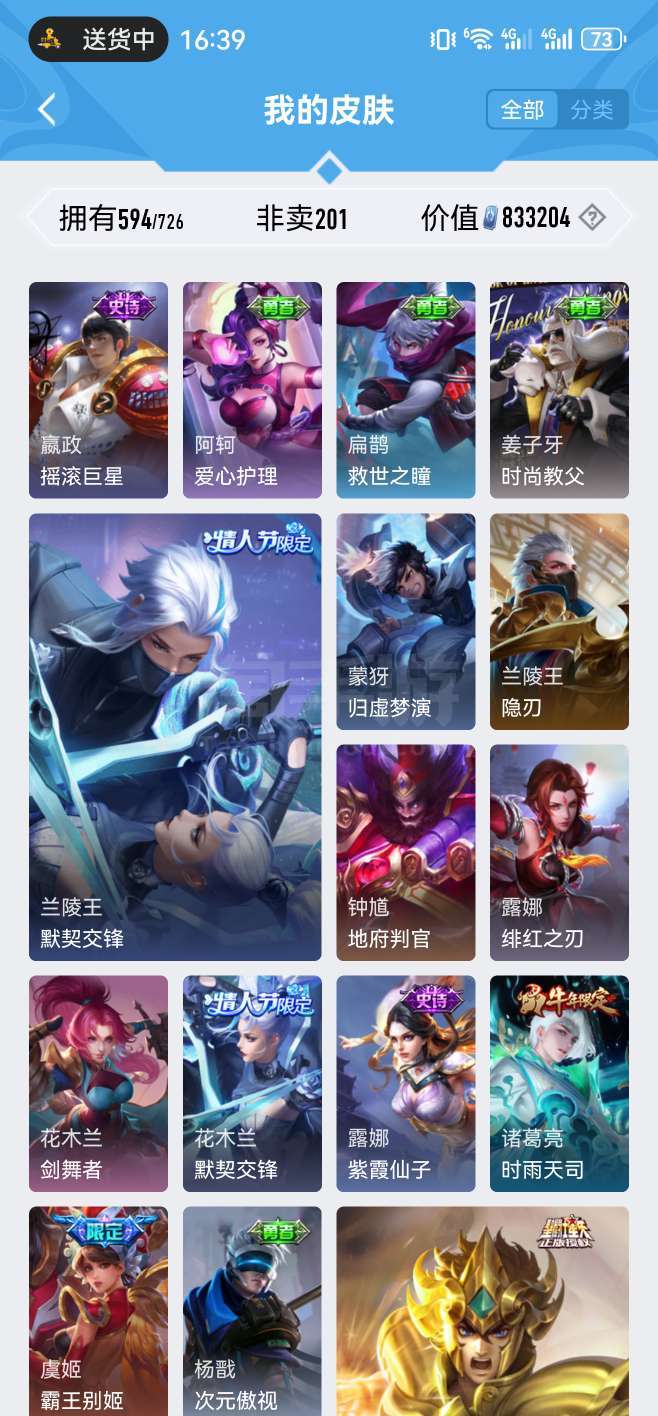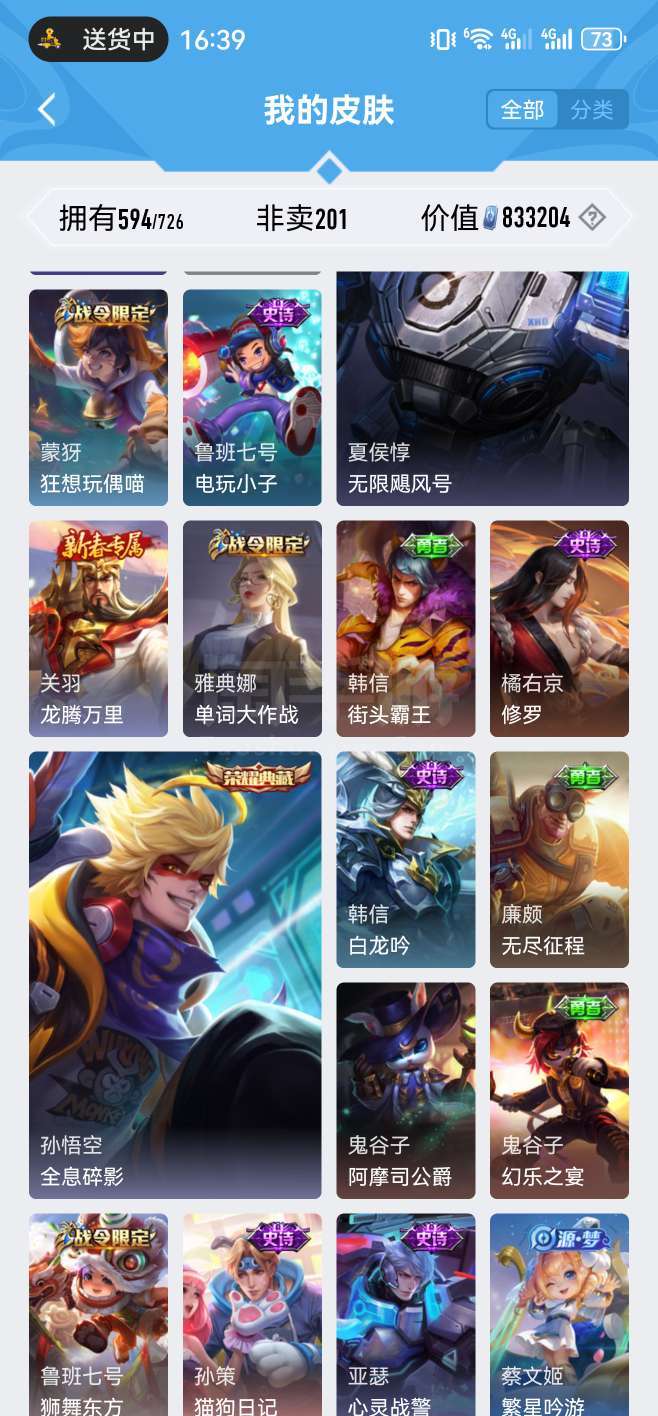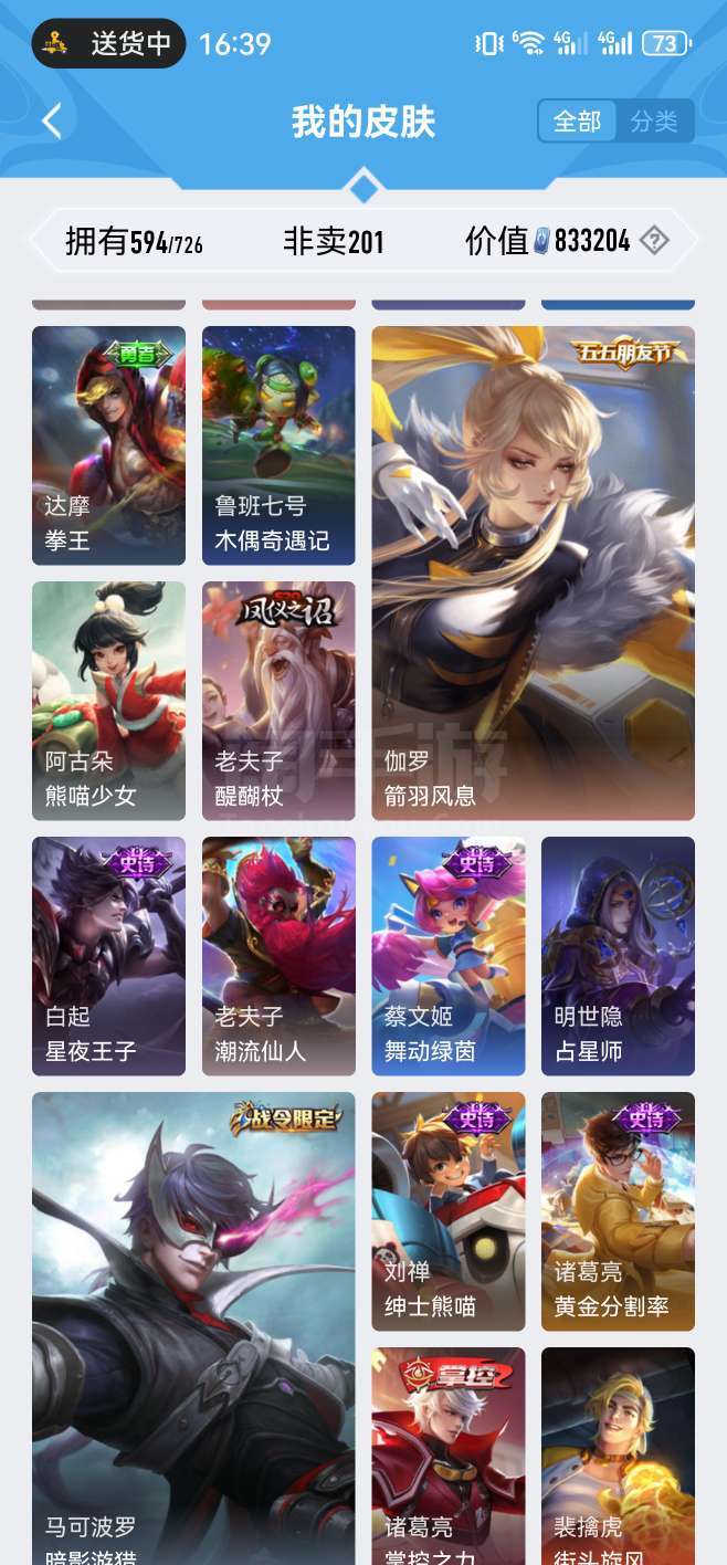 珍品无双1 珍品传说6 无双7 典藏18 传说95 史诗199 限定251 英雄126 皮肤594
