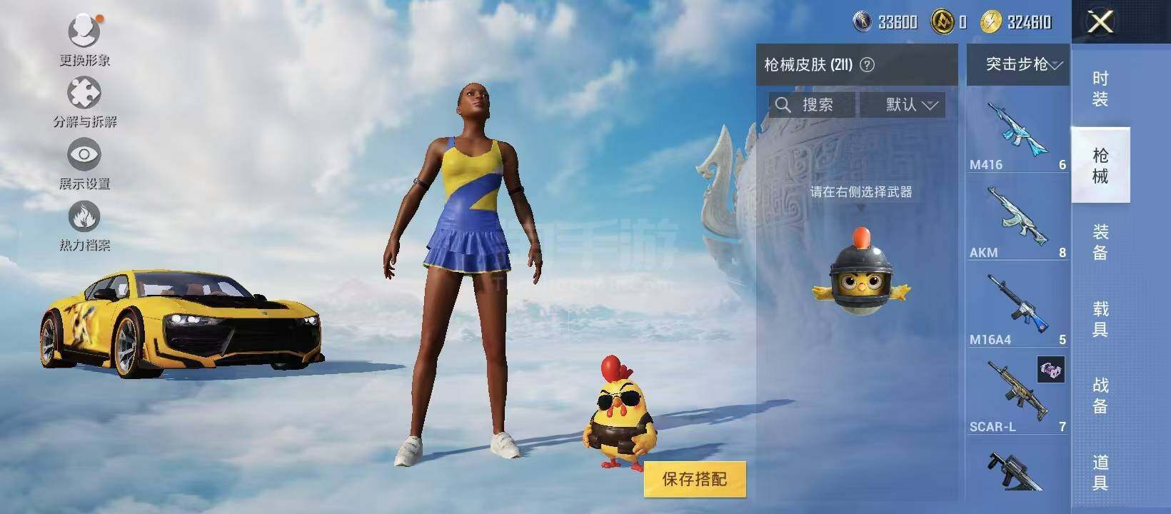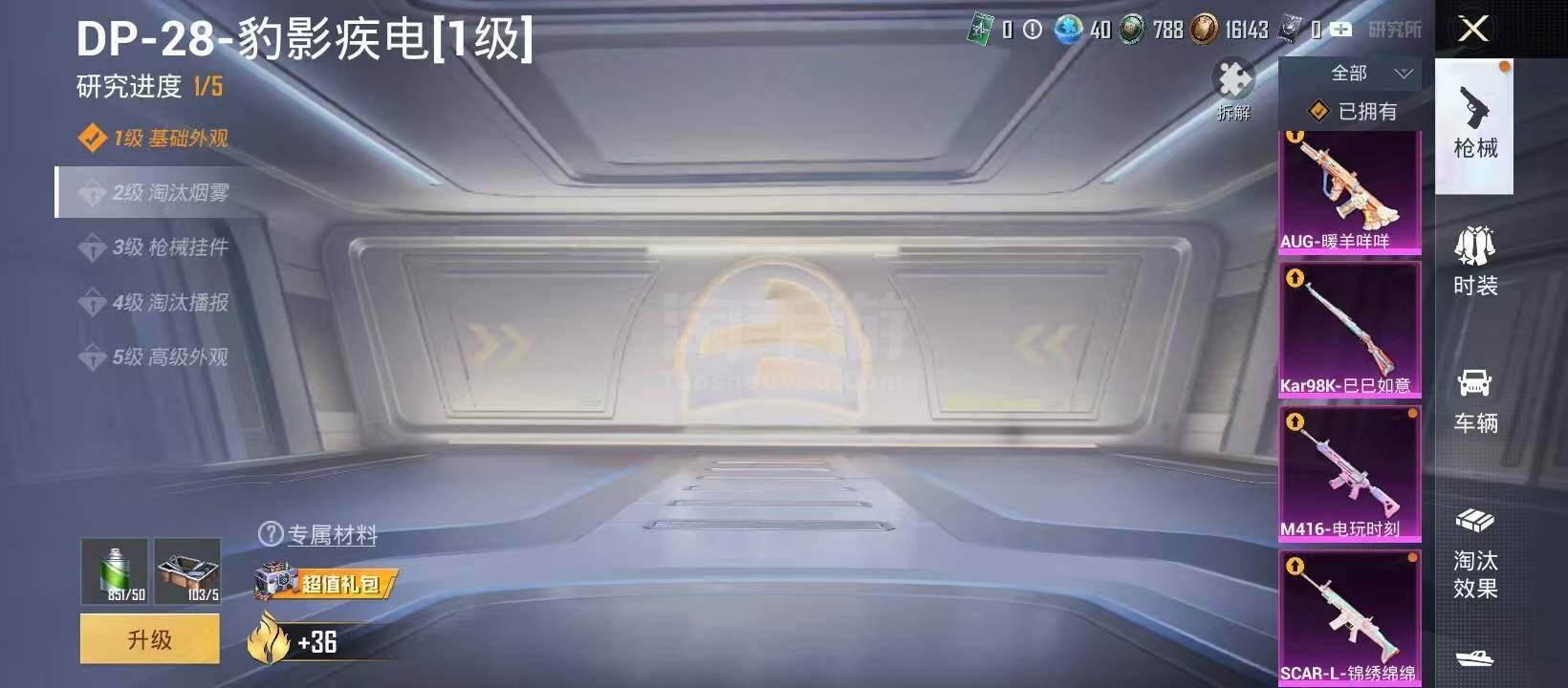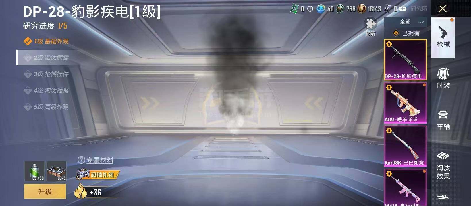 【特效枪等级】:SCAR-L-锦绣绵绵(一级),M416-电玩时刻(一级),AUG-暖羊咩咩(一级),Kar98K-巳巳如意(一级),DP-28-豹影疾电(一级)