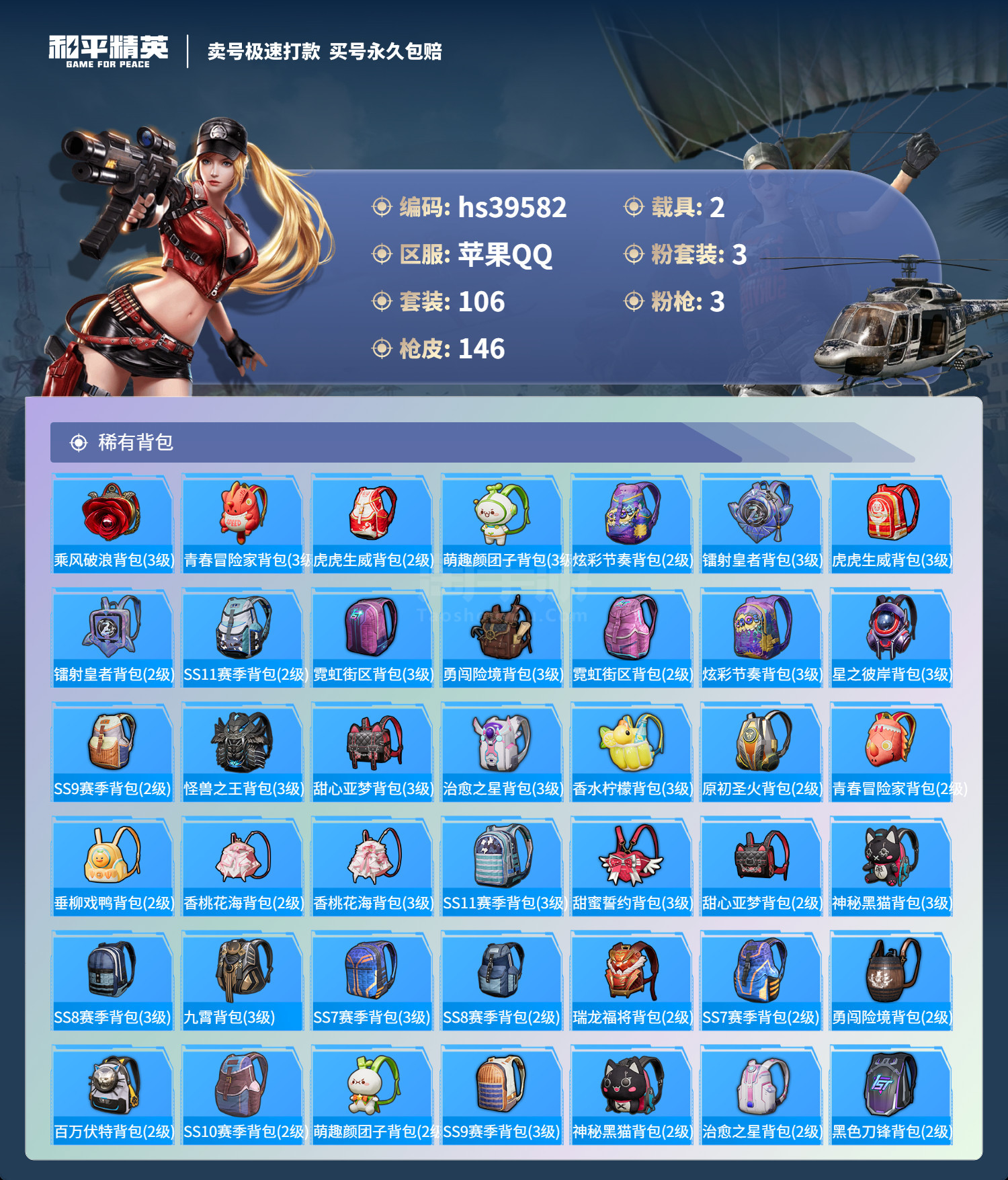 hs39582 苹果手Q-9王牌印记-3粉装-3特效枪-2载具-47335热力值-106套装-146