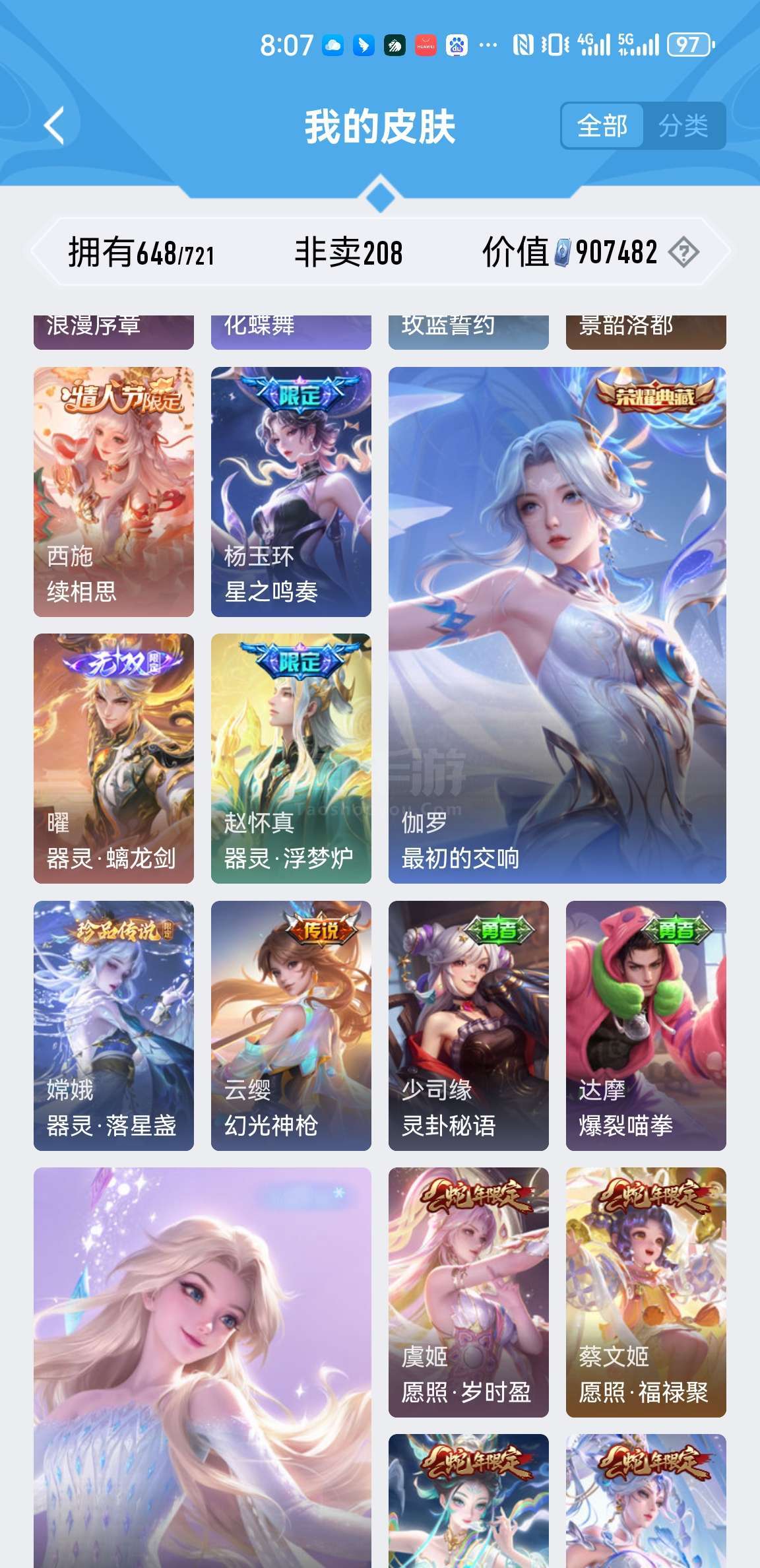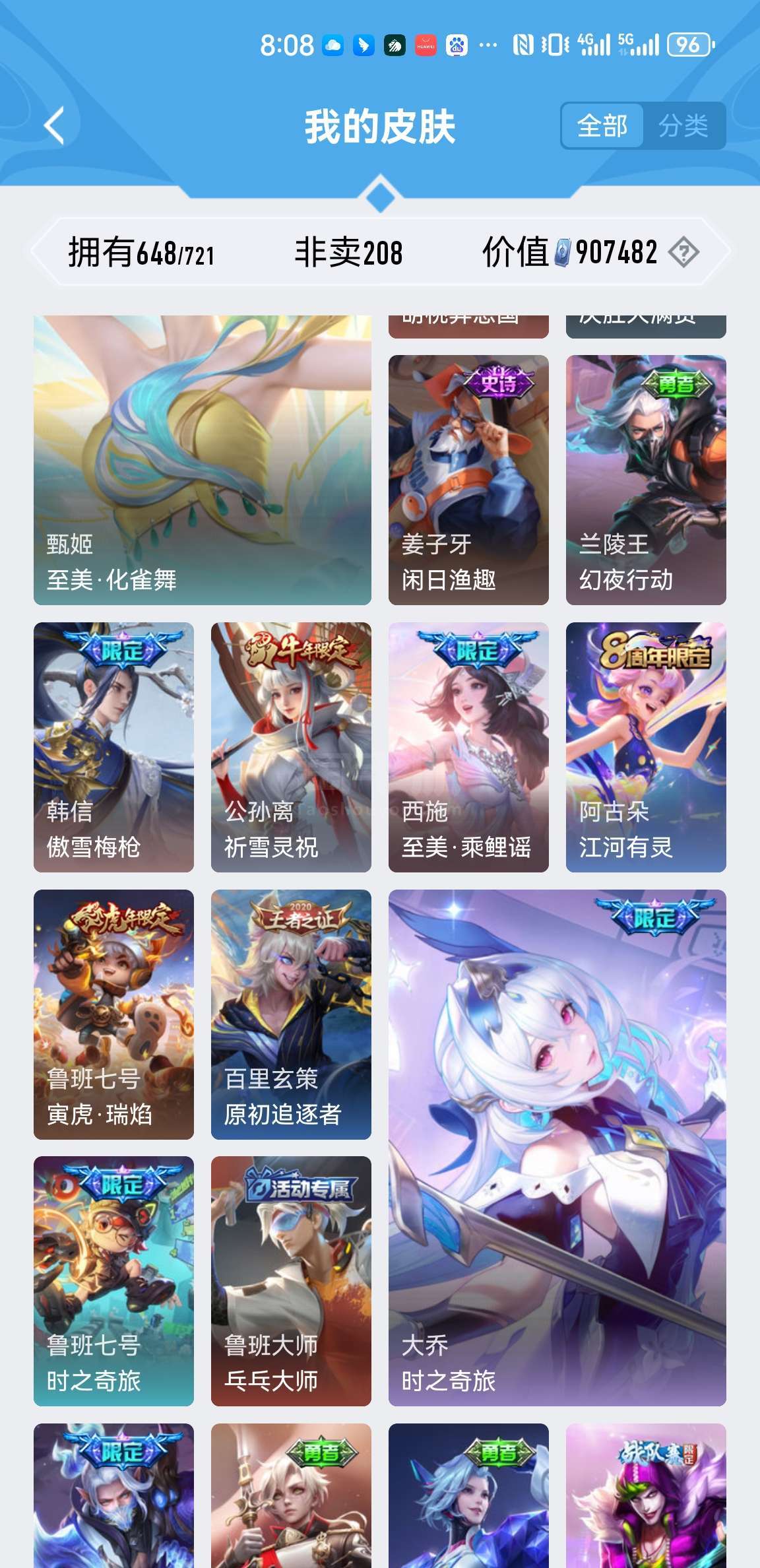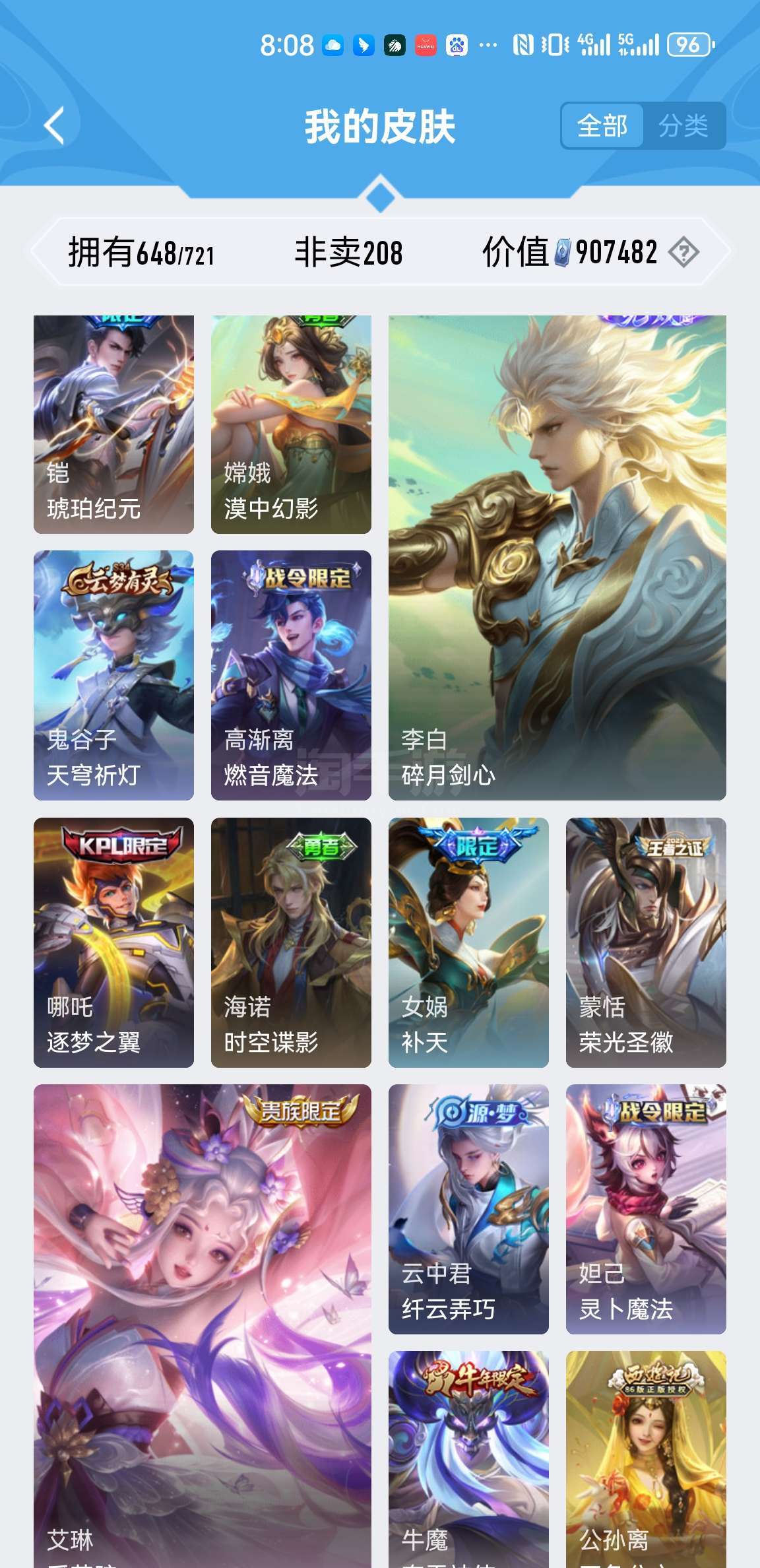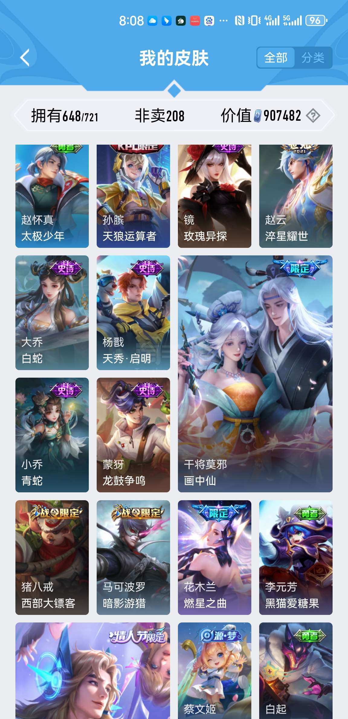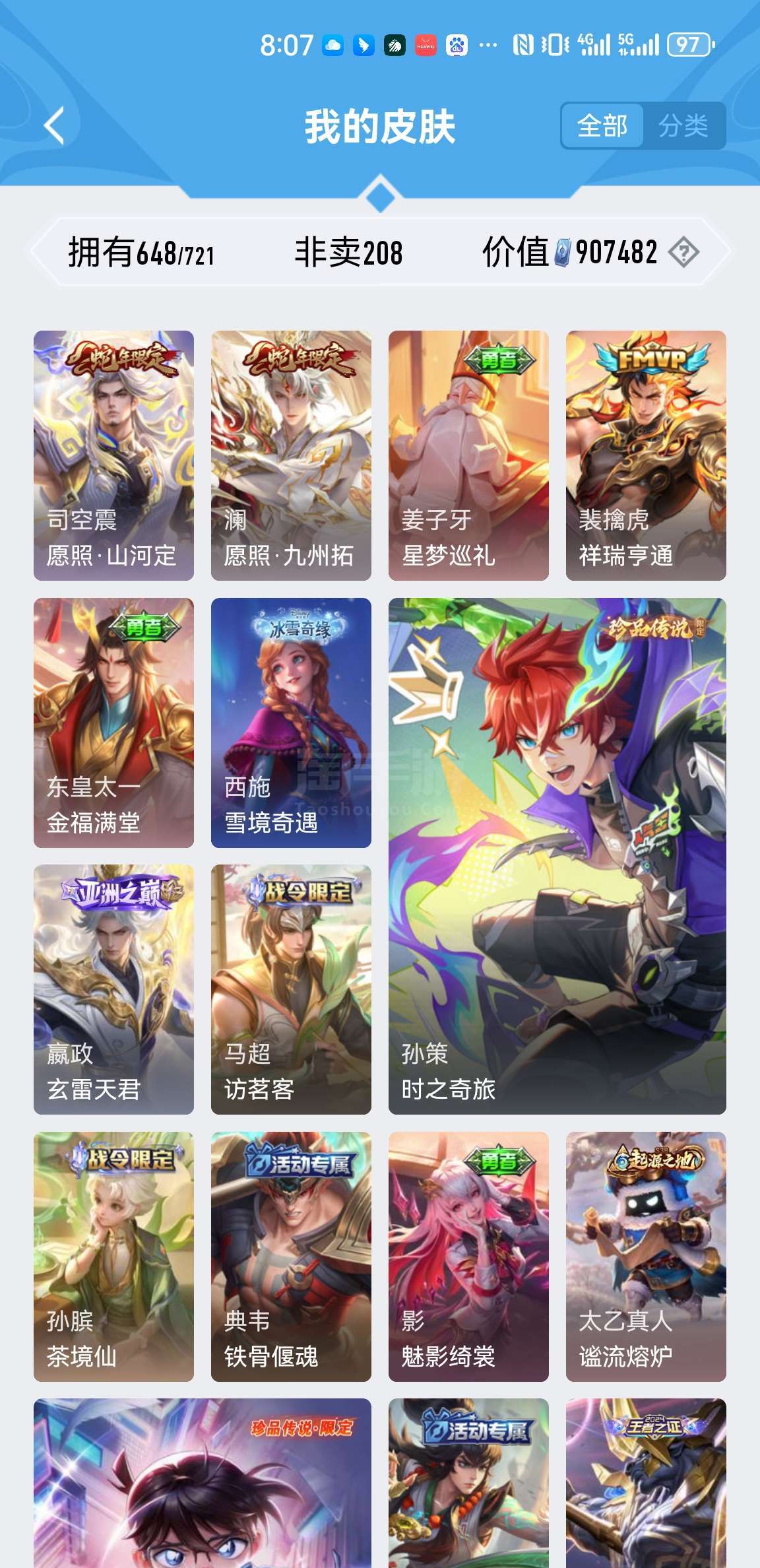 满英雄皮肤648个小兵皮肤两个。