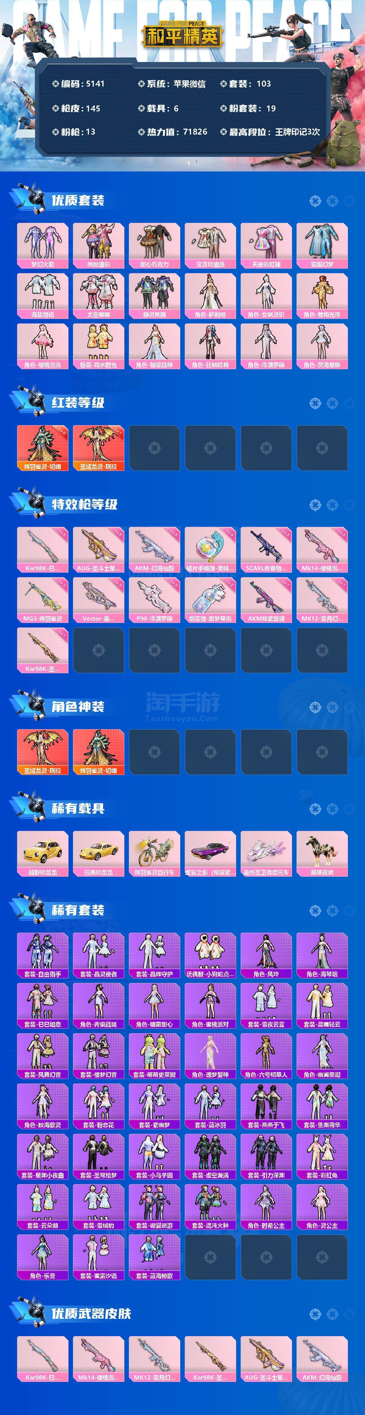 和平精英【苹果微信】【5141】19粉装-13特效枪-6载具-71826热力值-3印记-103套装