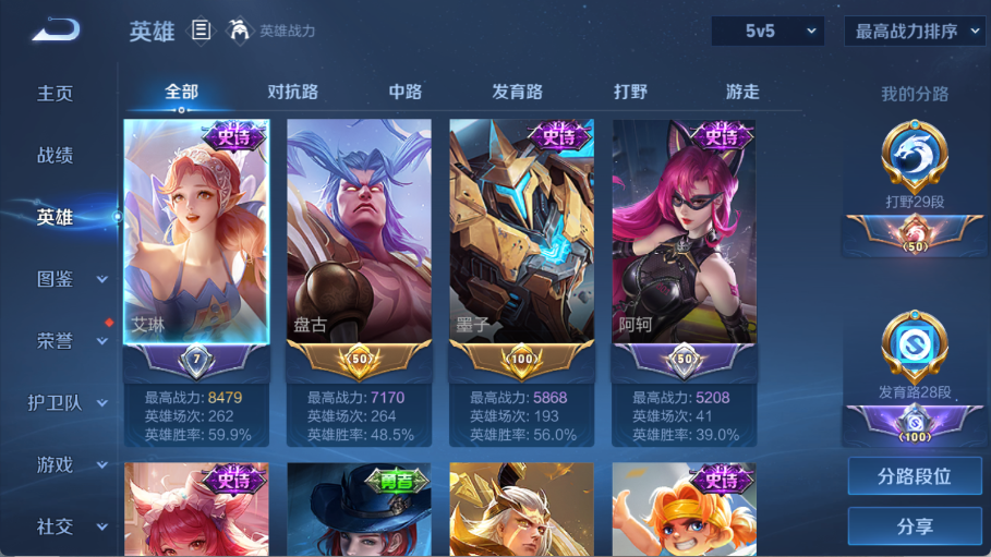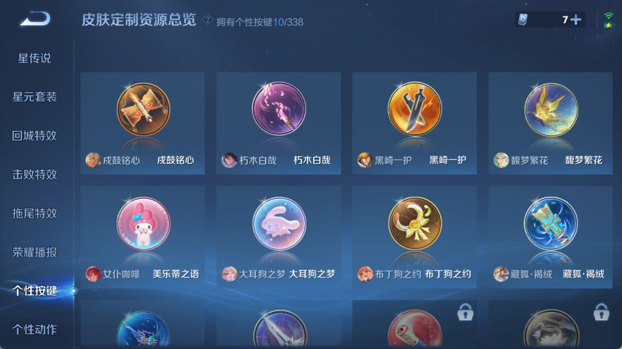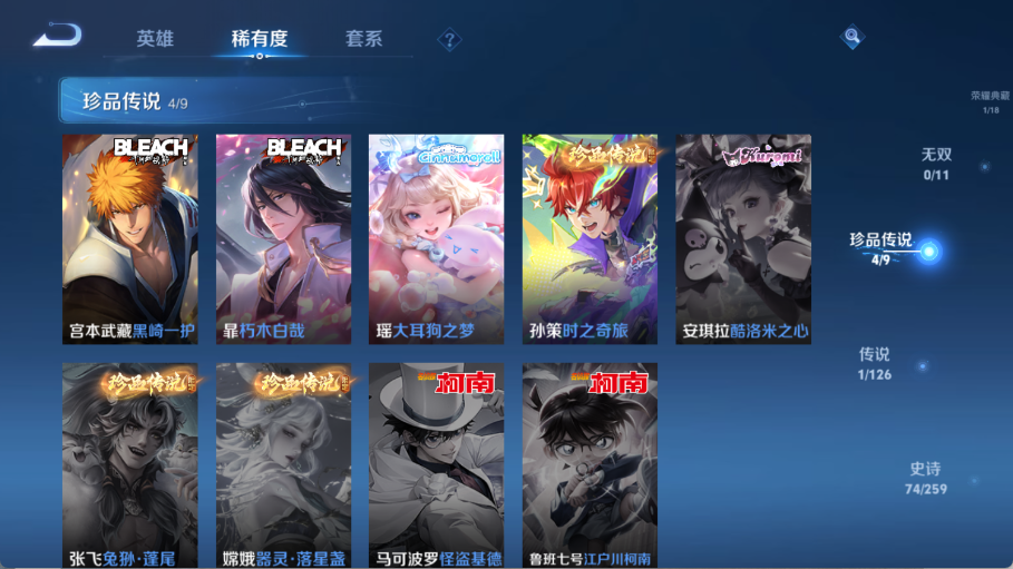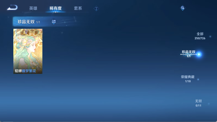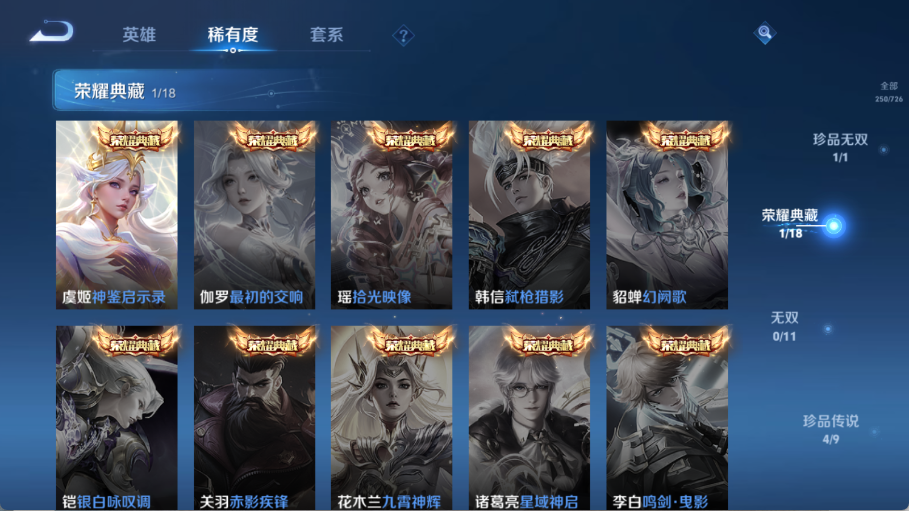 250皮 贵族7级 1珍品无双 1典藏 4珍品传说 1传说 74史诗 10个性按键