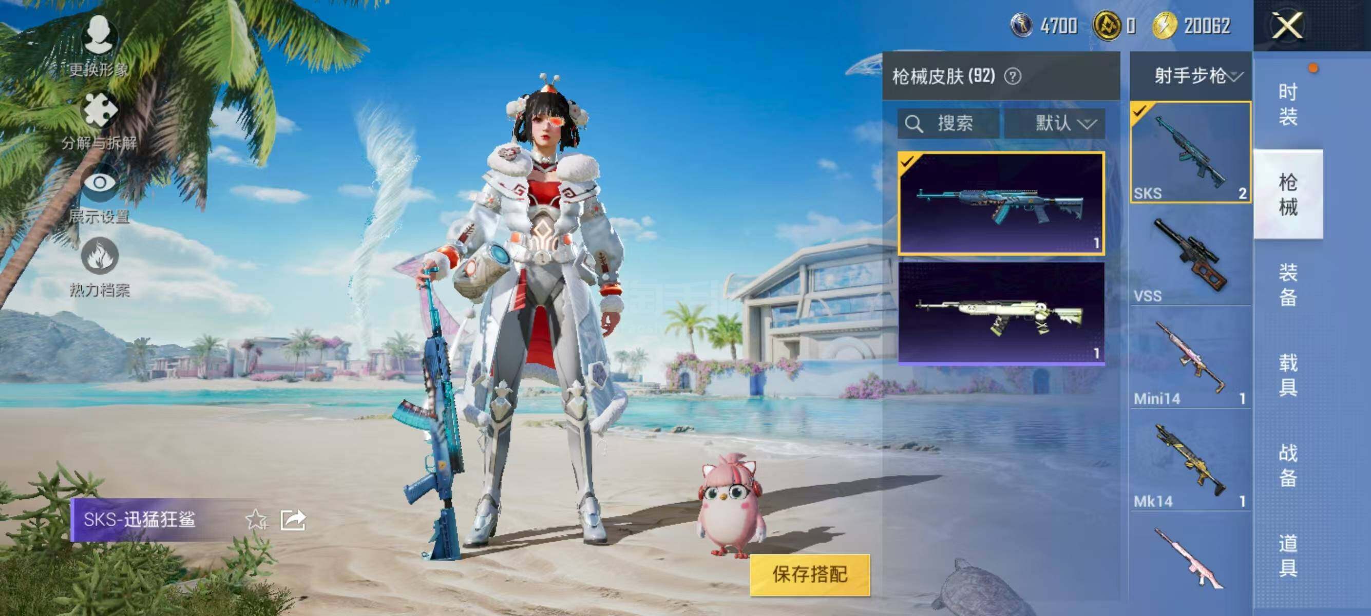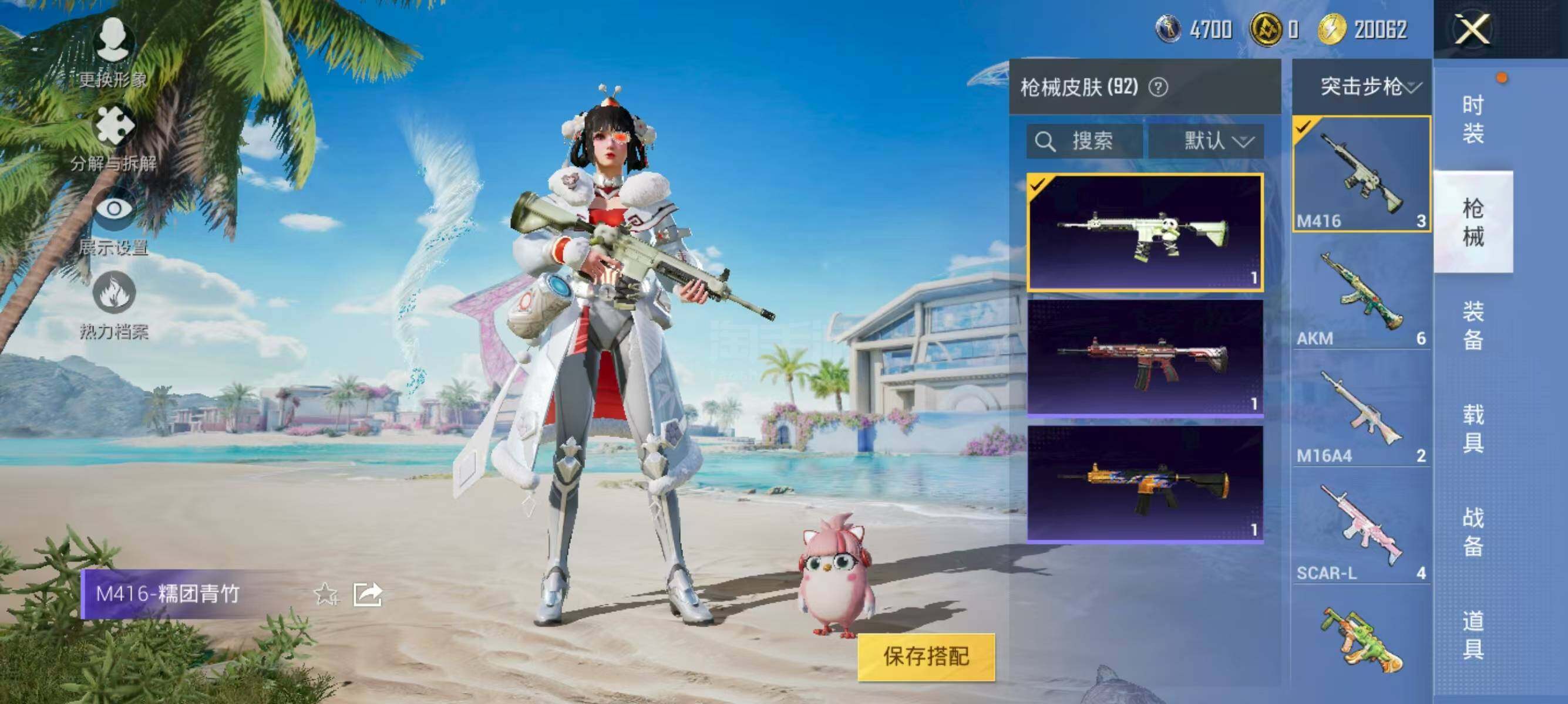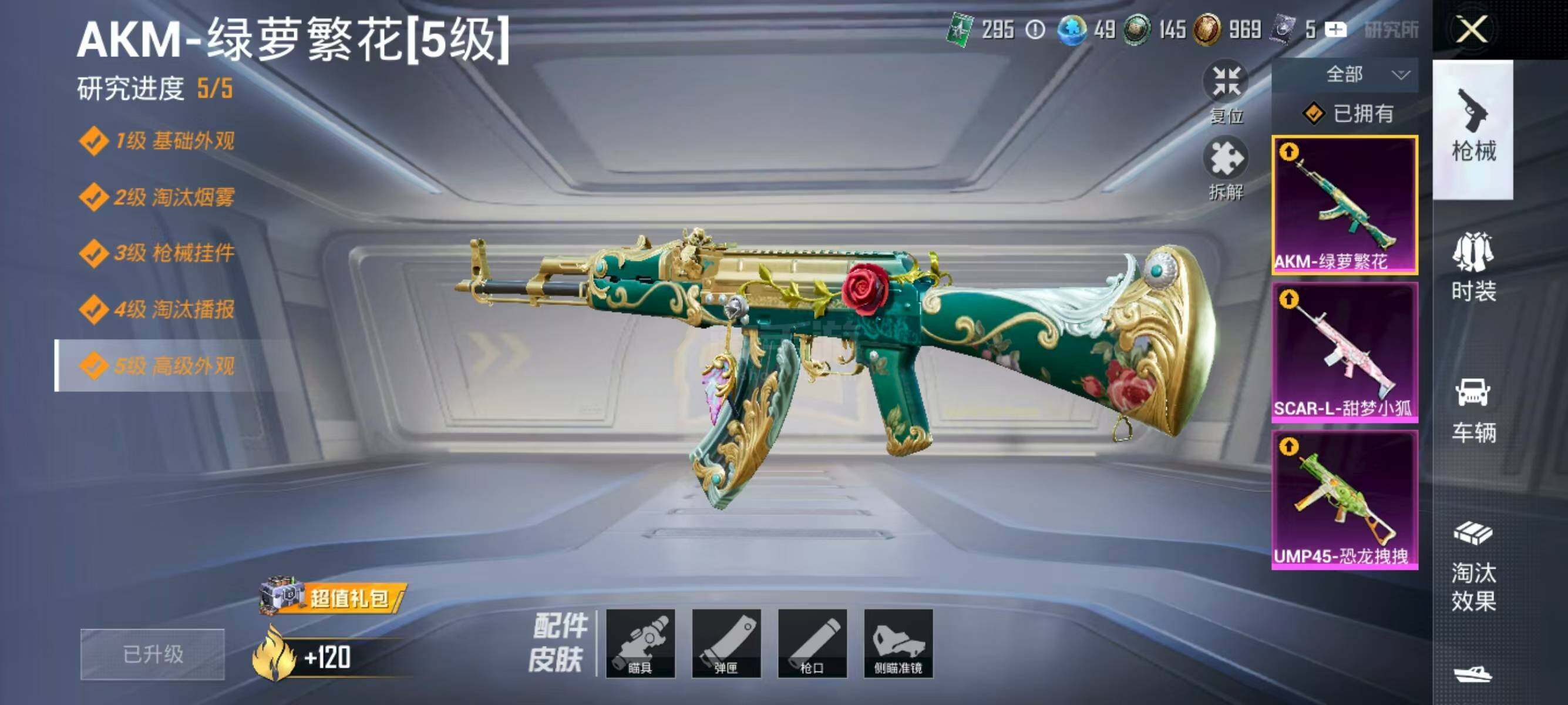 【特效枪等级】:AKM-绿萝繁花(五级),SCAR-L-甜梦小狐(四级),UMP45-恐龙拽拽(三级)