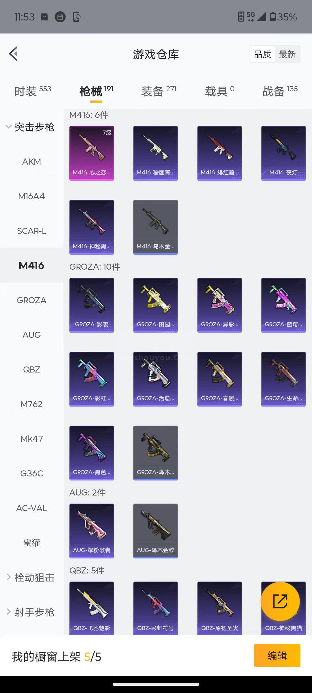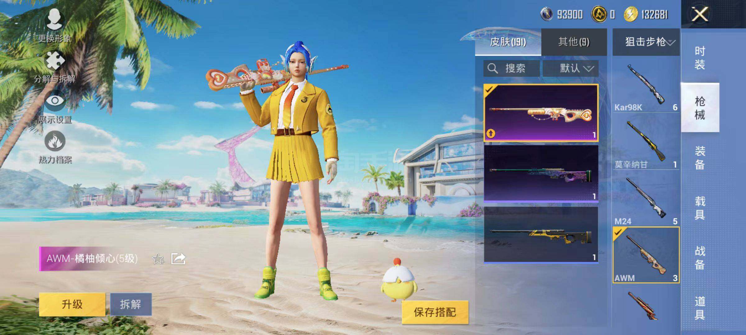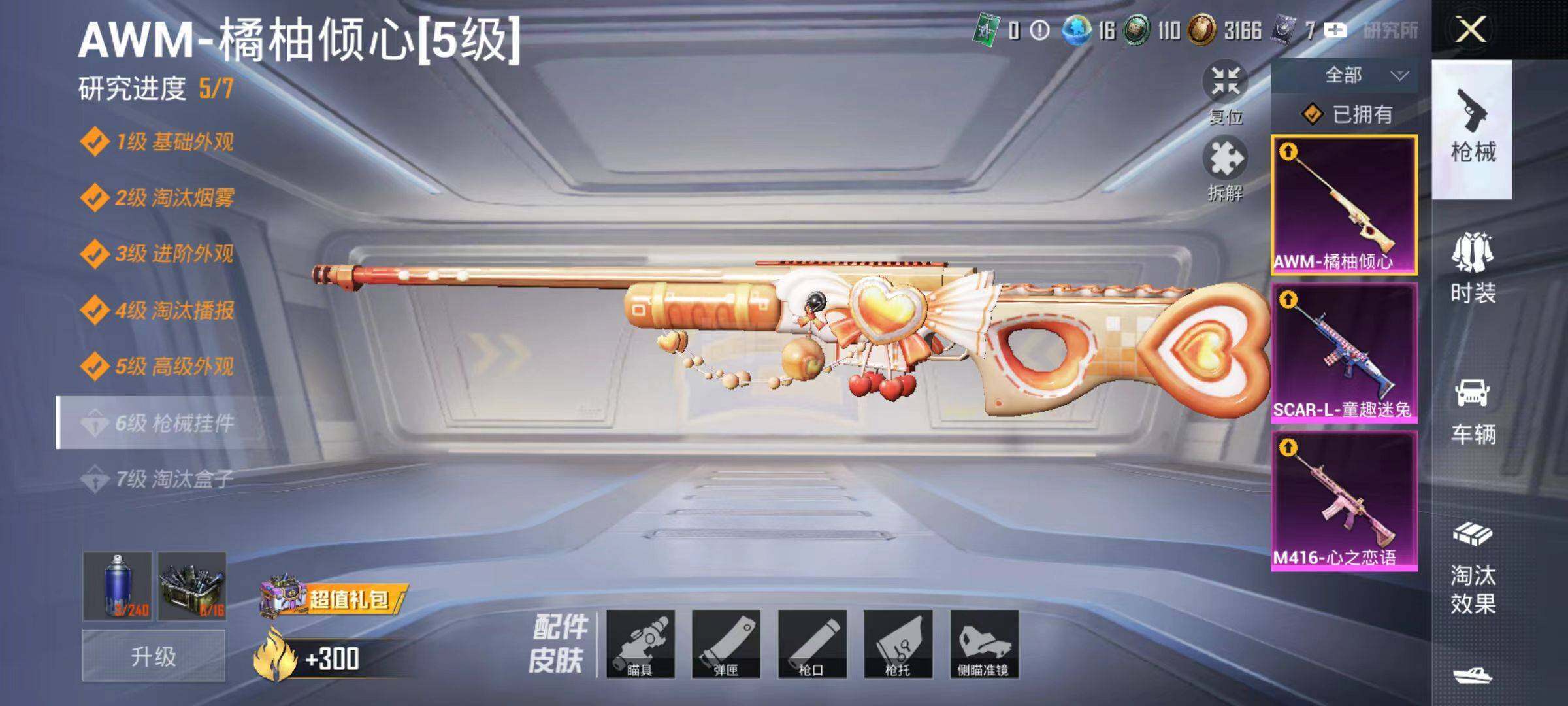 【特效枪等级】:SCAR-L-童趣迷兔(五级),M416-心之恋语(七级),AWM-橘柚倾心(五级)