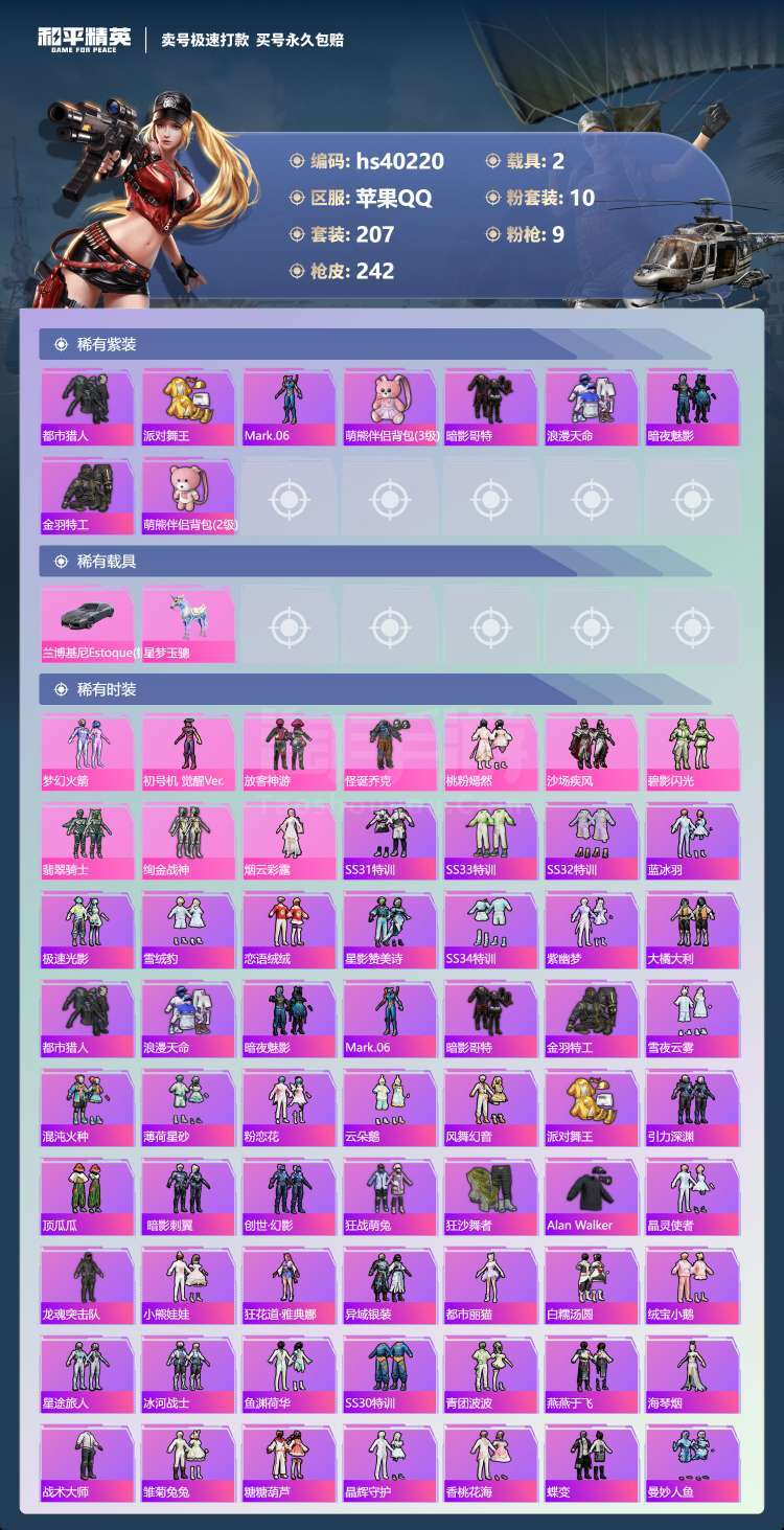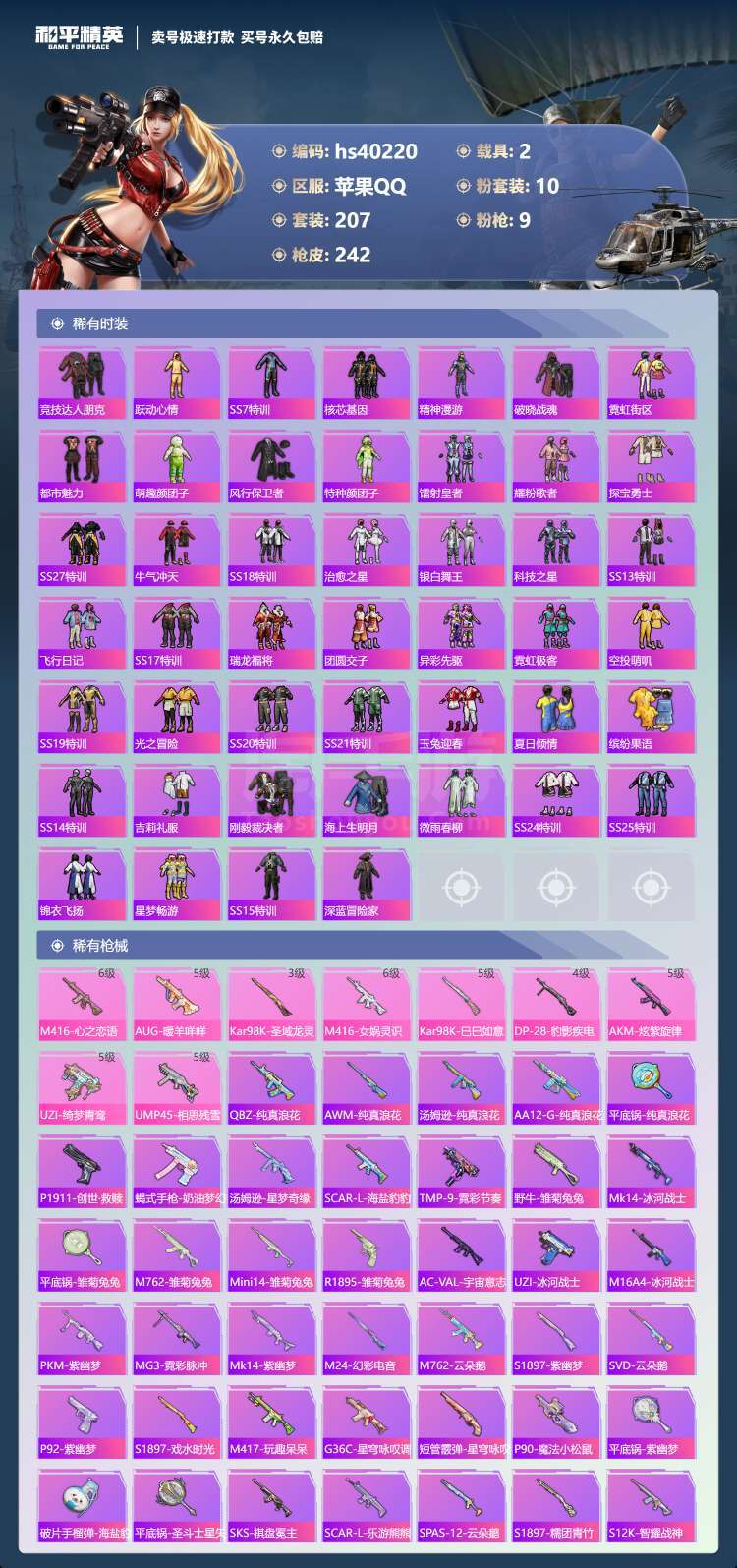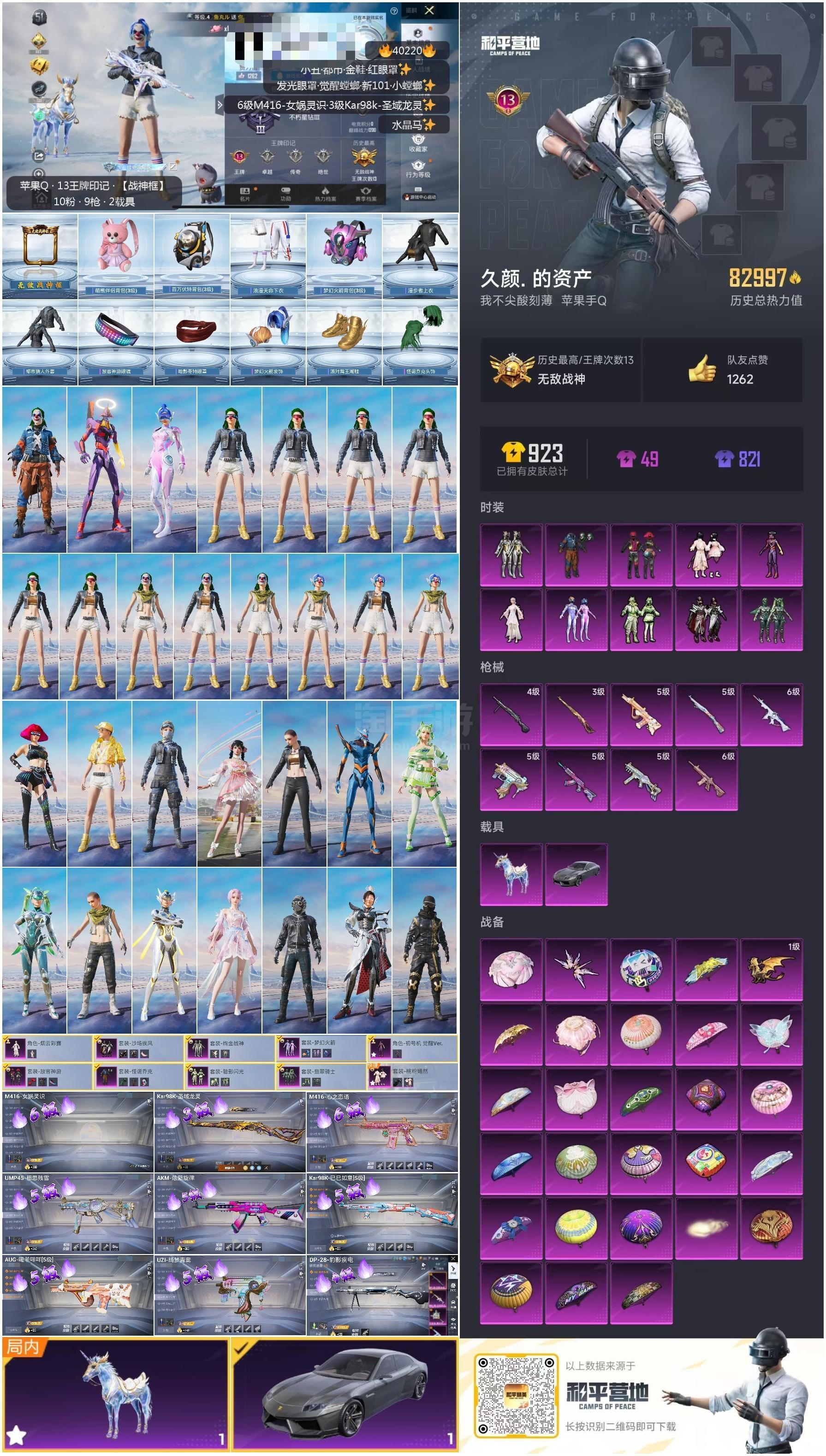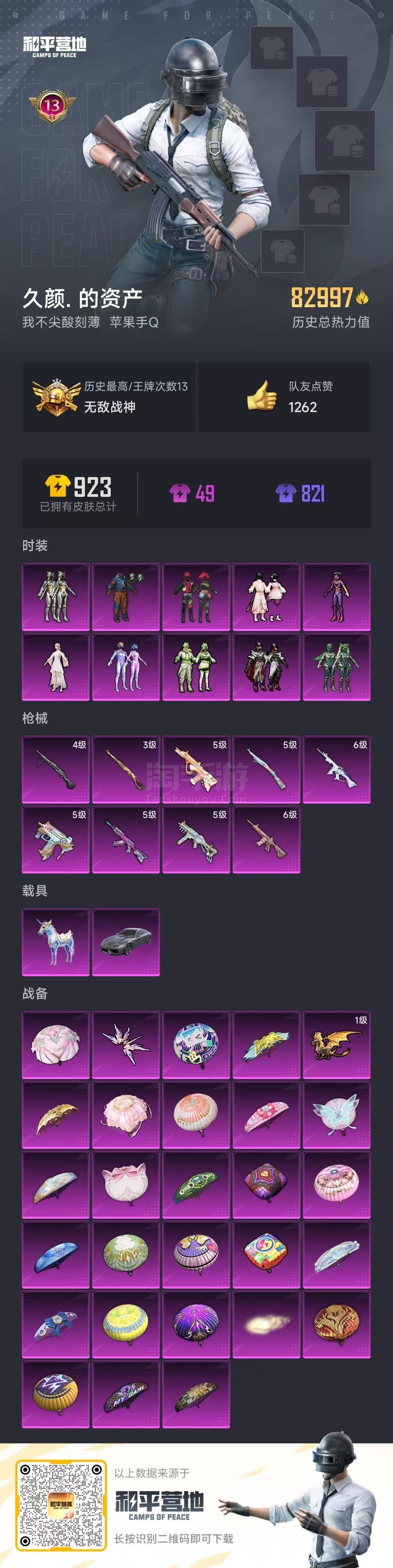 和平精英【苹果QQ】hs40220 苹果手Q-13王牌印记-有战神框-10粉装-9特效枪-2载具-82997热力值-20