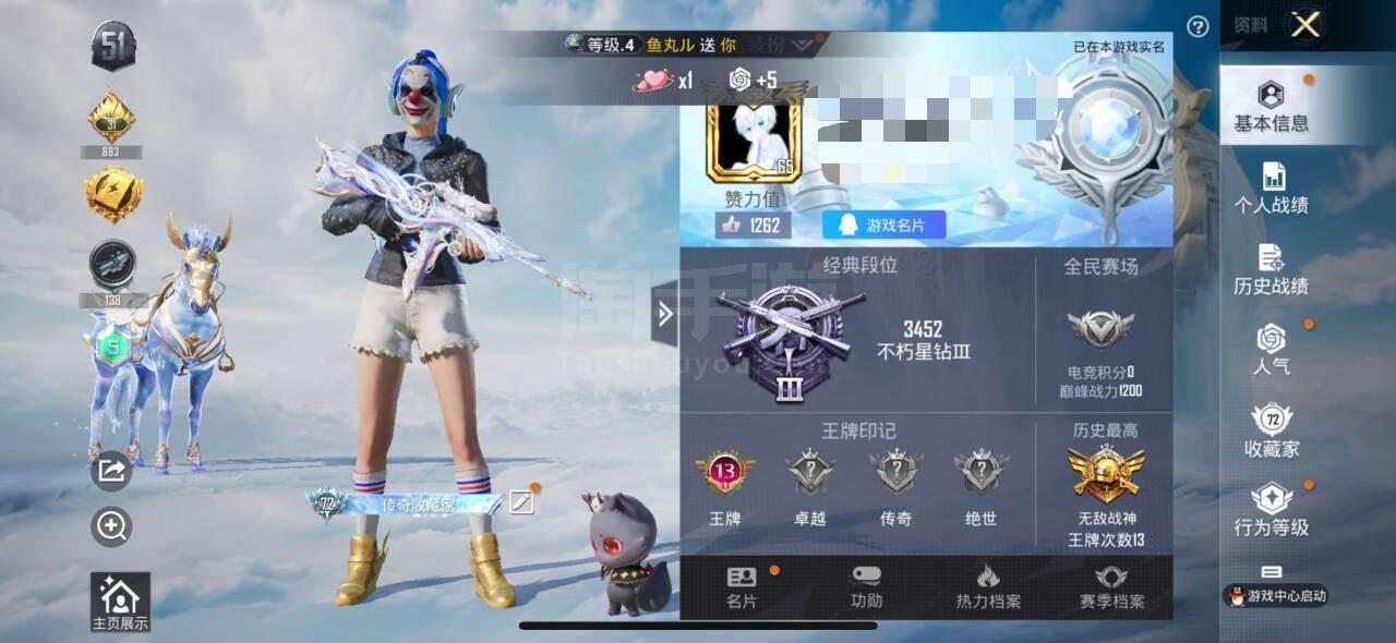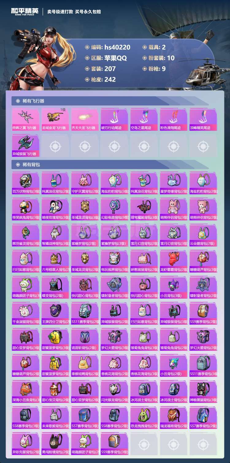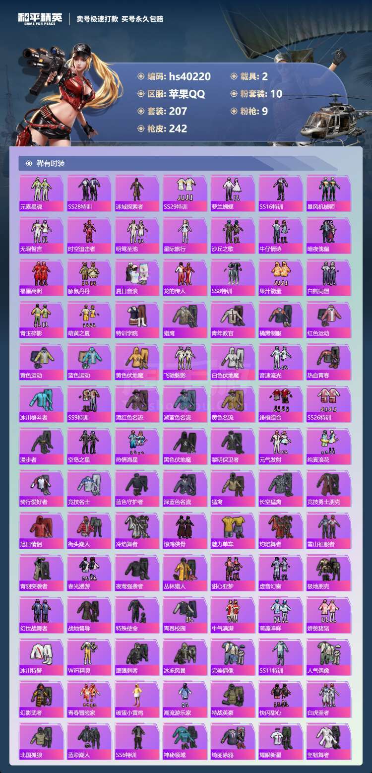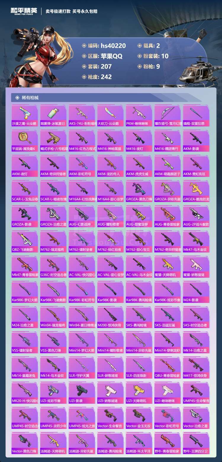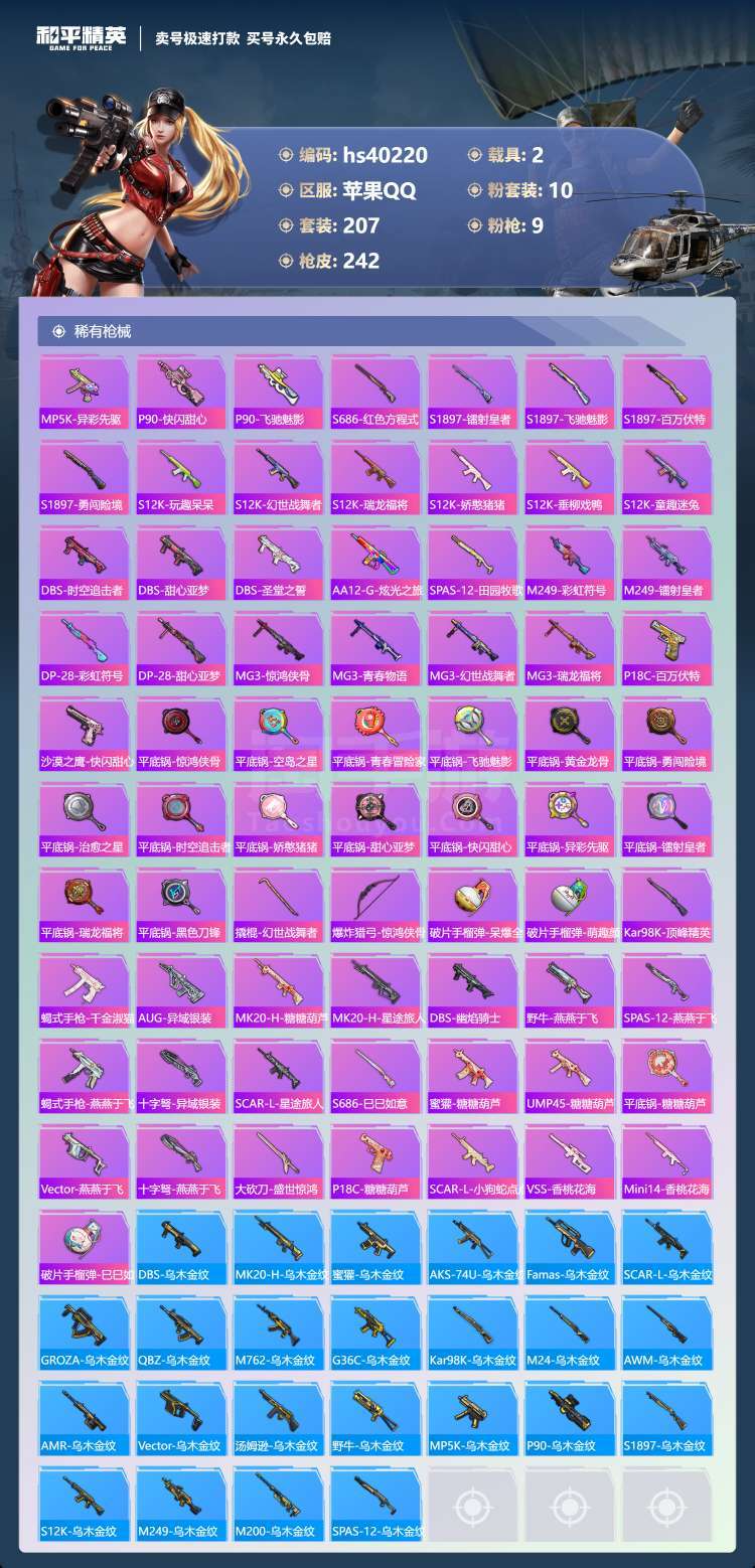 和平精英【苹果QQ】hs40220 苹果手Q-13王牌印记-有战神框-10粉装-9特效枪-2载具-82997热力值-20