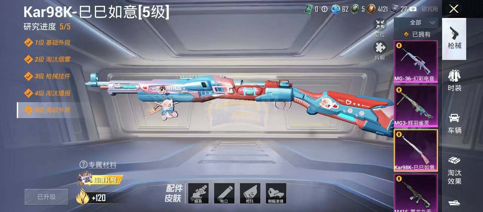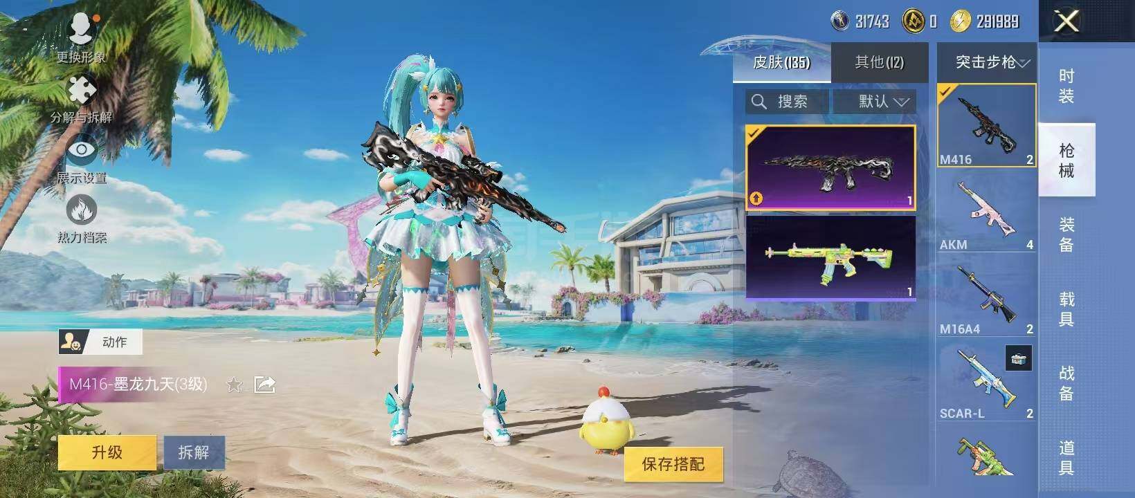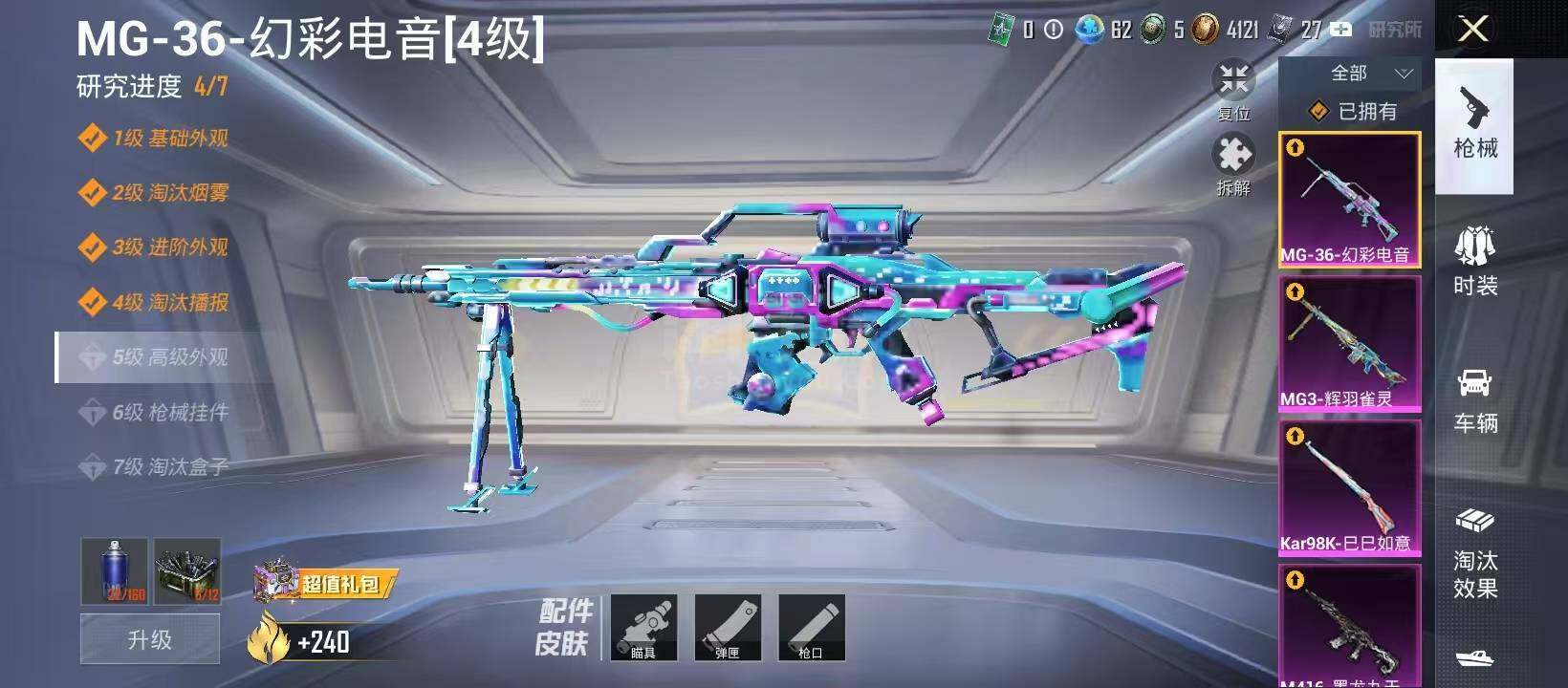 【特效枪等级】:M416-墨龙九天(三级),Kar98K-巳巳如意(五级),MG3-洛神天依(六级),MG3-辉羽雀灵(二级),PKM-江南烟雨(四级),MG-36-幻彩电音(四级)