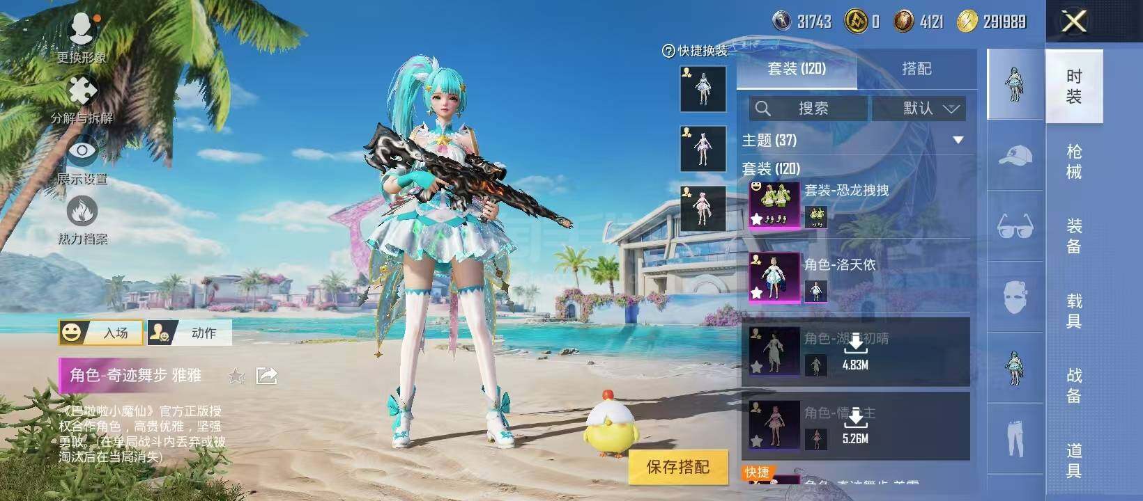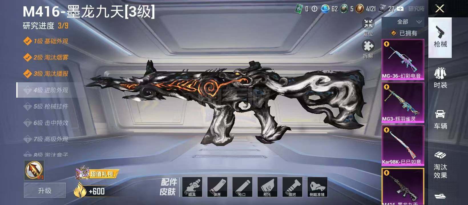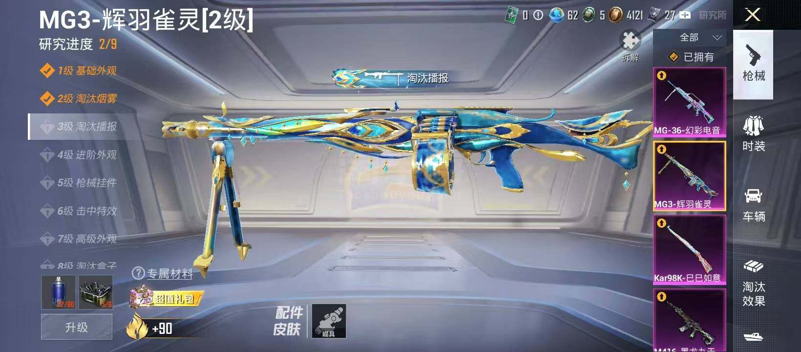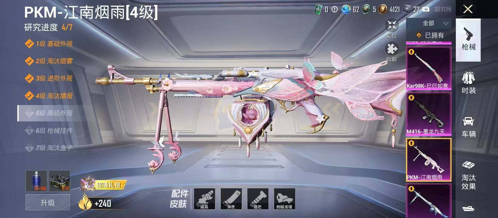 【特效枪等级】:M416-墨龙九天(三级),Kar98K-巳巳如意(五级),MG3-洛神天依(六级),MG3-辉羽雀灵(二级),PKM-江南烟雨(四级),MG-36-幻彩电音(四级)