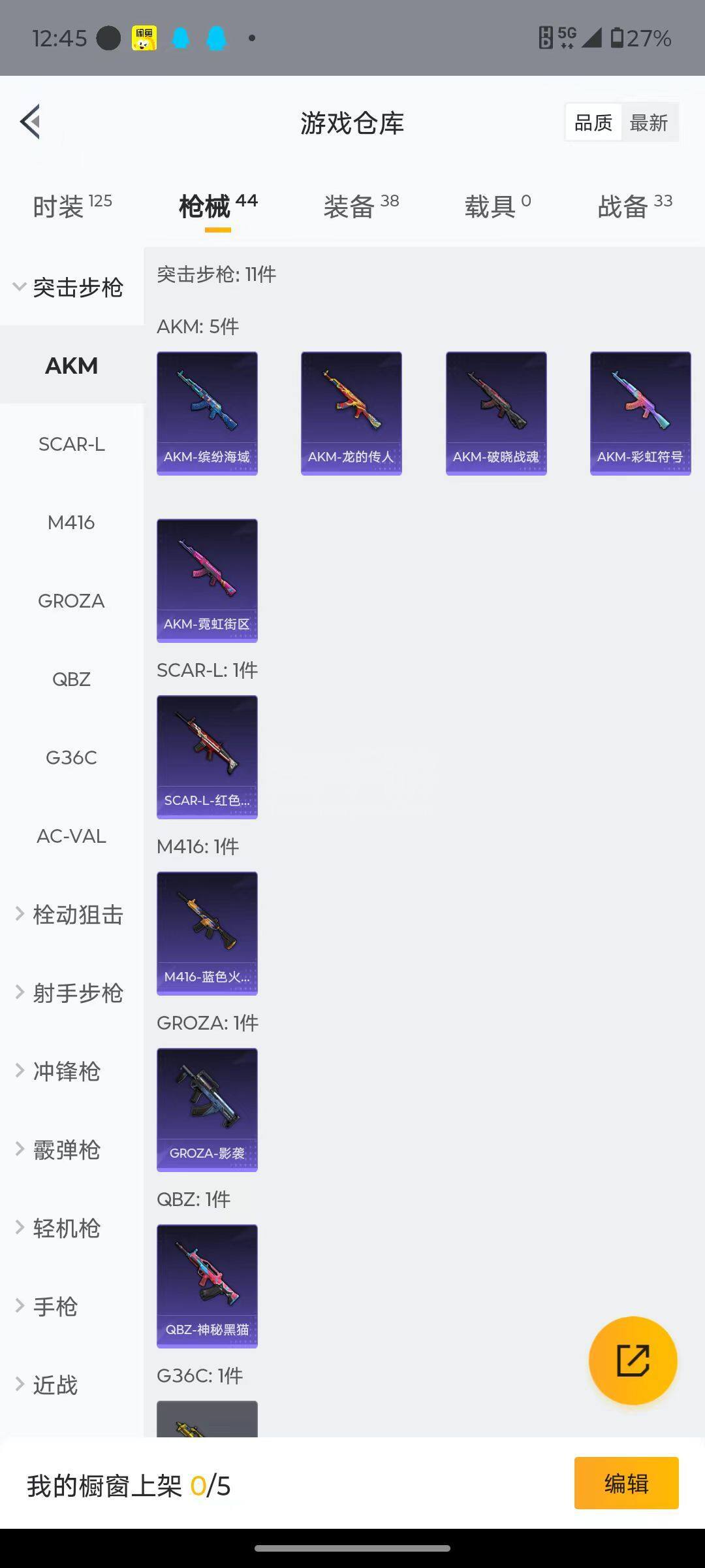 【稀有武器皮肤】:AKM-彩虹符号,AKM-破晓战魂,AKM-缤纷海域,AKM-霓虹街区,AKM-龙的传人,SCAR-L-红色方程式,M416-蓝色火焰,GROZA-影袭,