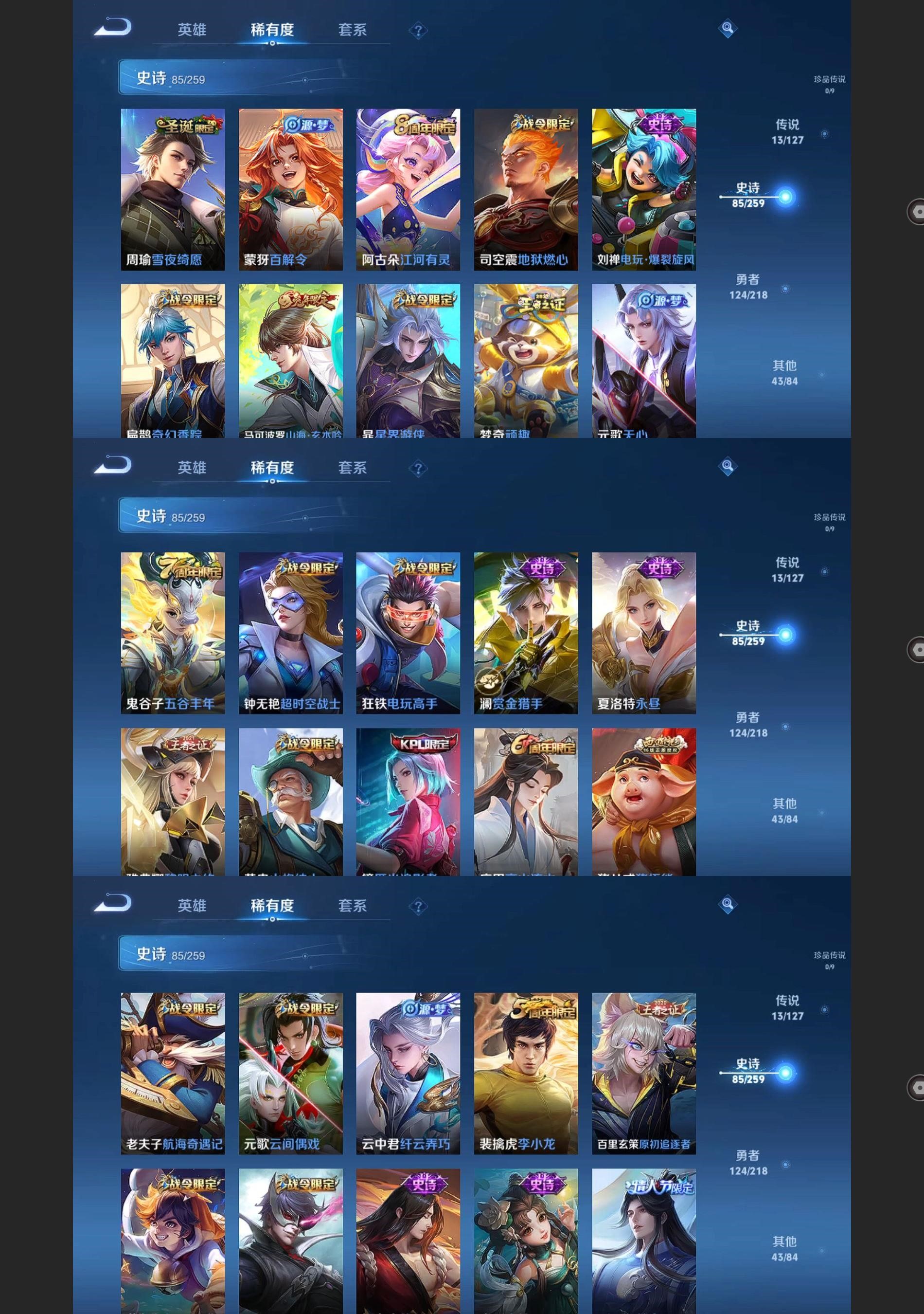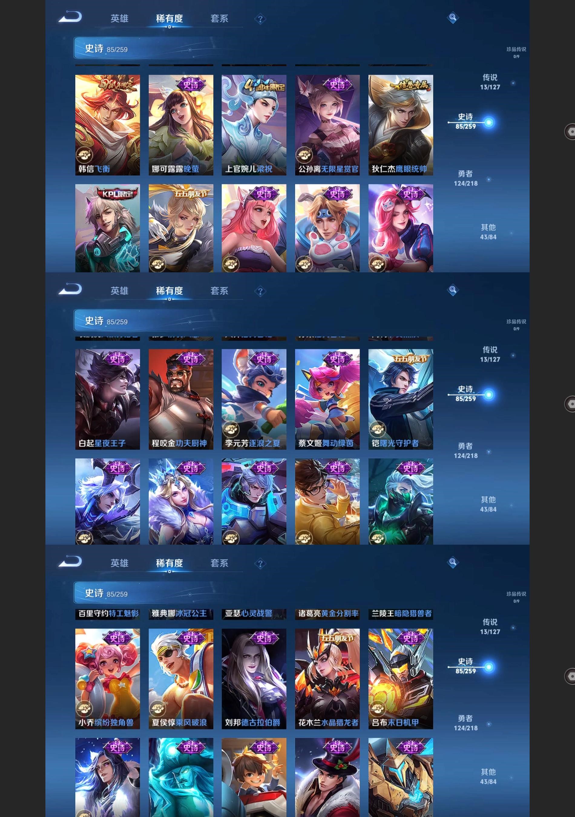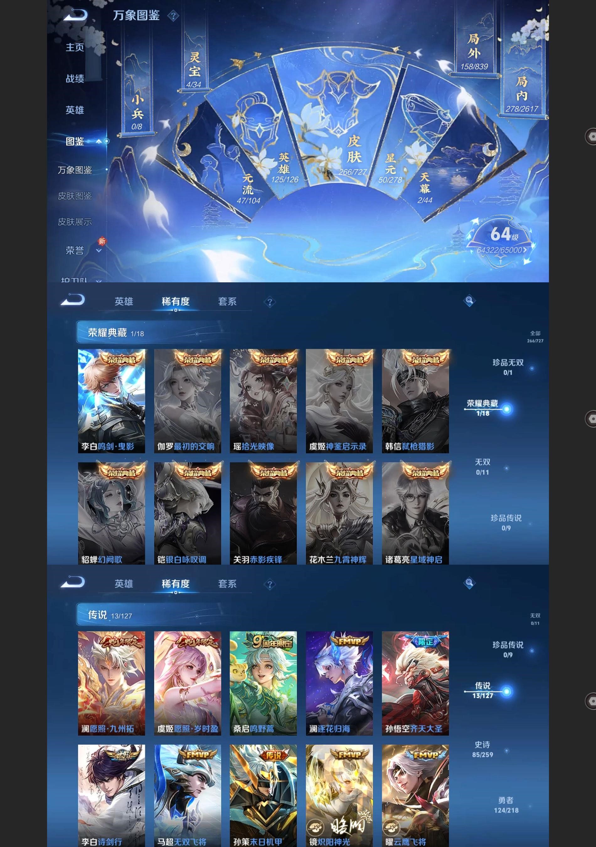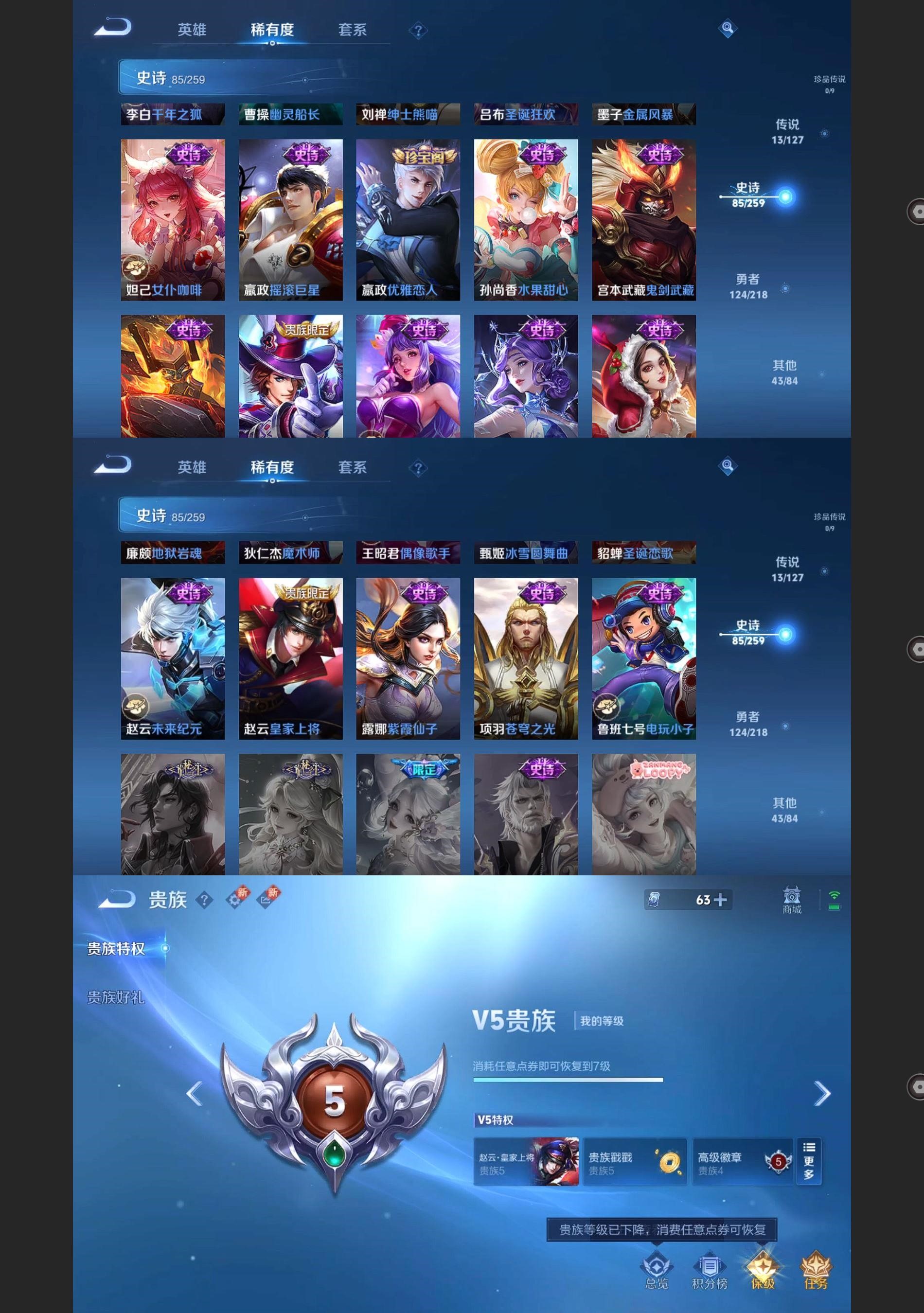 [王者荣耀]V71典藏13传说85史诗266皮肤至尊星耀V