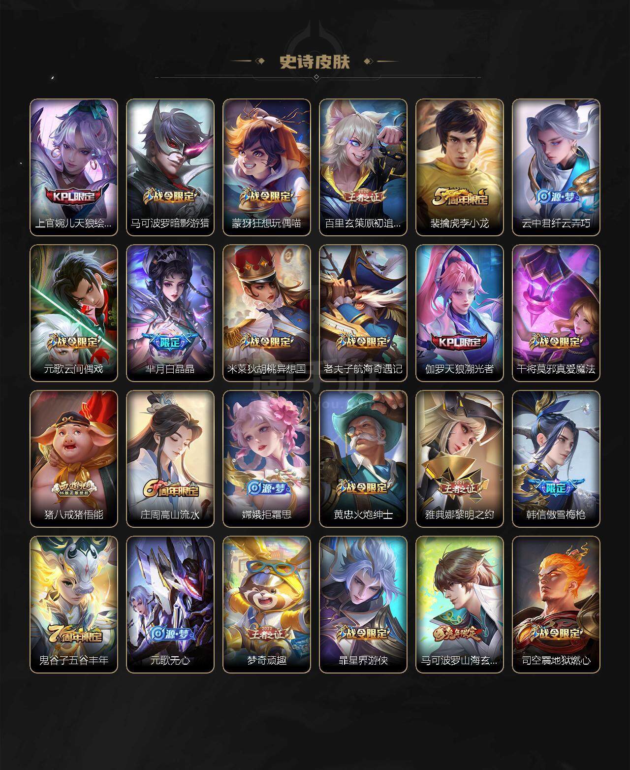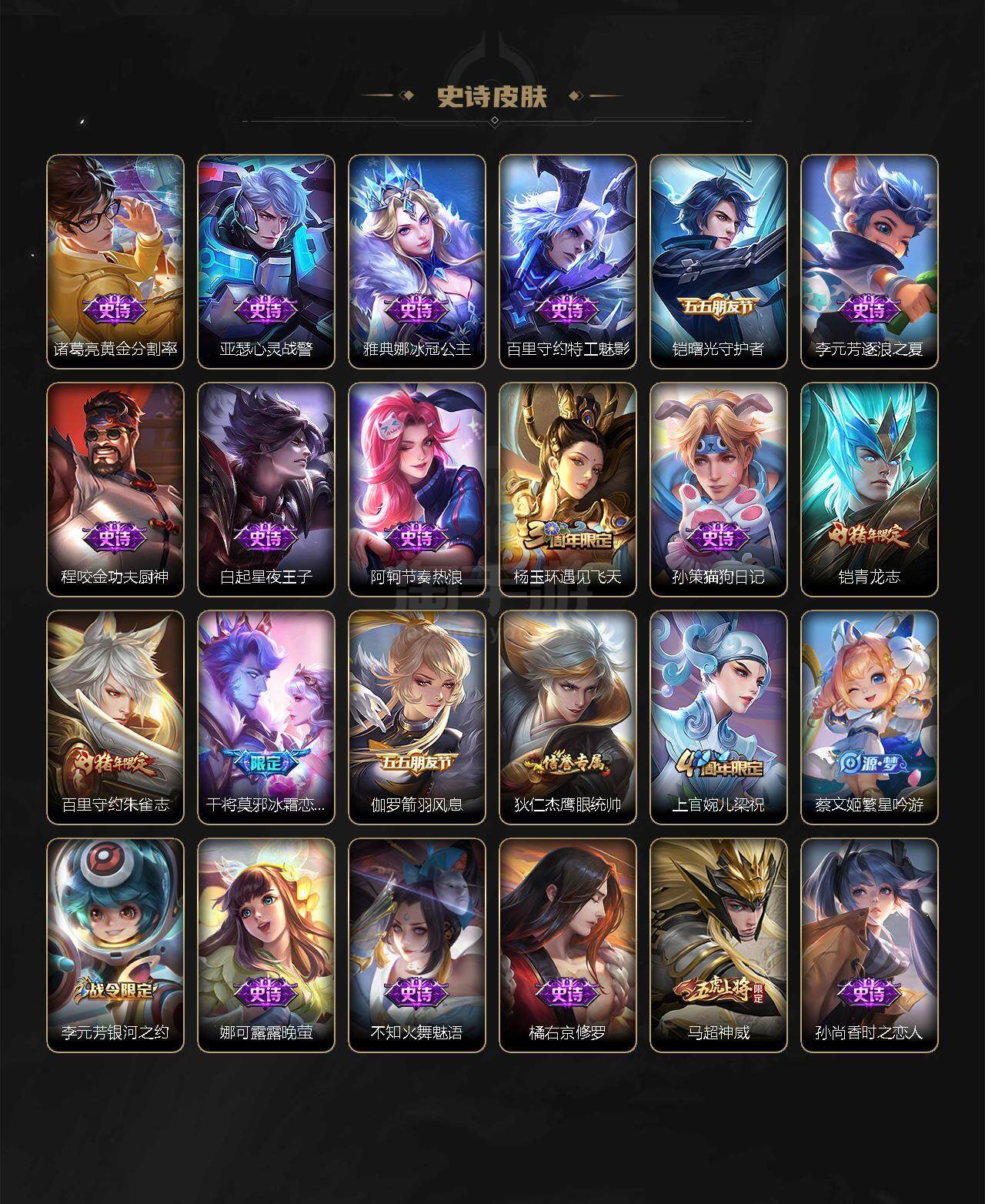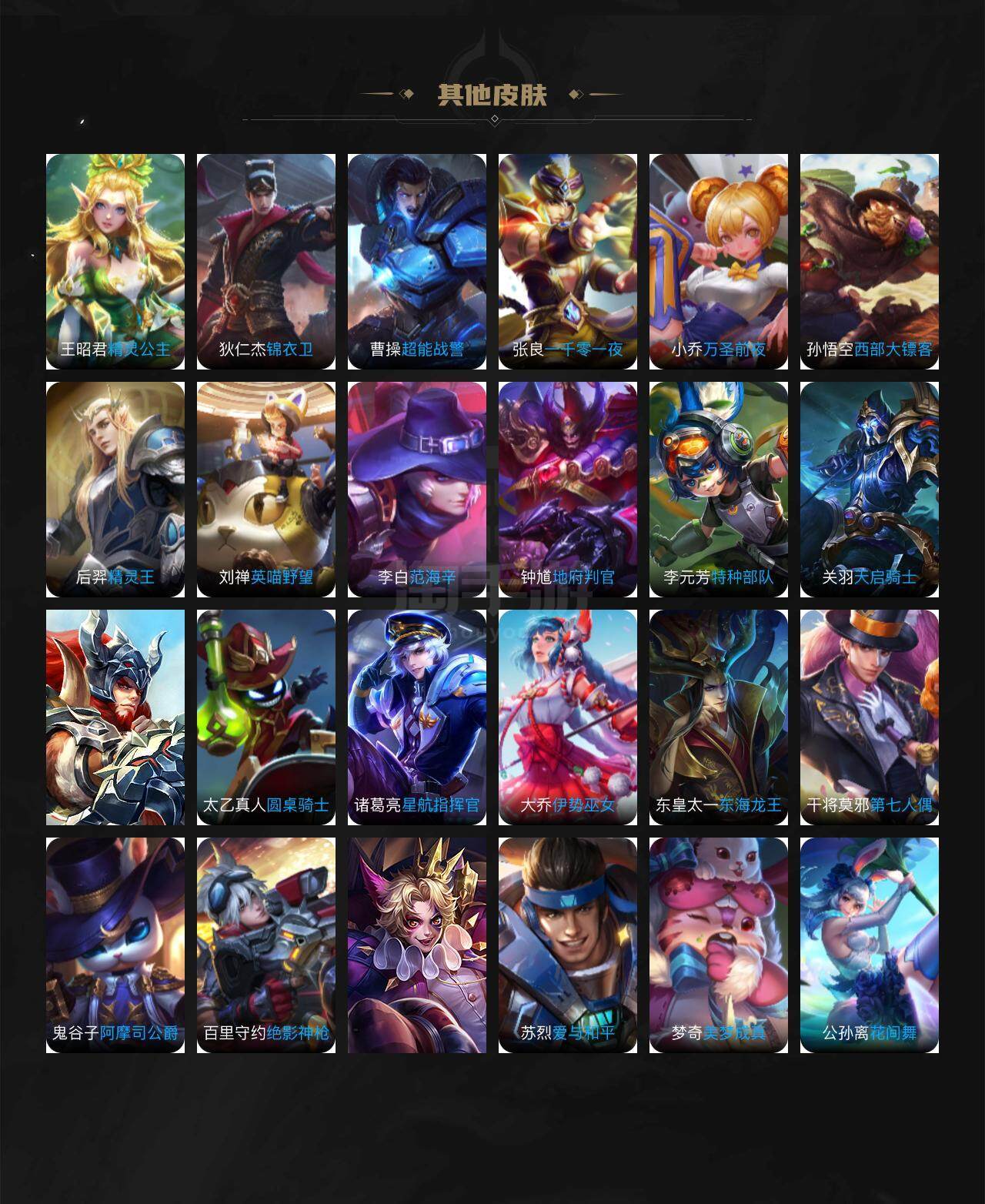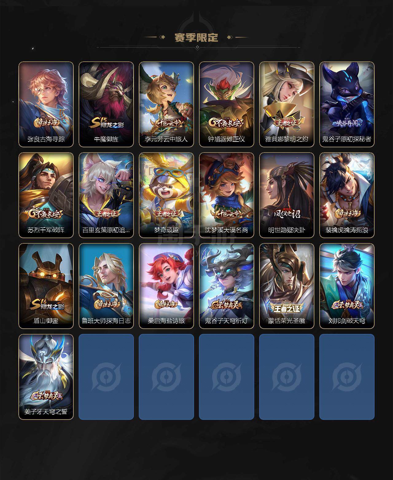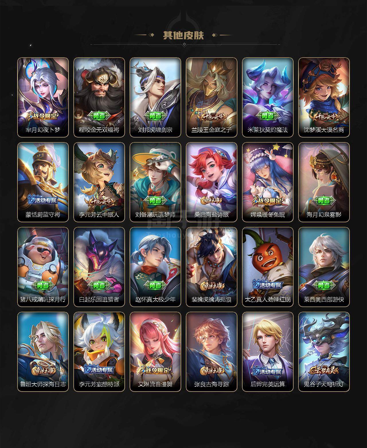 【限定皮肤】:姜子牙天穹之誓,李白谪仙醉月,狄仁杰阴阳师,赵云皇家上将,墨子神迹守卫,庄周高山流水,高渐离死亡摇滚,高渐
