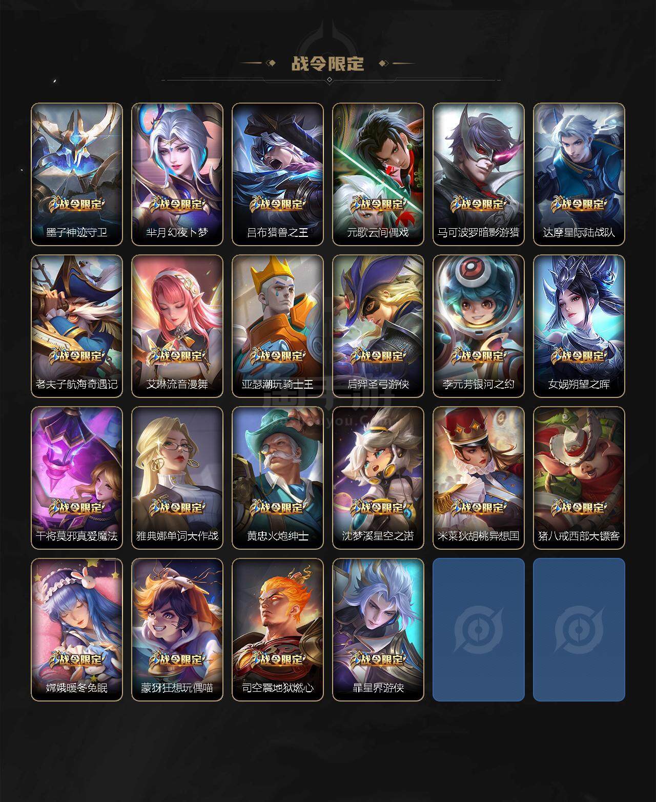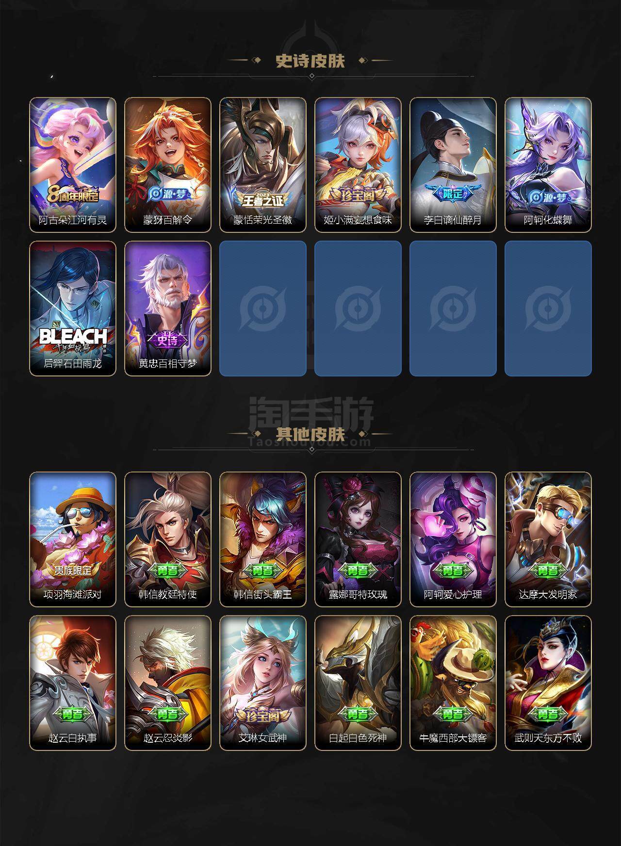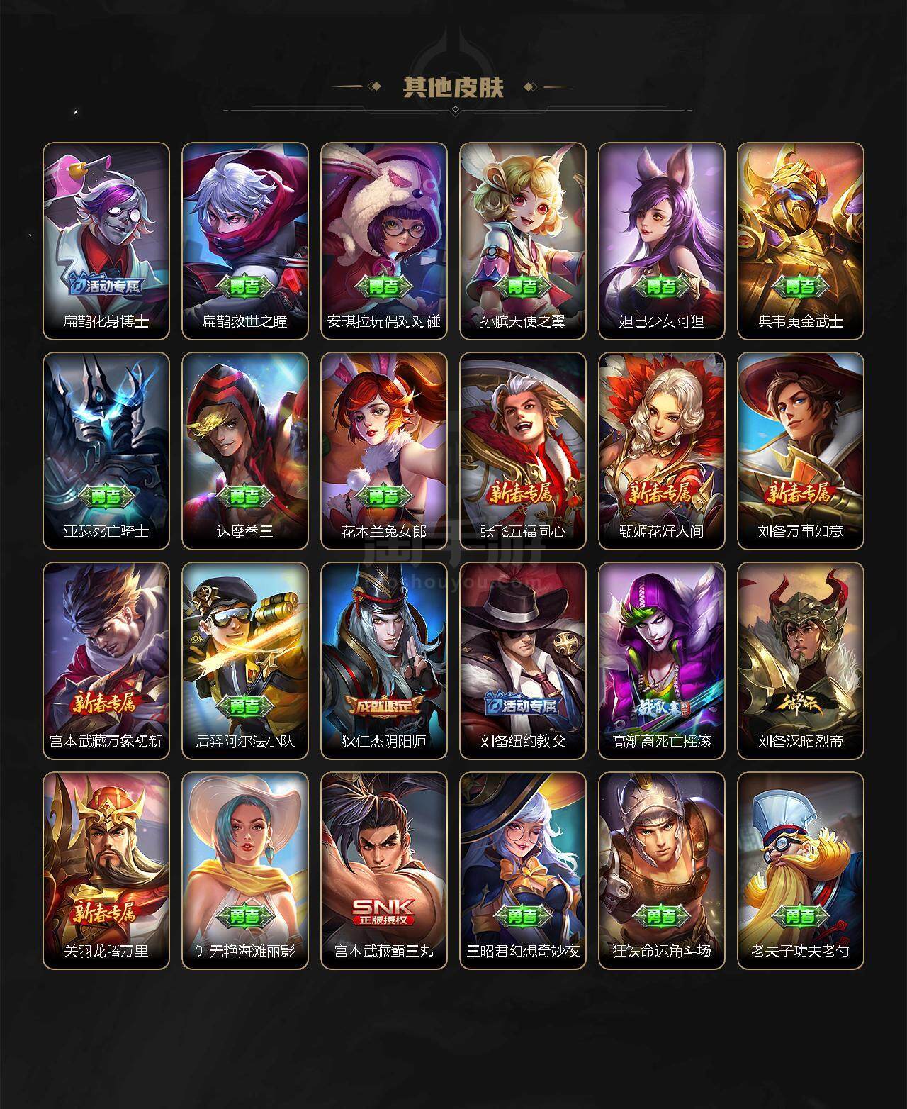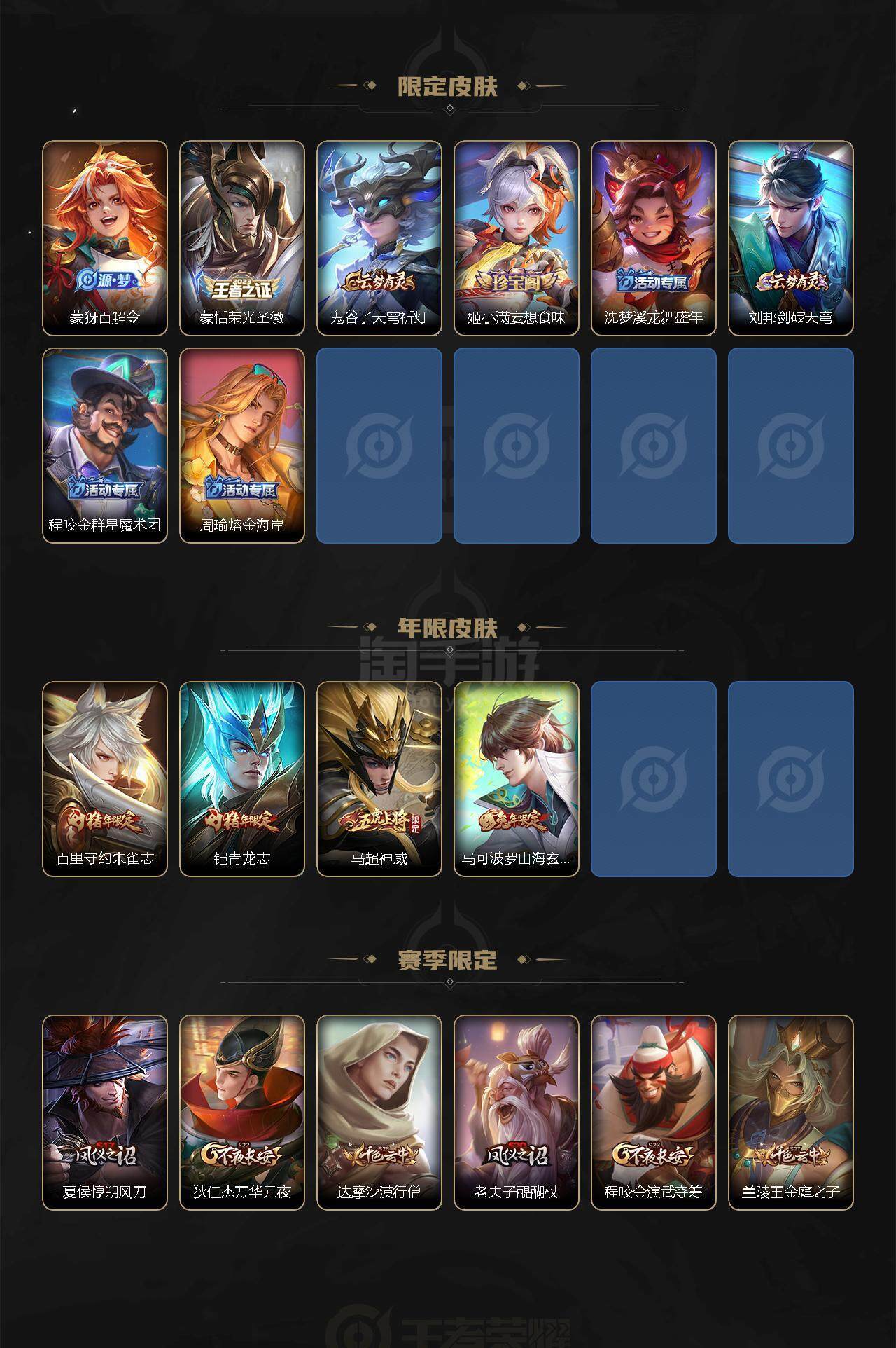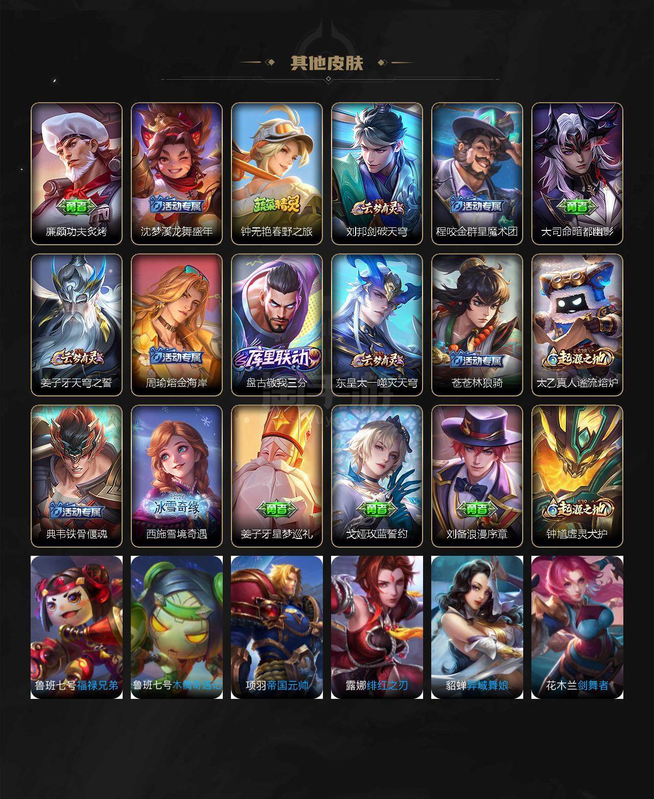 【限定皮肤】:姜子牙天穹之誓,李白谪仙醉月,狄仁杰阴阳师,赵云皇家上将,墨子神迹守卫,庄周高山流水,高渐离死亡摇滚,高渐
