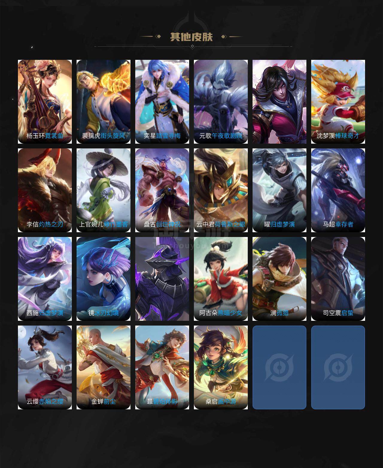 【传说皮肤】:狄仁杰超时空战士,宫本武藏地狱之眼,达摩黄金狮子座,曜云鹰飞将,澜逐花归海,桑启鸣野蒿