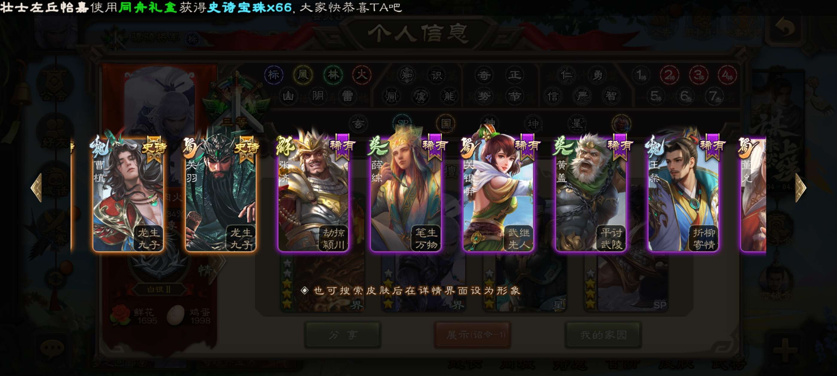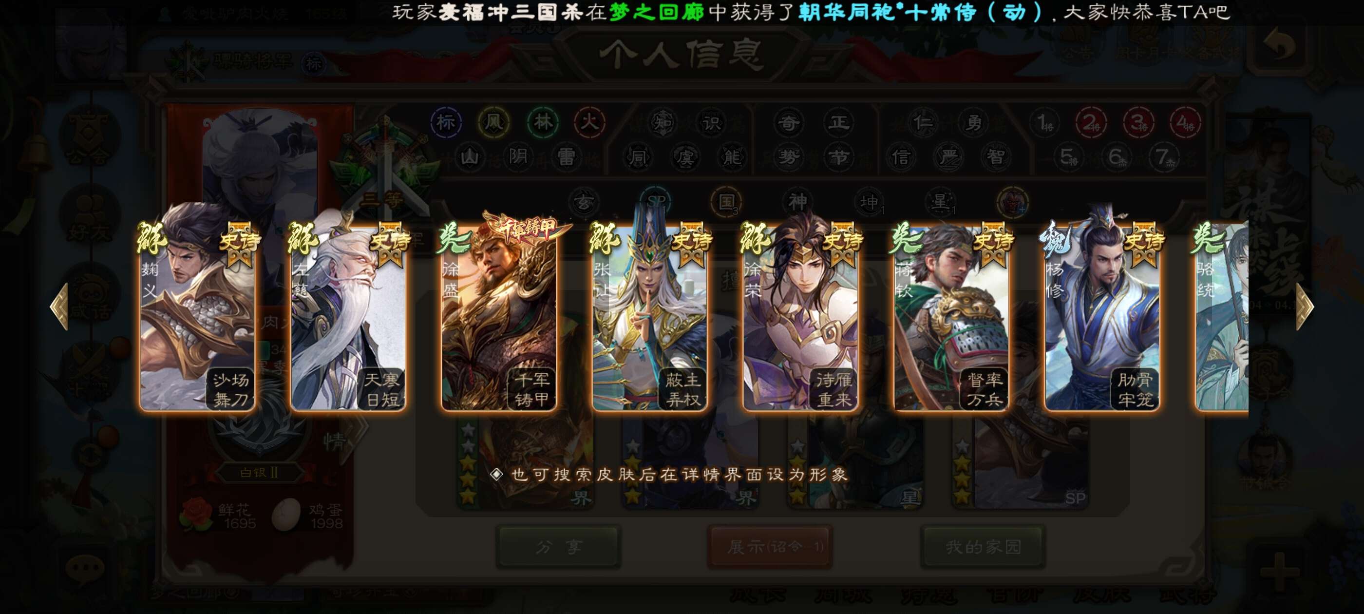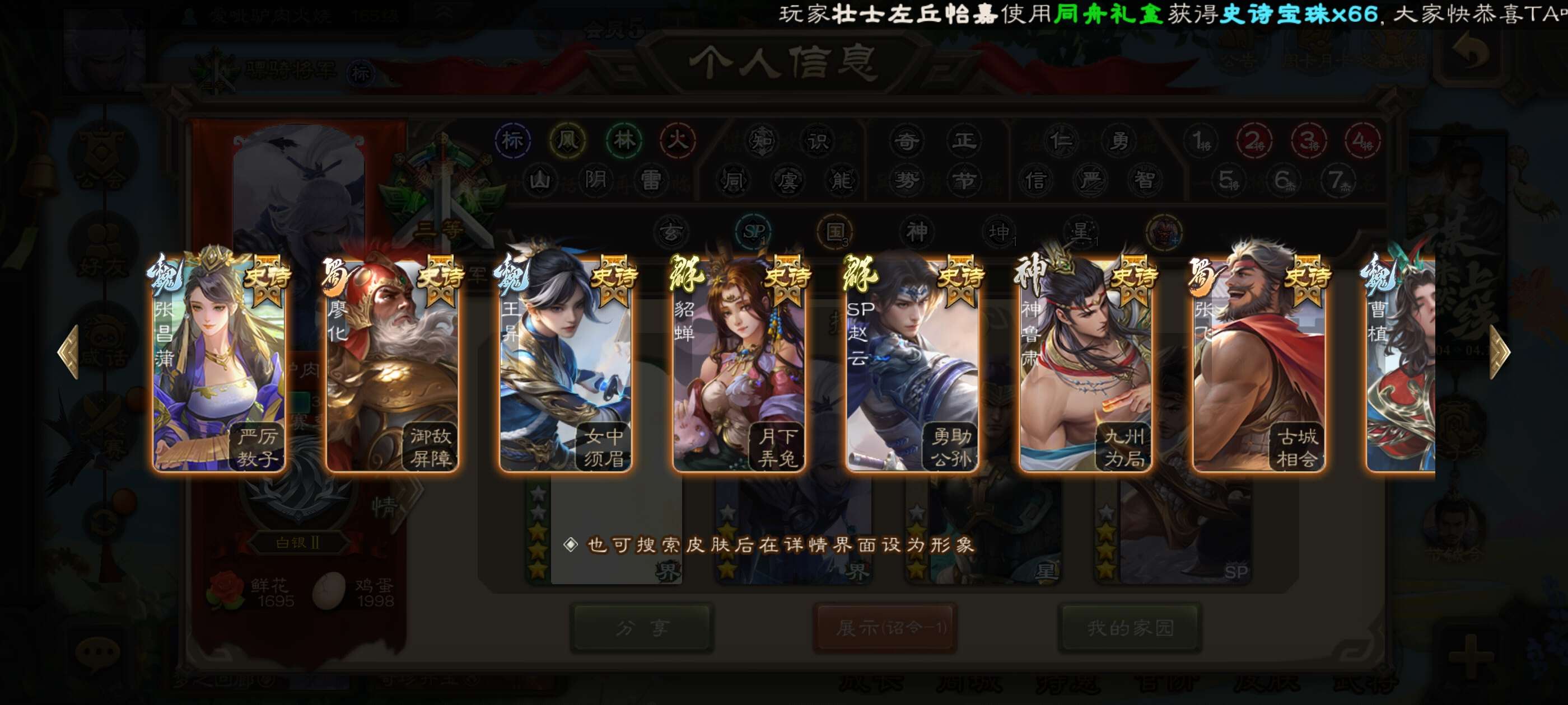 16史诗武将,一堆史诗皮肤,还有两千二将魂可下次兑换,骠骑官阶,可小刀