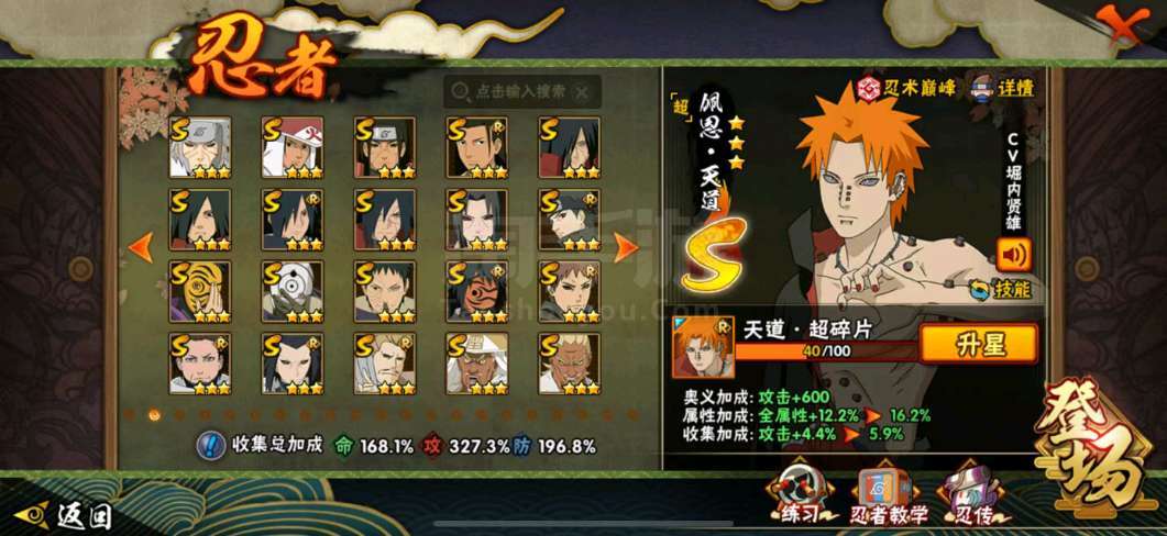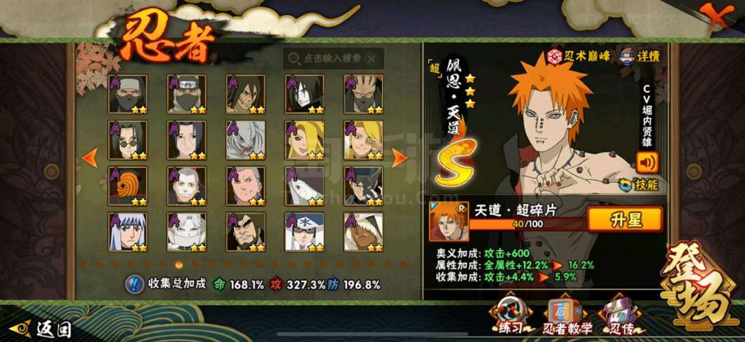 自来也(舞杰),自来也,自来也(仙人),大蛇丸,波风水门,佩恩(天道),宇智波鼬(须佐能乎),神秘面具男,千手扉间,艾(四代目),千手柱间,宇智波斑,长门(秽土),猿飞日斩(秽土),波风水门(秽土),纲手(百豪),千手扉间(秽土),宇智波斑(白面具),宇智波斑(秽土),药师兜(仙人),鬼灯幻月(二代目),金角银角(秽土),无(二代目),半藏(秽土),艾(三代目),佩恩天道(超),纲手,猿飞日斩,大野木(三代目),宇智波鼬(秽土),罗砂(四代目),千手柱间(秽土),忍界带土,木叶创立斑,三代目风影(秽土),八门凯,大野木(忍界大战),九喇嘛鸣人,大筒木金氏,忍战樱,神秘面具男 (红叶之刃),宇智波佐助(永恒万花筒),木叶创立( 柱间 ),秽土解斑,大筒木桃式(博人传),艾(忍界大战),止水(须佐能乎),旗木卡卡西(须佐能乎),大筒木舍人(最终章),自来也(传说中的三忍),漩涡鸣人(暴怒·第六尾)
