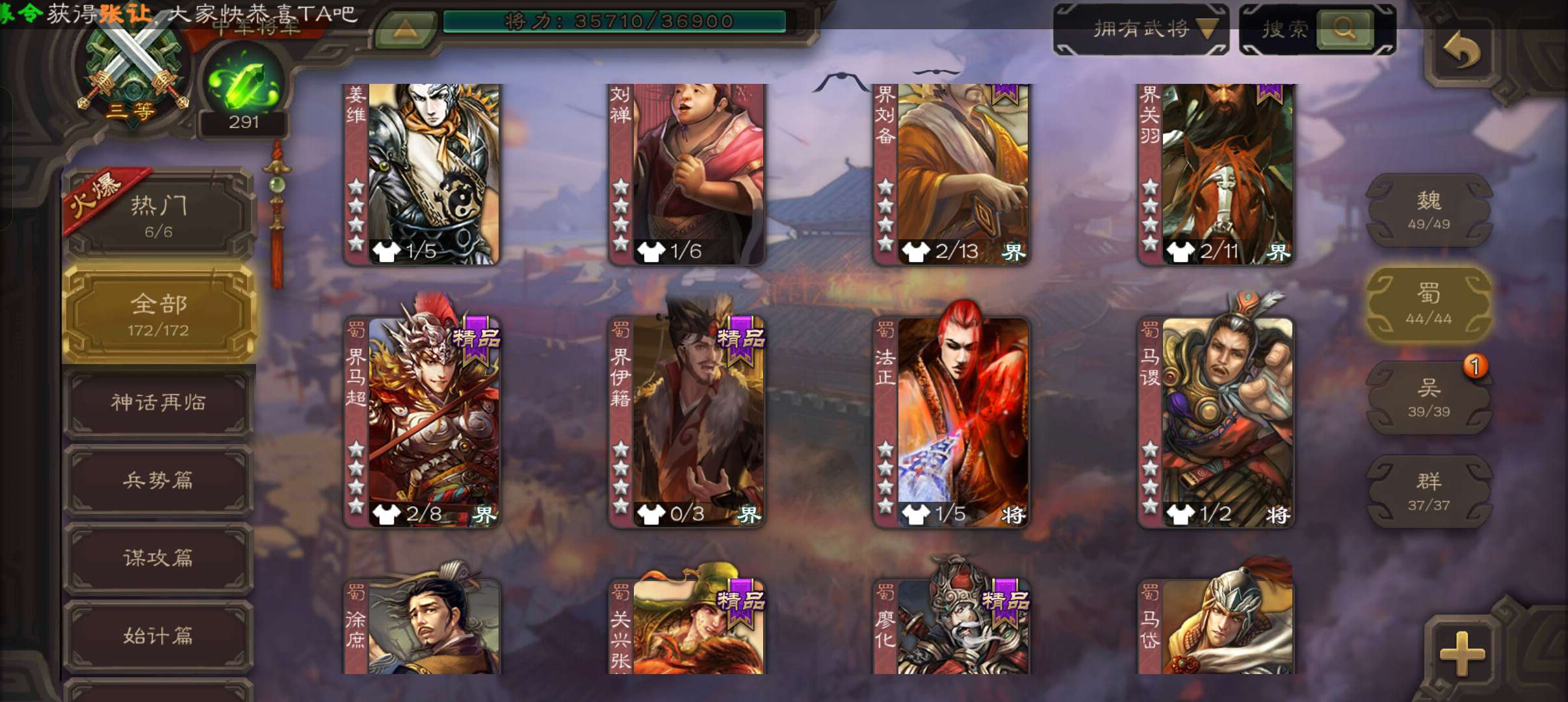 7史诗3神中军,6.9万豆,骆统金皮张让神刘备谯周界于禁杨修程昱,动曹冲动诸葛果谋高顺甘夫人172将