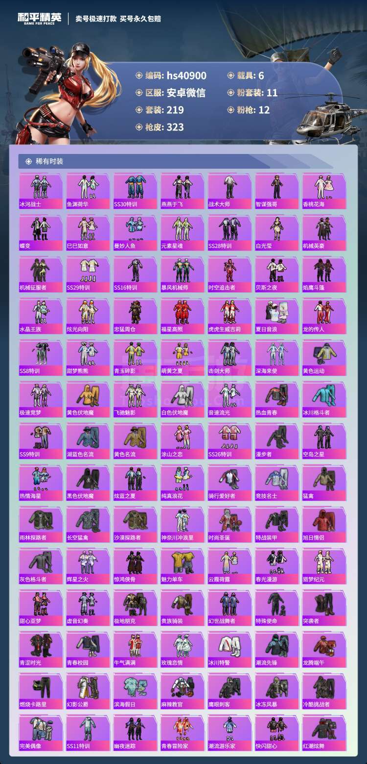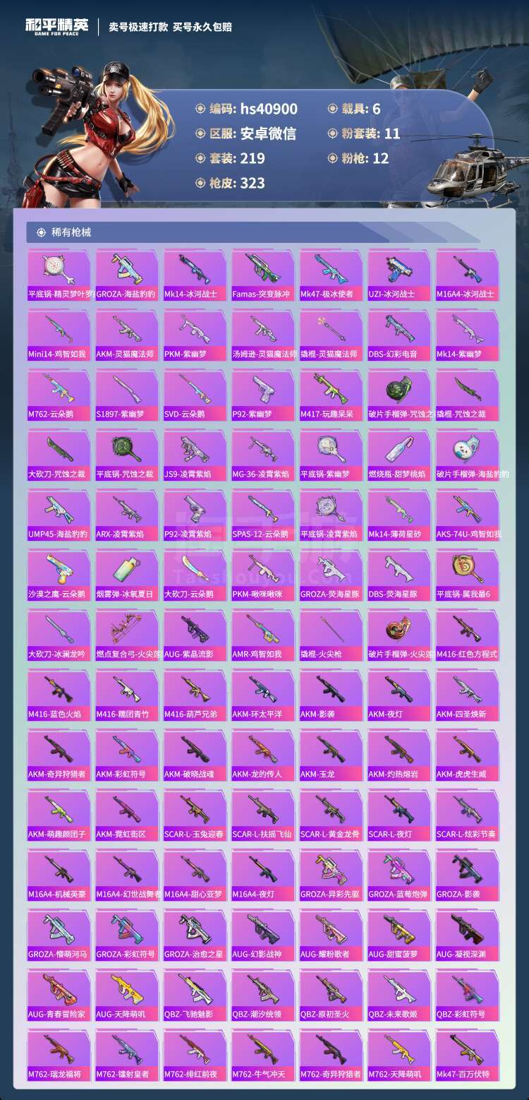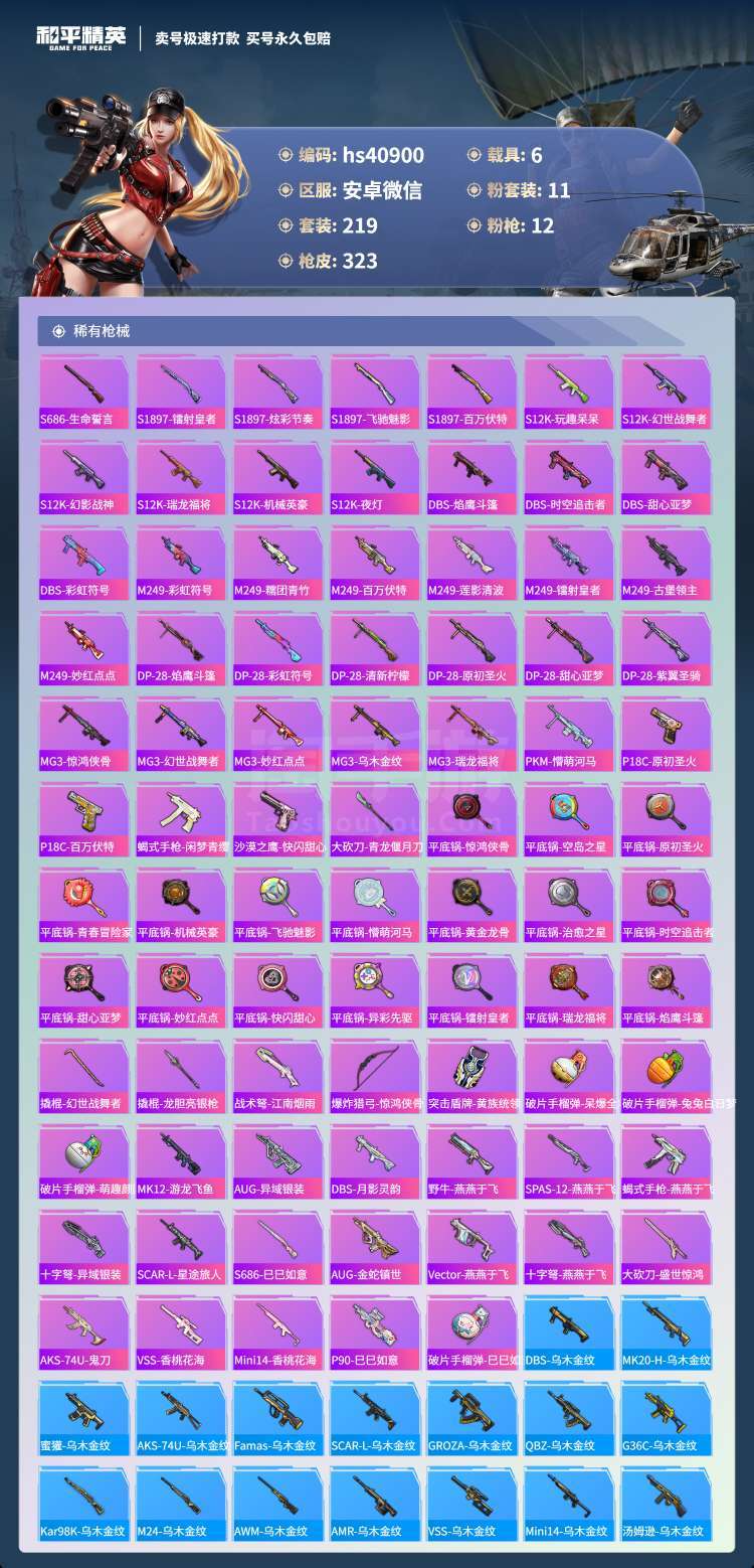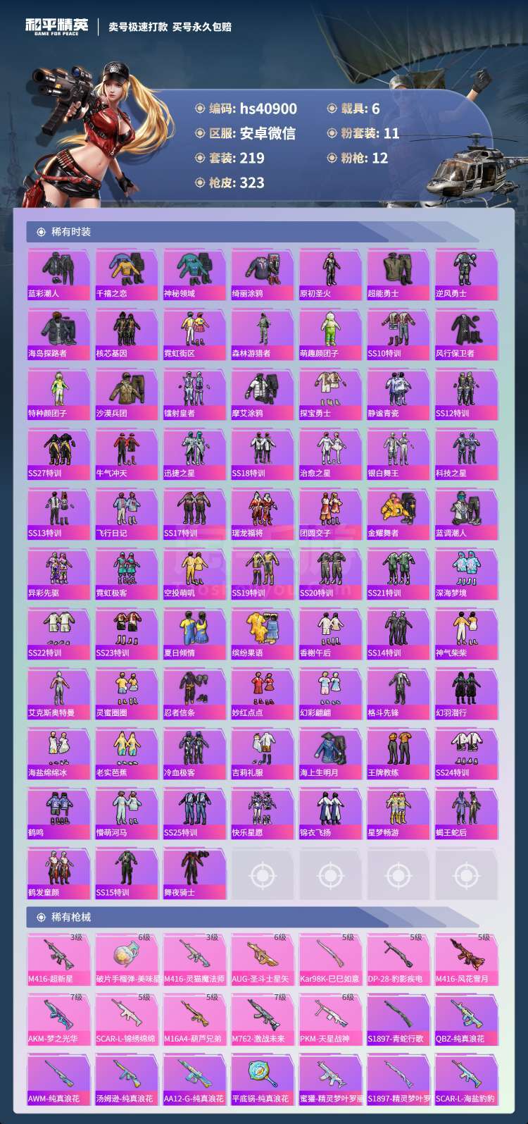 hs40900 安卓微-24王牌印记-有战神框-11粉装-12特效枪-6载具-111397热力值-