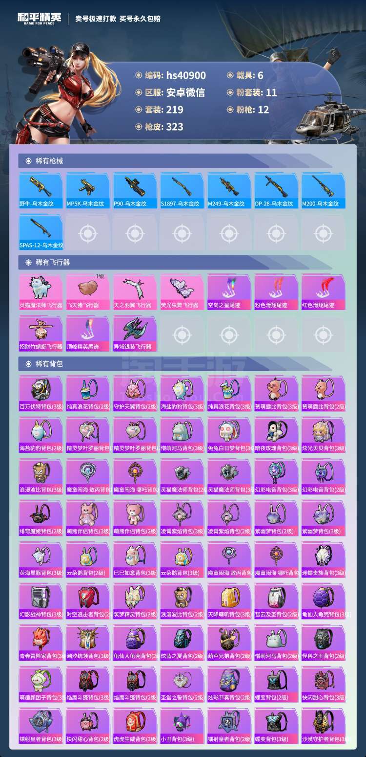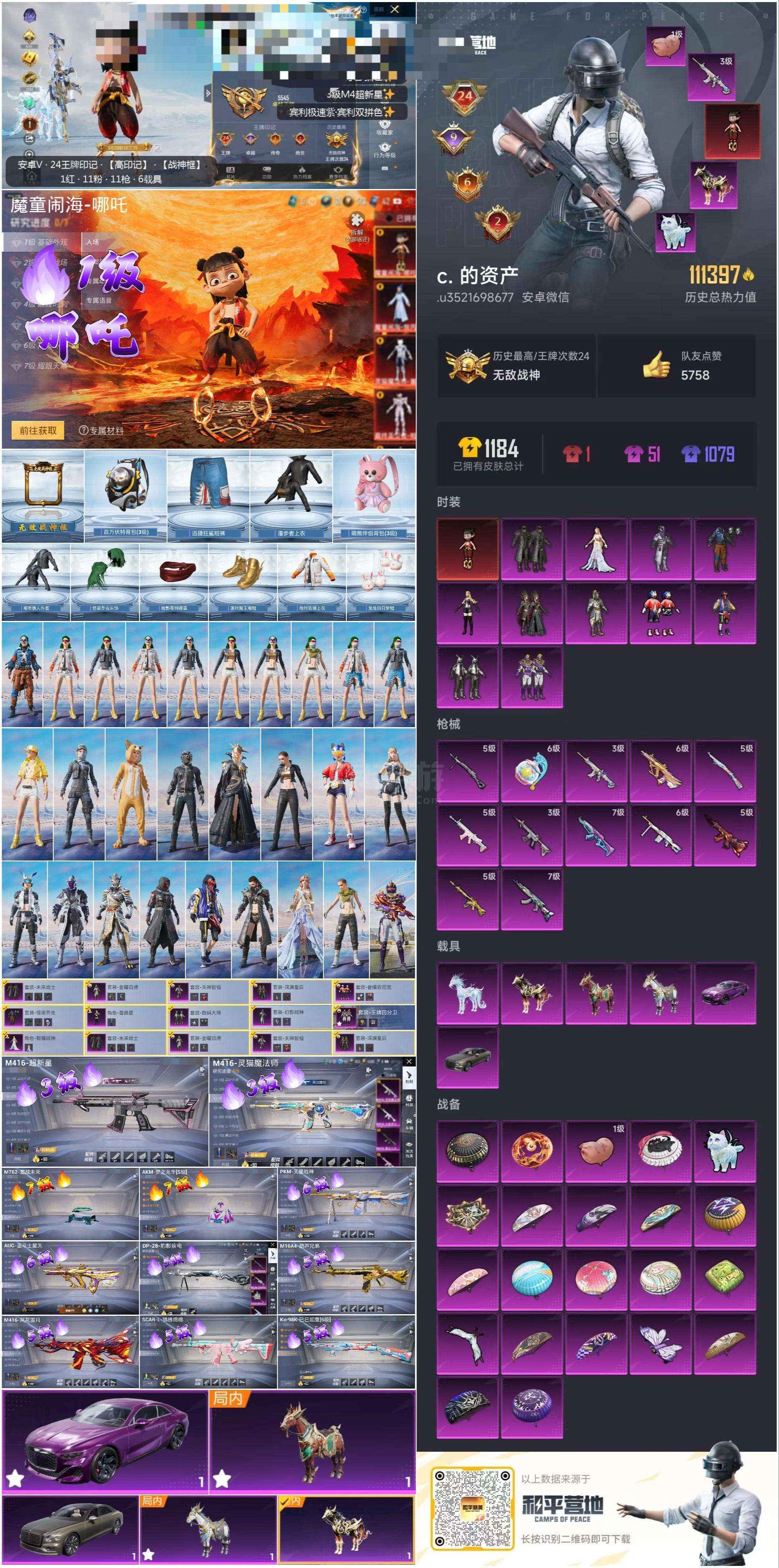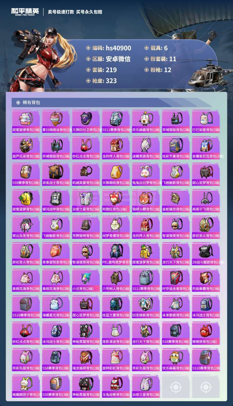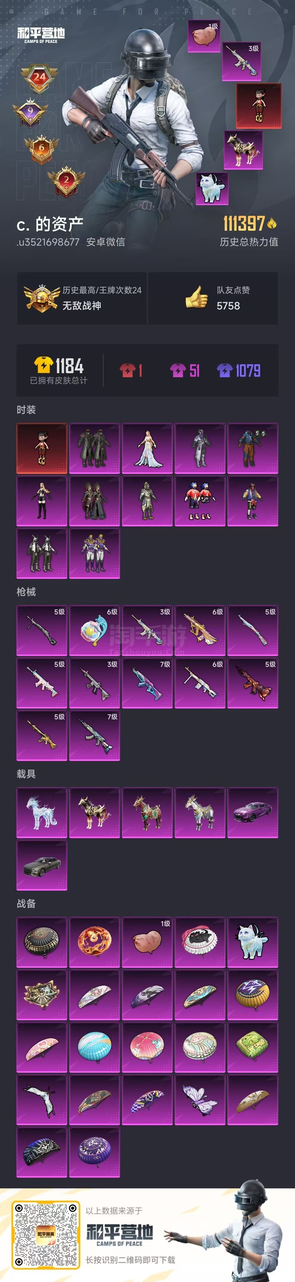 hs40900 安卓微-24王牌印记-有战神框-11粉装-12特效枪-6载具-111397热力值-