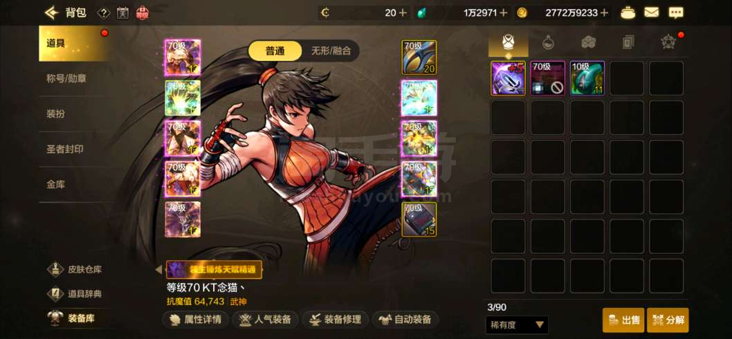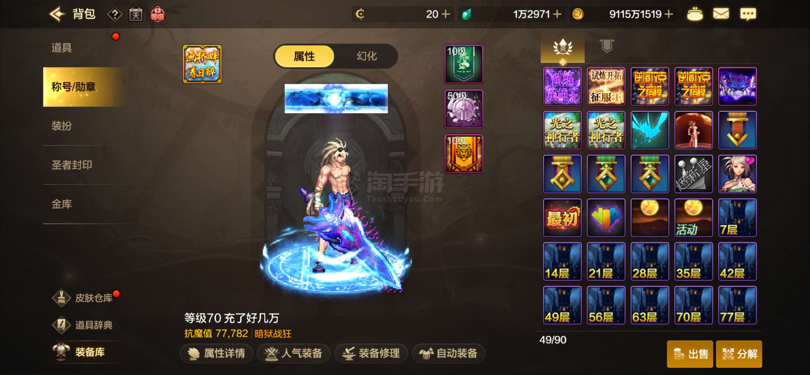 属强7+7,武器增幅带的是8,还有个10的胚子,氪金道具拉满,抗魔7.7,还有个7.3的剑宗
