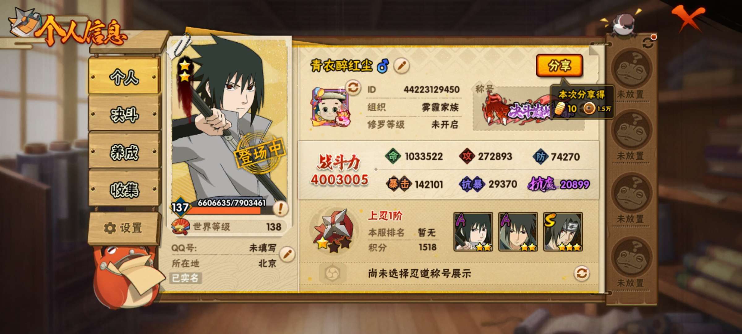 火影忍者【安卓QQ】【无冻结】火影忍者0级全新账号(Q区/安卓苹果通用、新号0级