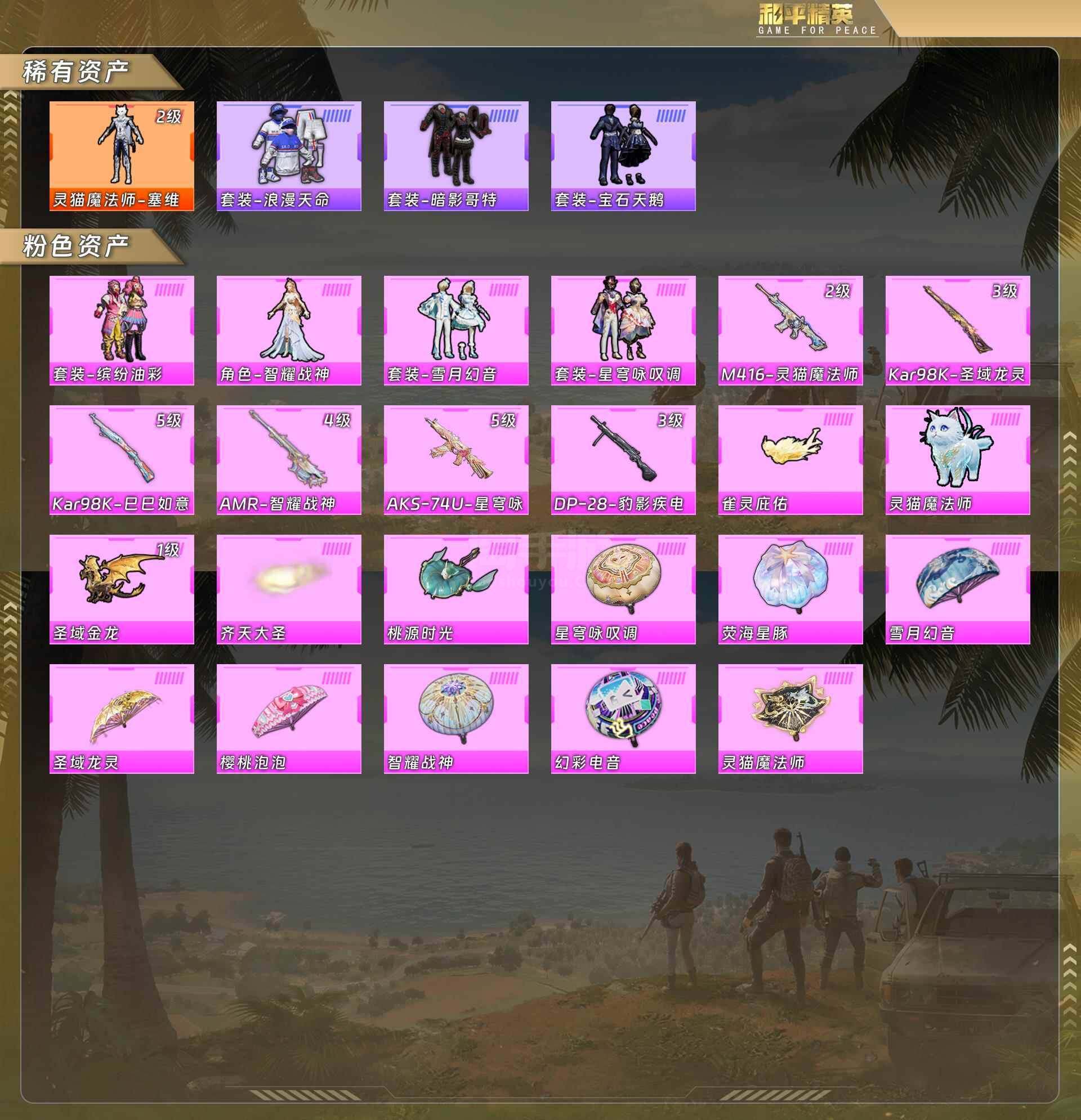 2级神装灵猫魔法师/红眼罩/浪漫天命/宝石天鹅/缤纷油彩/智耀战神/雪月幻音【粉色枪皮】M416灵猫魔法师2级/98K圣域龙灵3级/AMR智耀战神4级/74U星穹咏叹调5级/DP28豹影疾电3级 没战神框(1神装6粉枪4粉套)HP2551-27666热力值-4印记-47套装-76枪皮