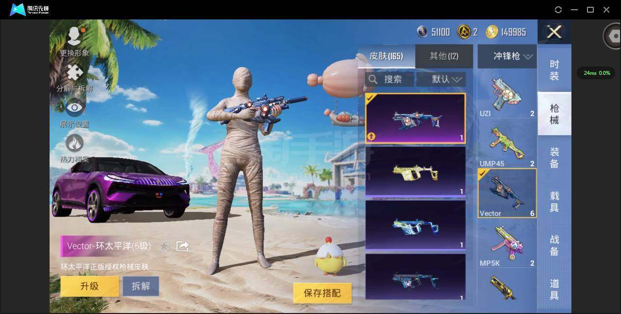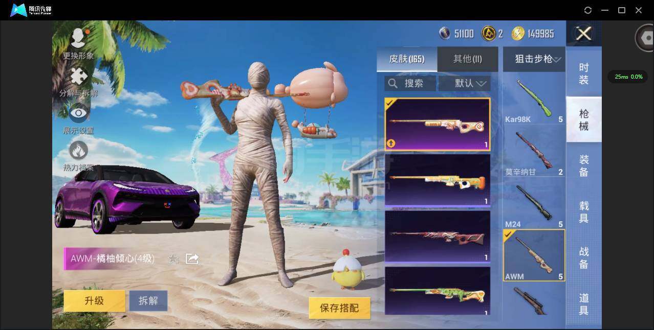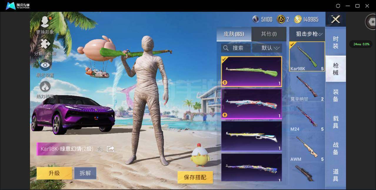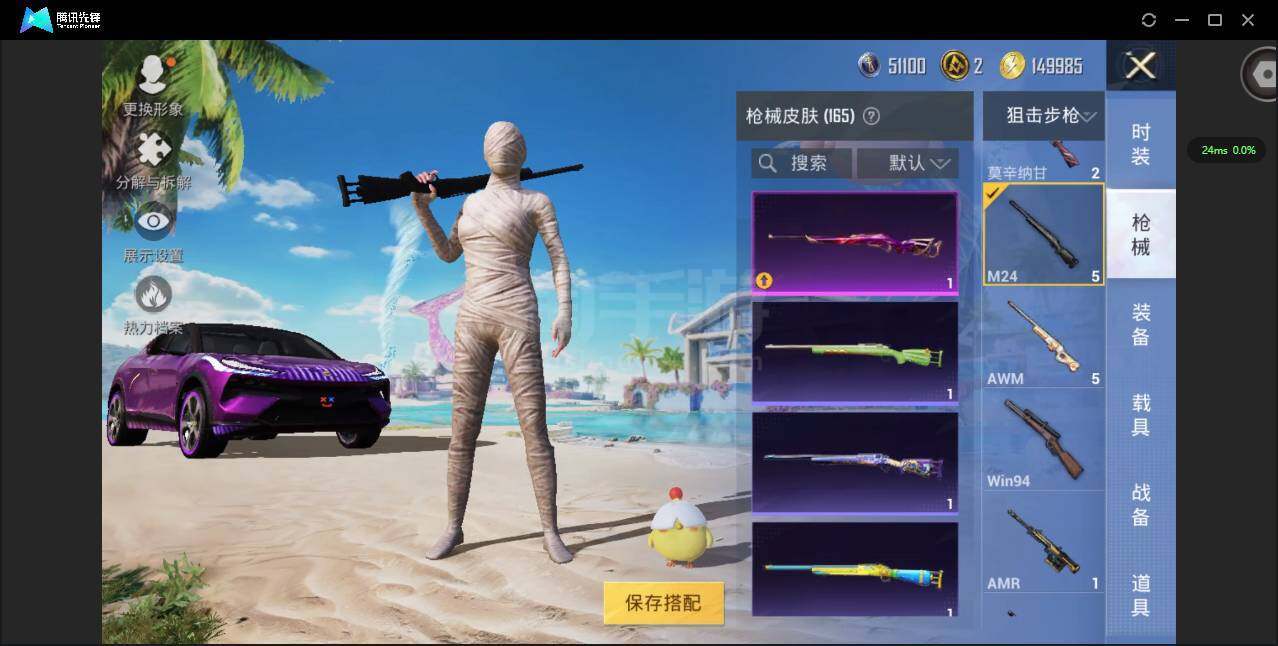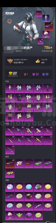 时装数: 118 载具数: 6 枪械数: 165 战备数: 98 热门装扮:
