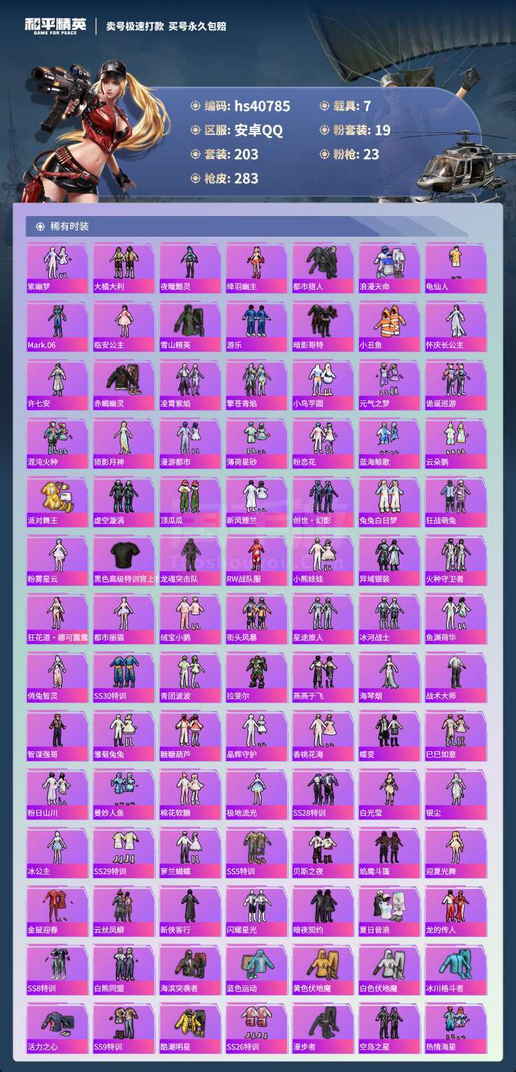 hs40785 安卓手Q-10王牌印记-19粉装-23特效枪-7载具-114900热力值-203套装