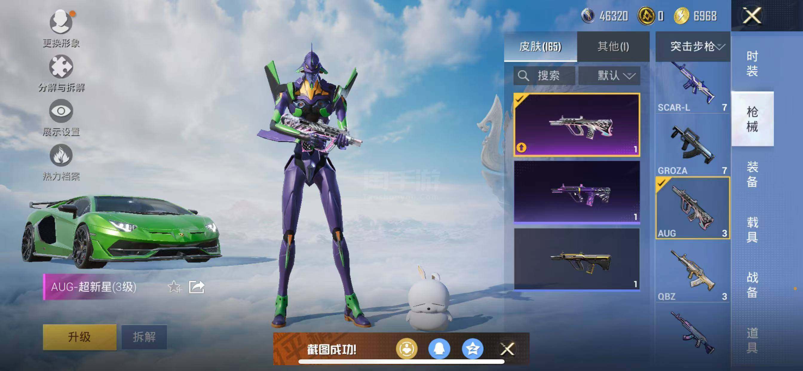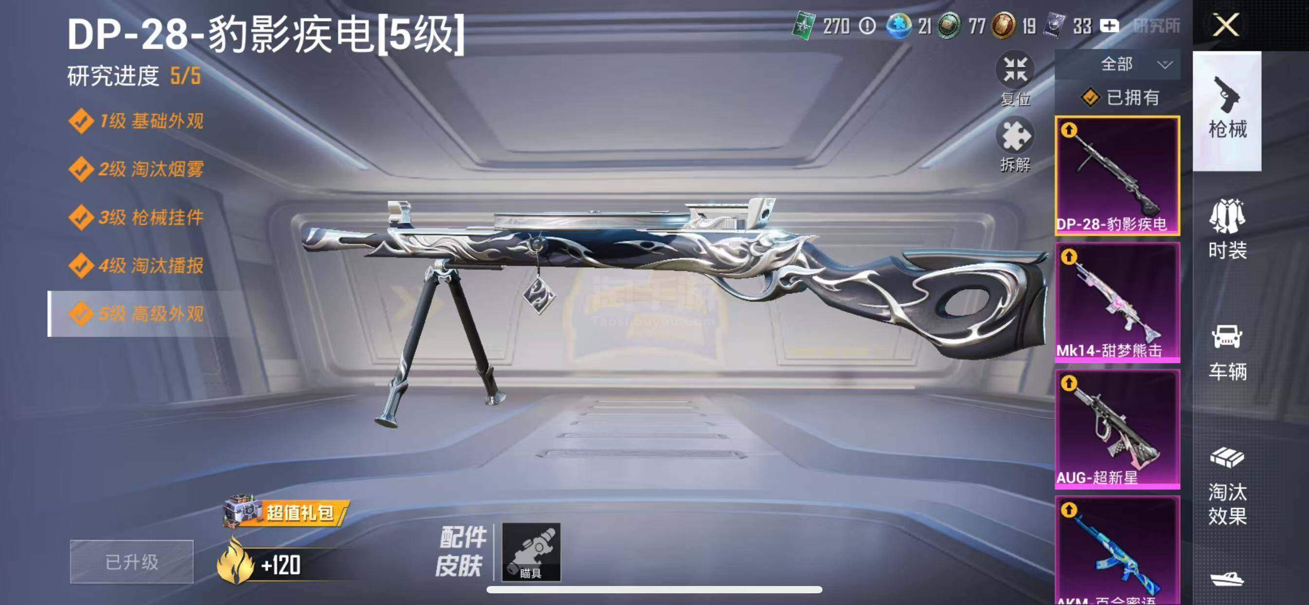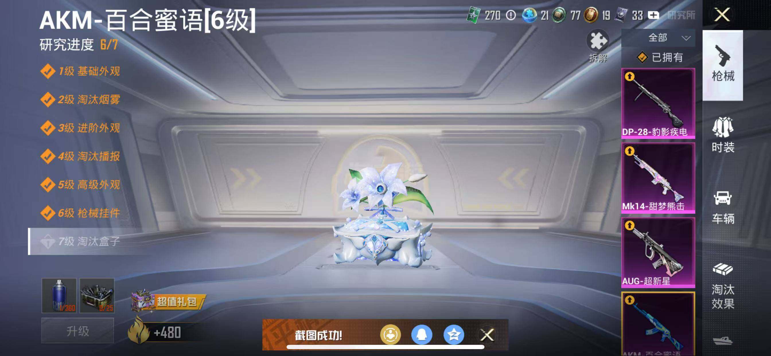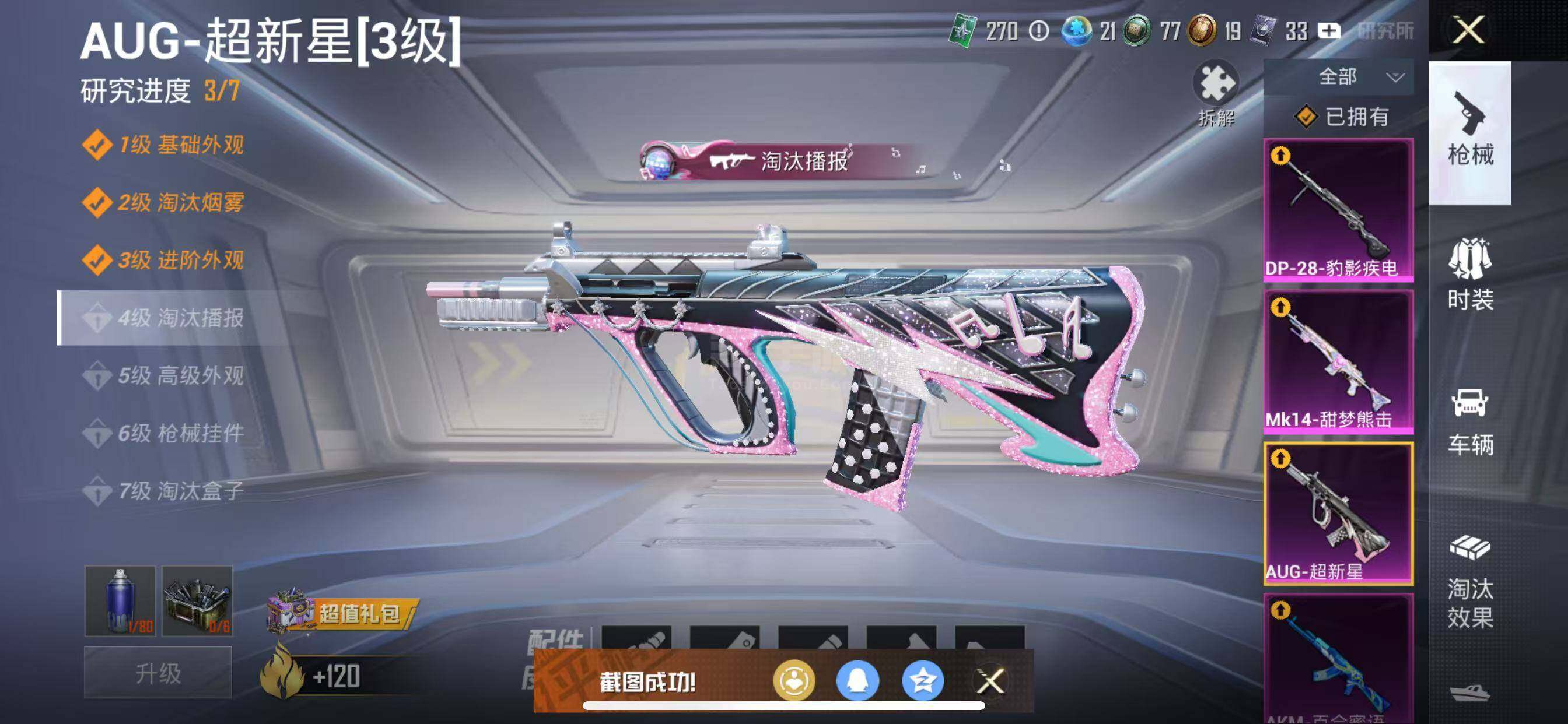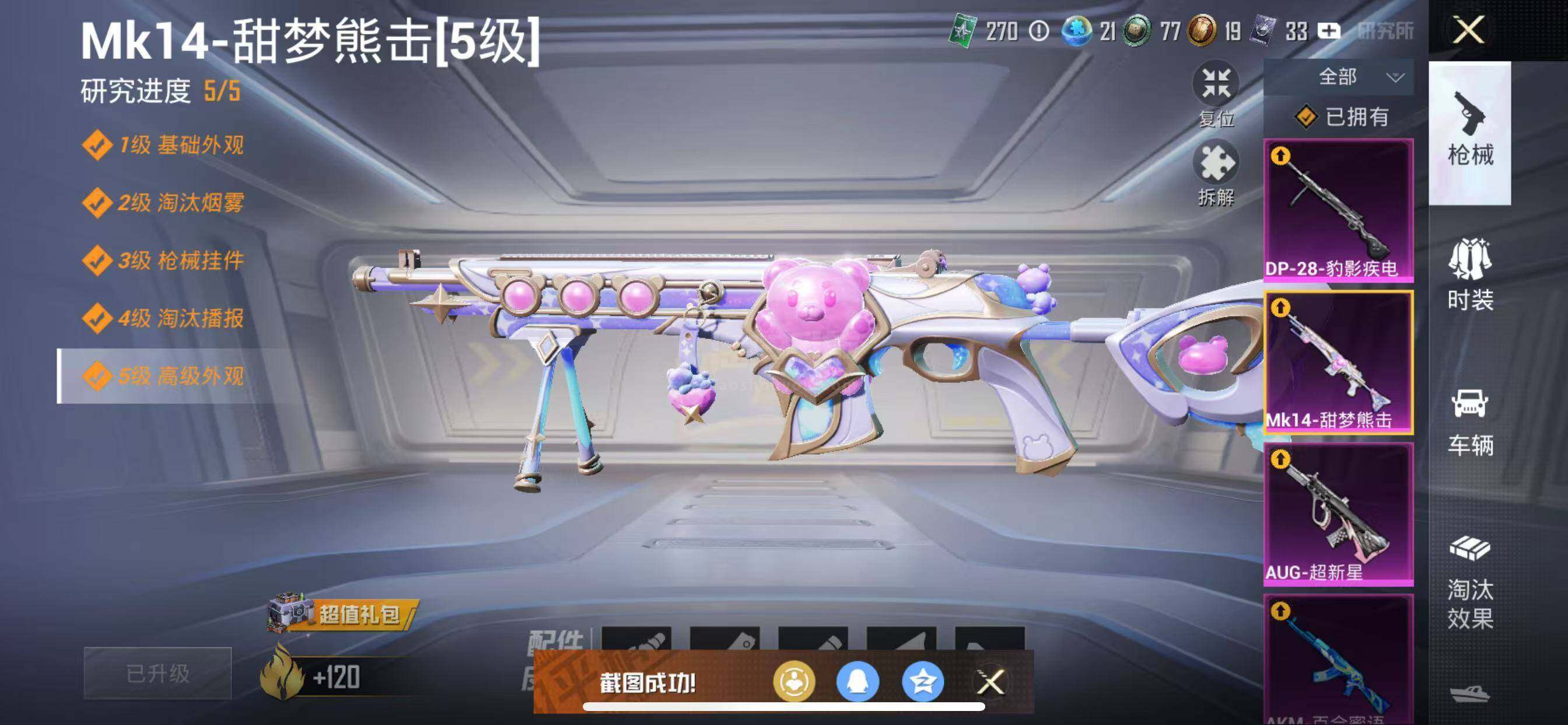 【特效枪等级】:AKM-百合蜜语(六级),SCAR-L-青春物语(四级),M416-心之恋语(六级),AUG-超新星(三级),UMP45-相思残雪(五级),Mk14-甜梦熊击(五级),DP-28-豹影疾电(五级)