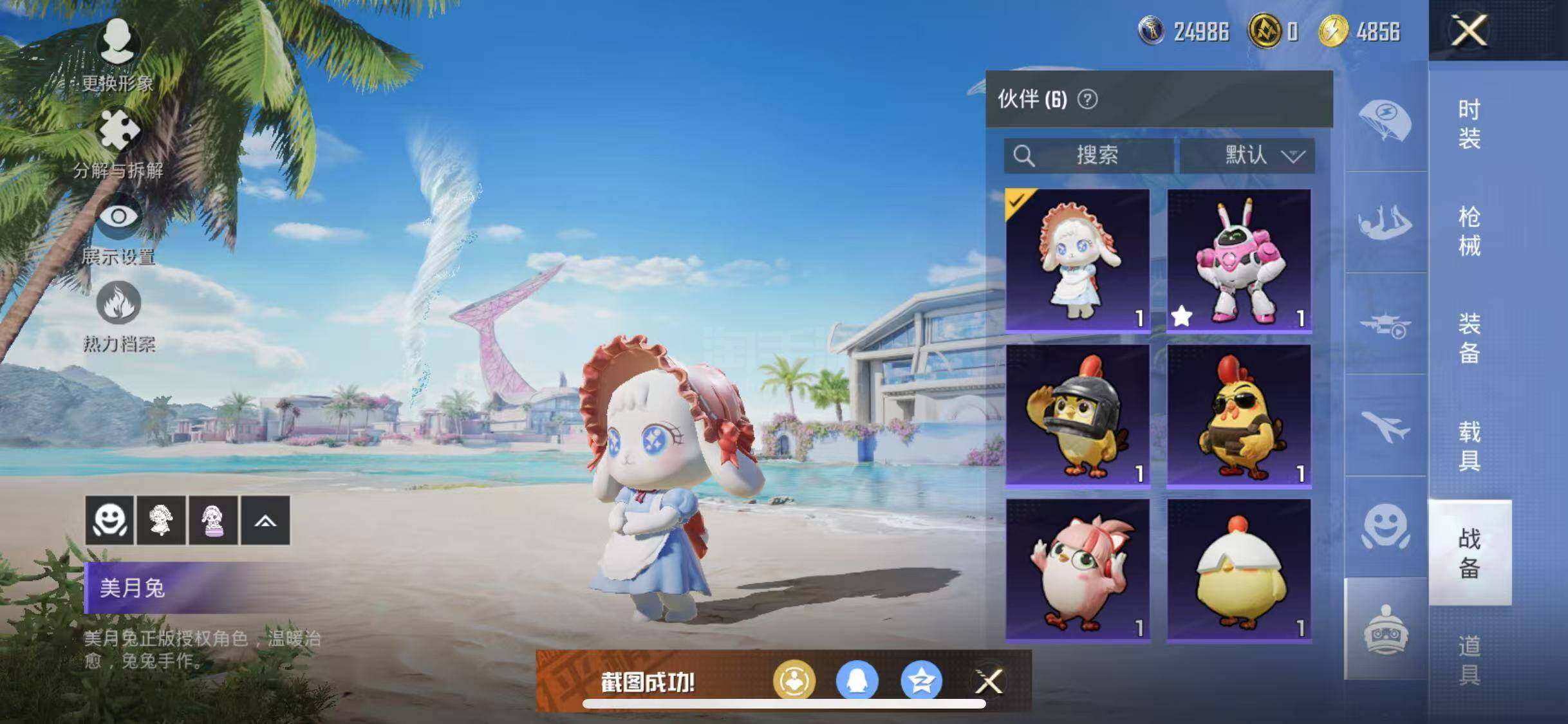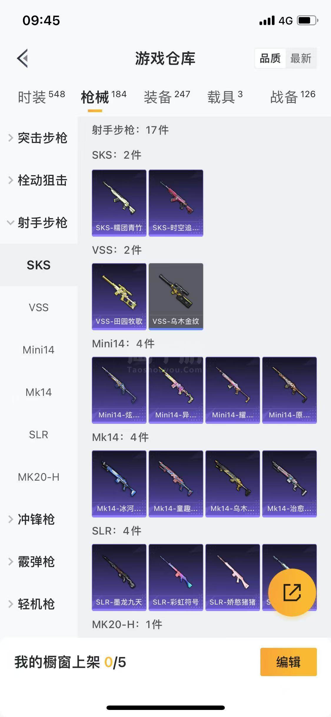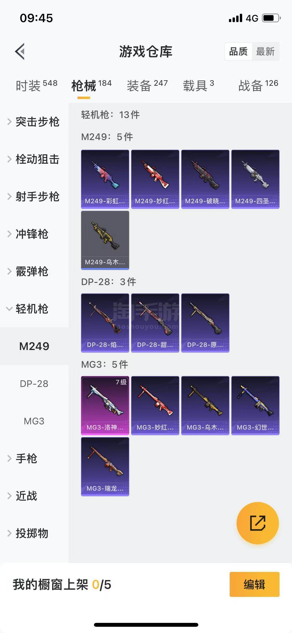 【特效枪等级】:SCAR-L-童趣迷兔(五级),M416-电玩时刻(五级),GROZA-焦糖拿铁(五级),UZI-筑梦精灵(五级),MG3-洛神天依(七级)