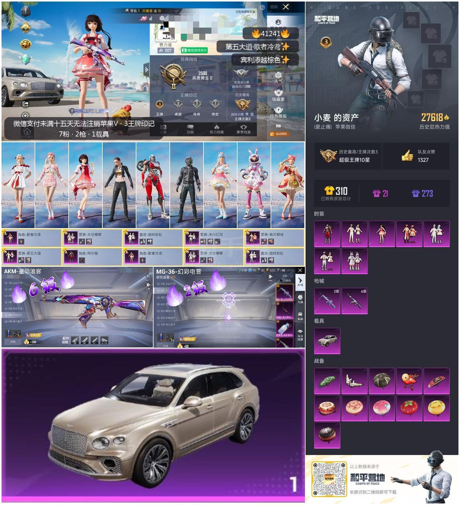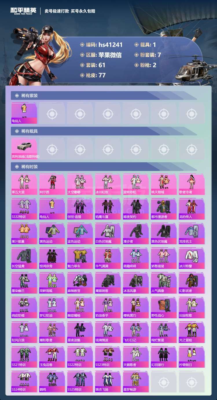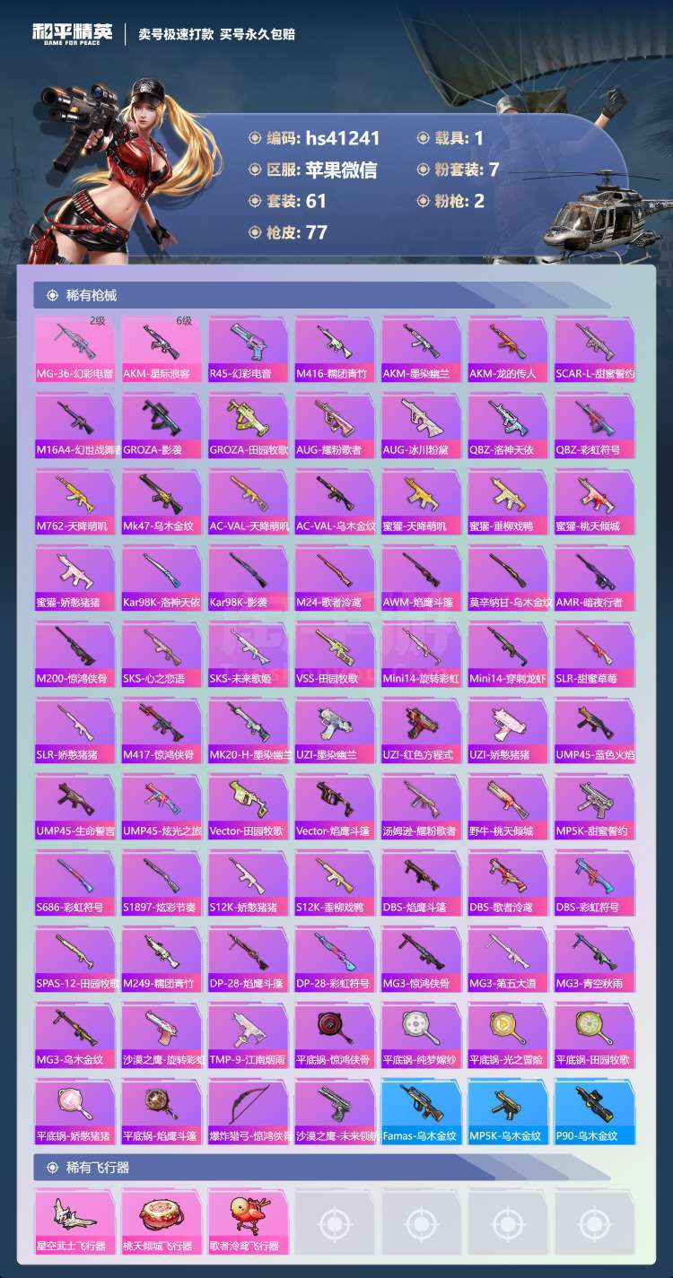 和平精英【苹果微信】hs41241 苹果微-3王牌印记-7粉装-2特效枪-1载具-27618热力值-61套装-77枪皮