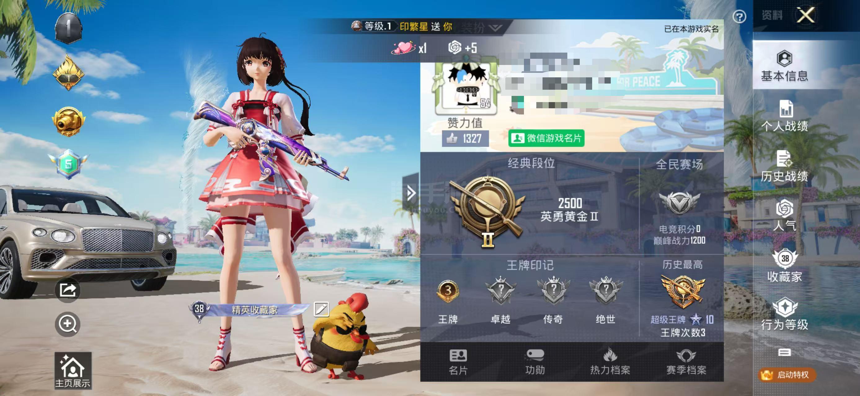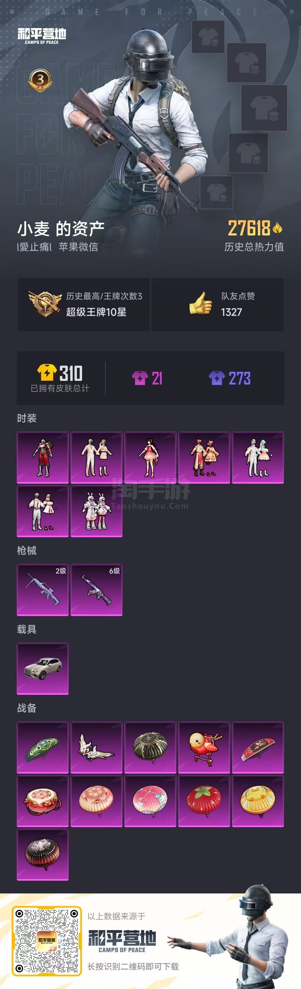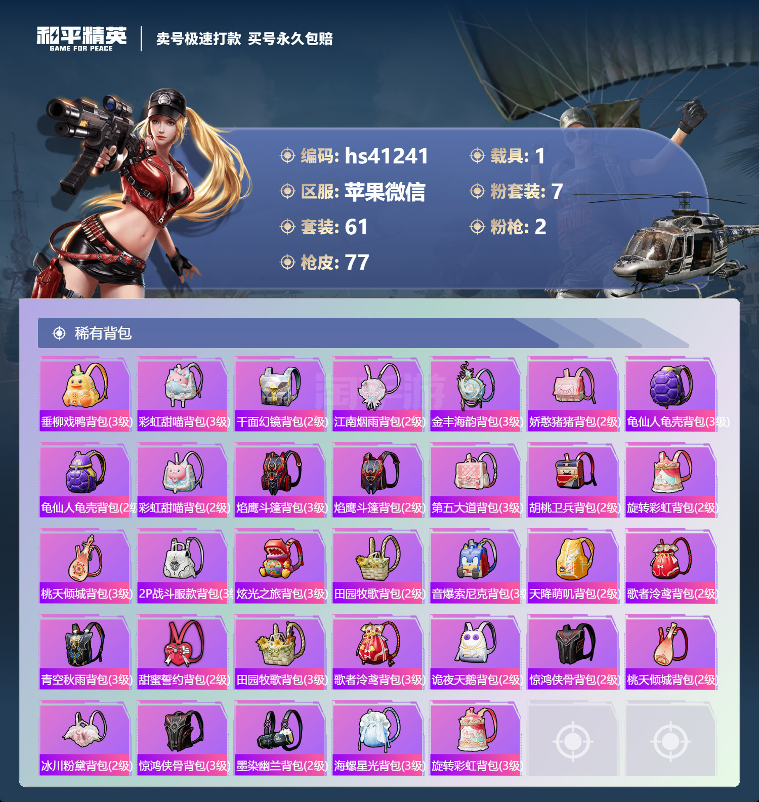 和平精英【苹果微信】hs41241 苹果微-3王牌印记-7粉装-2特效枪-1载具-27618热力值-61套装-77枪皮