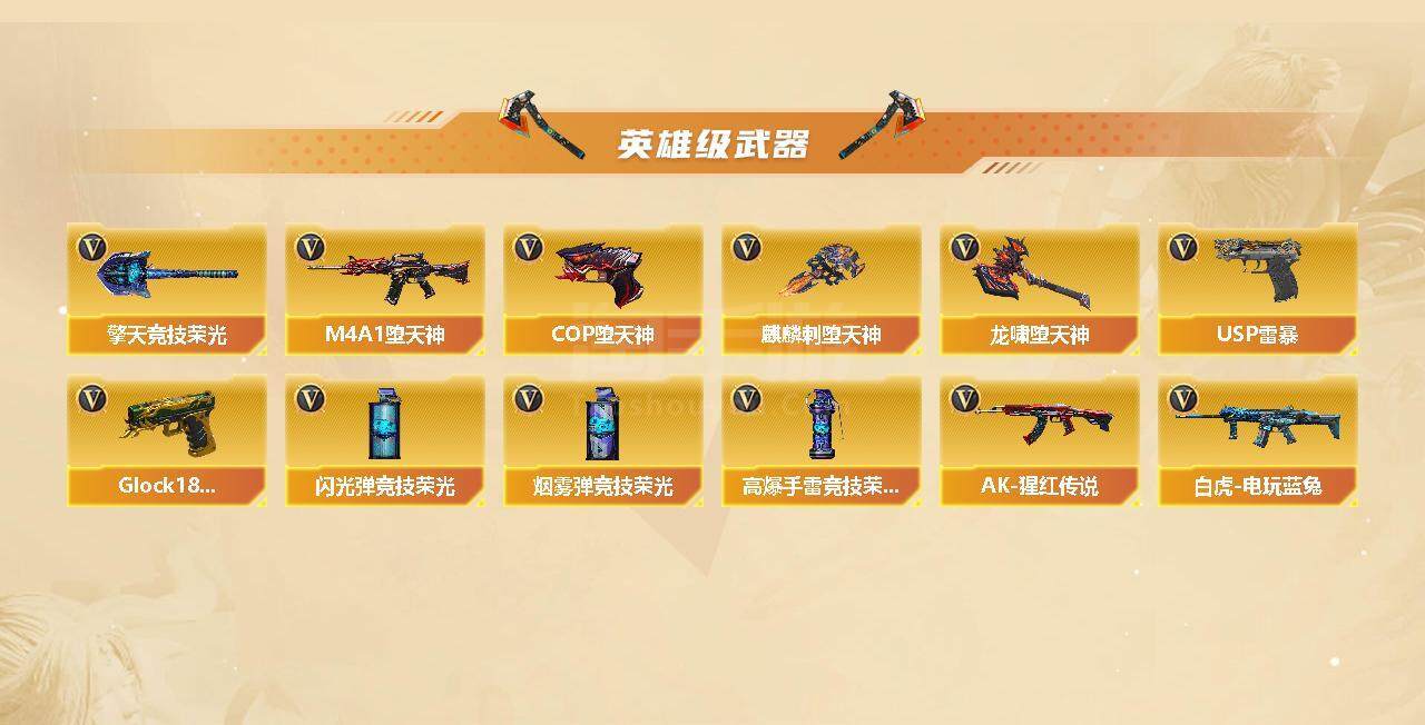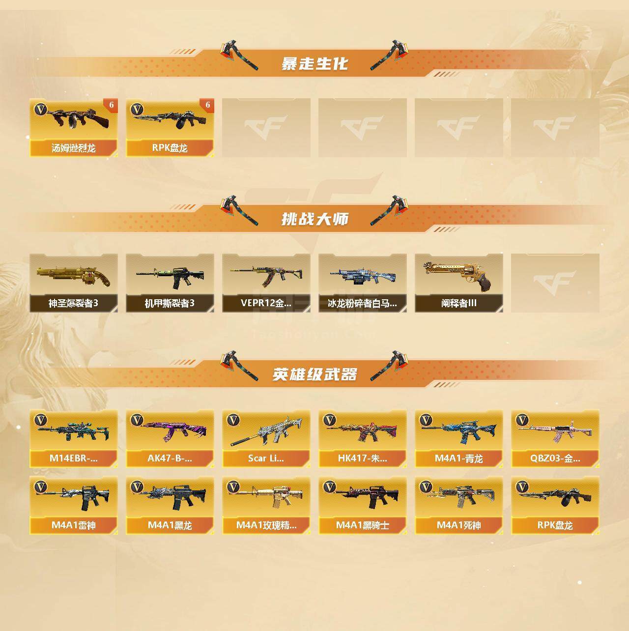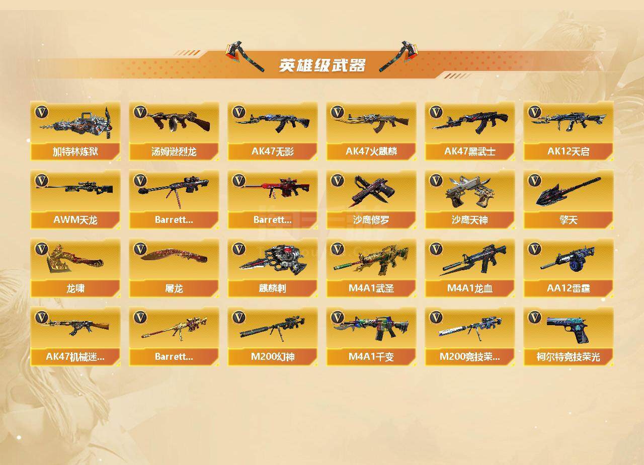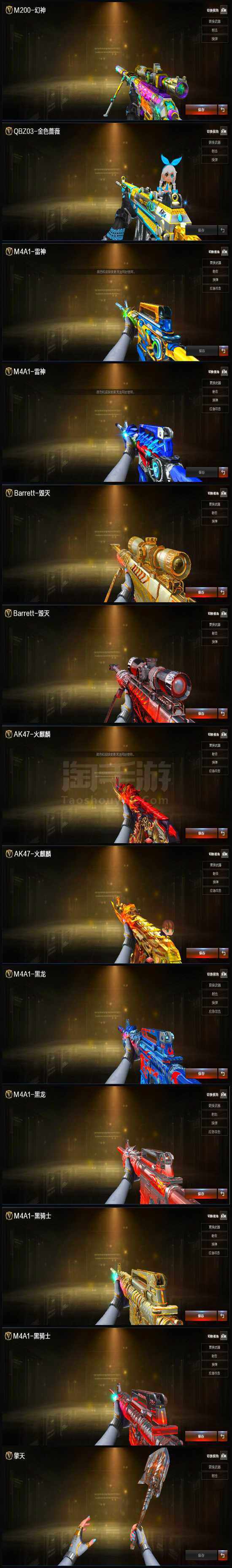 【热门武器】:QBZ03-金色蔷薇,M14EBR-玄武,Scar Light-白虎,HK417-朱雀,M4A1-青龙*2,M200-幻神,M200-竞技荣光,死亡之眼,白虎-电玩蓝兔,Cat-刀锋,炼狱-迷你小钢,毒蜂,M4A1-黑骑士*2,汤姆逊-烈龙*8,RPK-盘龙*6,加特林-炼狱*2,斯泰尔-蝴蝶,USP-雷暴,COP-堕天神,沙鹰-