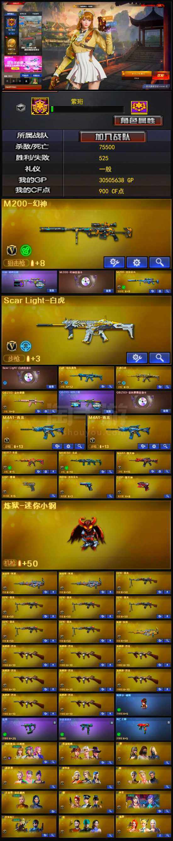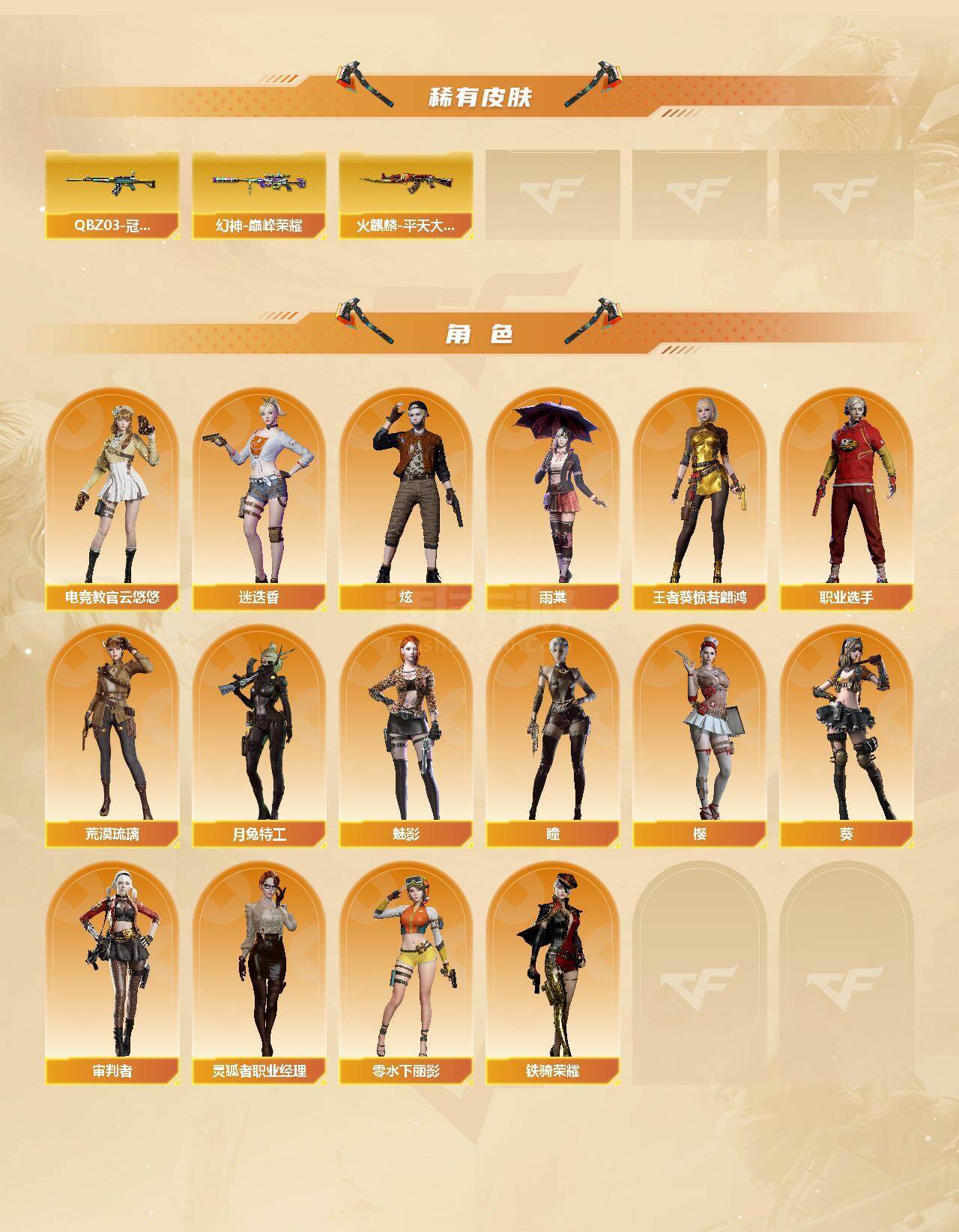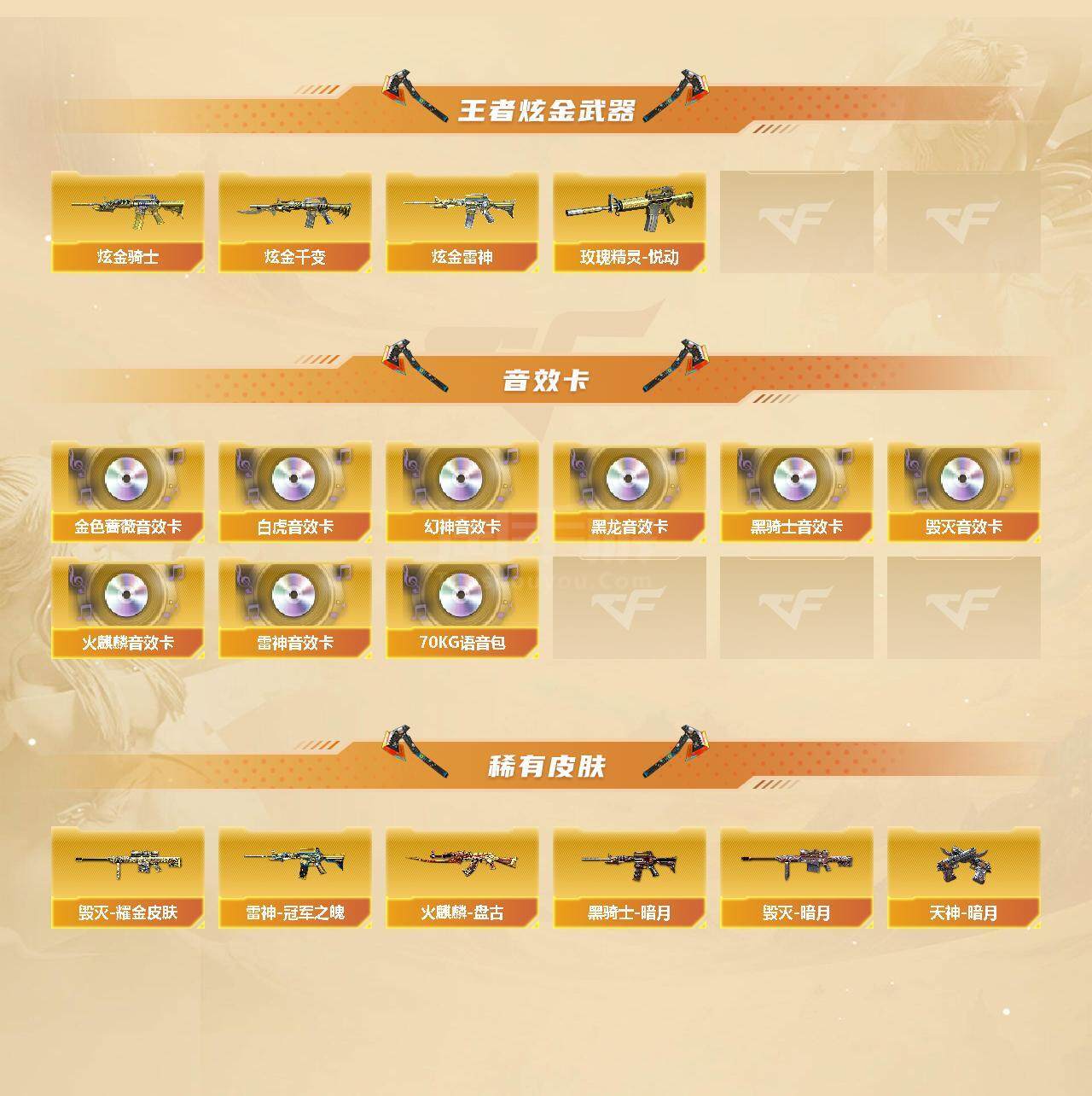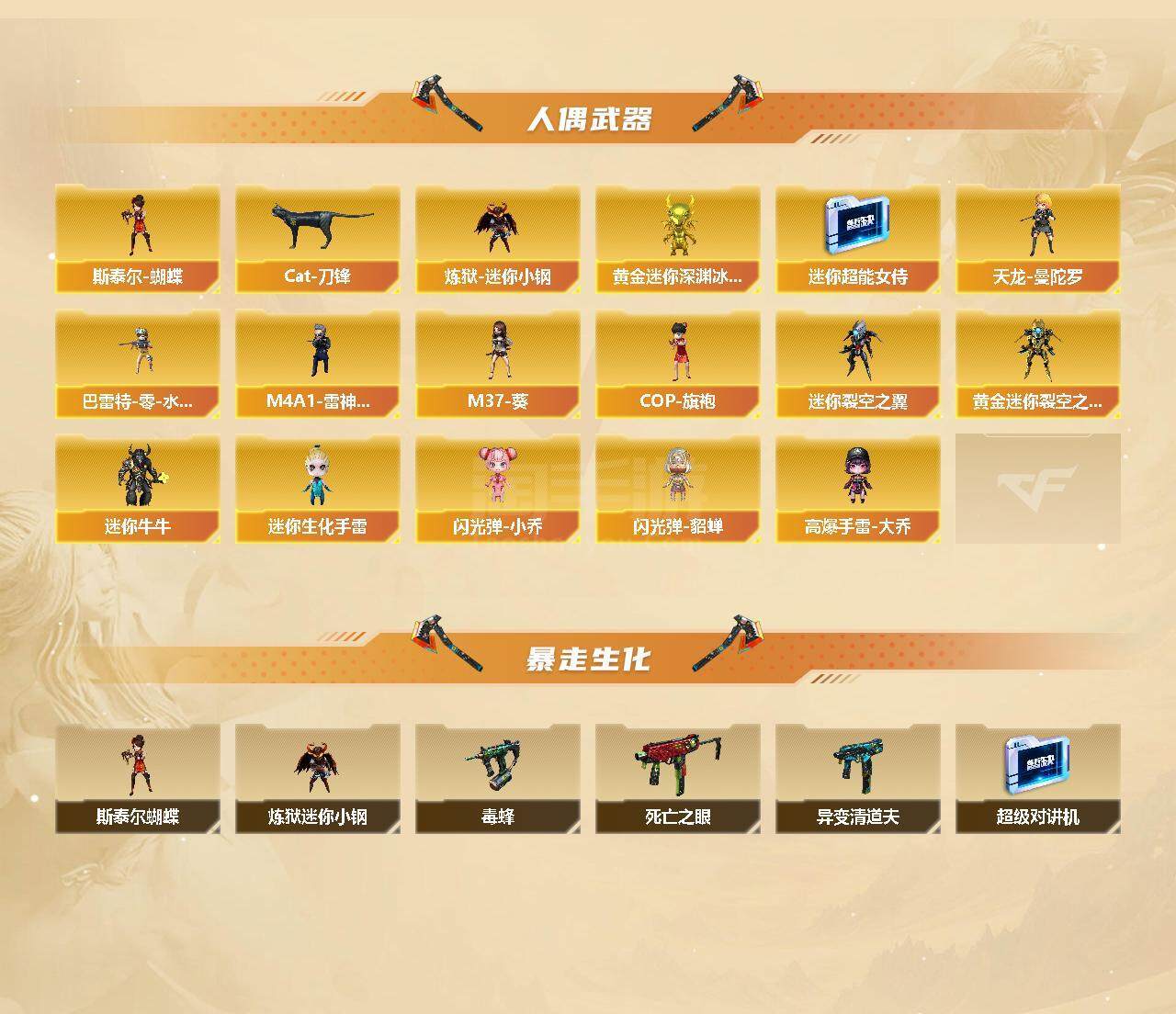 【热门武器】:QBZ03-金色蔷薇,M14EBR-玄武,Scar Light-白虎,HK417-朱雀,M4A1-青龙*2,M200-幻神,M200-竞技荣光,死亡之眼,白虎-电玩蓝兔,Cat-刀锋,炼狱-迷你小钢,毒蜂,M4A1-黑骑士*2,汤姆逊-烈龙*8,RPK-盘龙*6,加特林-炼狱*2,斯泰尔-蝴蝶,USP-雷暴,COP-堕天神,沙鹰-