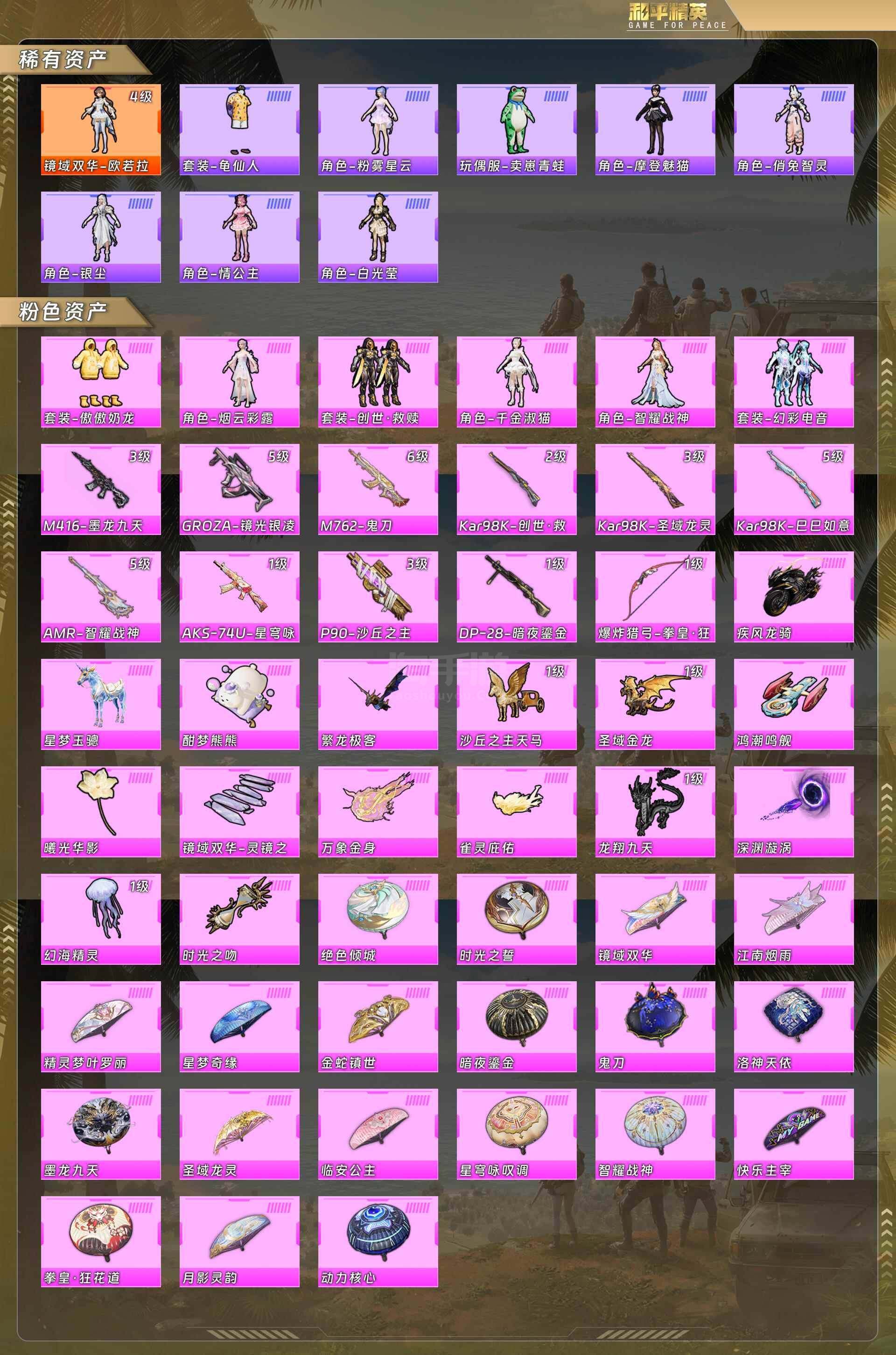 公主号-4级神装欧若拉/粉雾星云/摩登魅猫/傲傲奶龙/烟云彩露/千金淑猫/智耀战神/幻彩电音【粉色枪皮】M4墨龙九天3级/M762鬼刀6级/98K圣域龙灵3级/AMR智耀战神5级/P90沙丘之主3级【载具】疾风龙骑/星梦玉骢(1神装2载具11粉枪6粉套)HP1830 没战神框 可立即换绑无需挂单养号-73647热力值-8印记-125套装-217枪皮