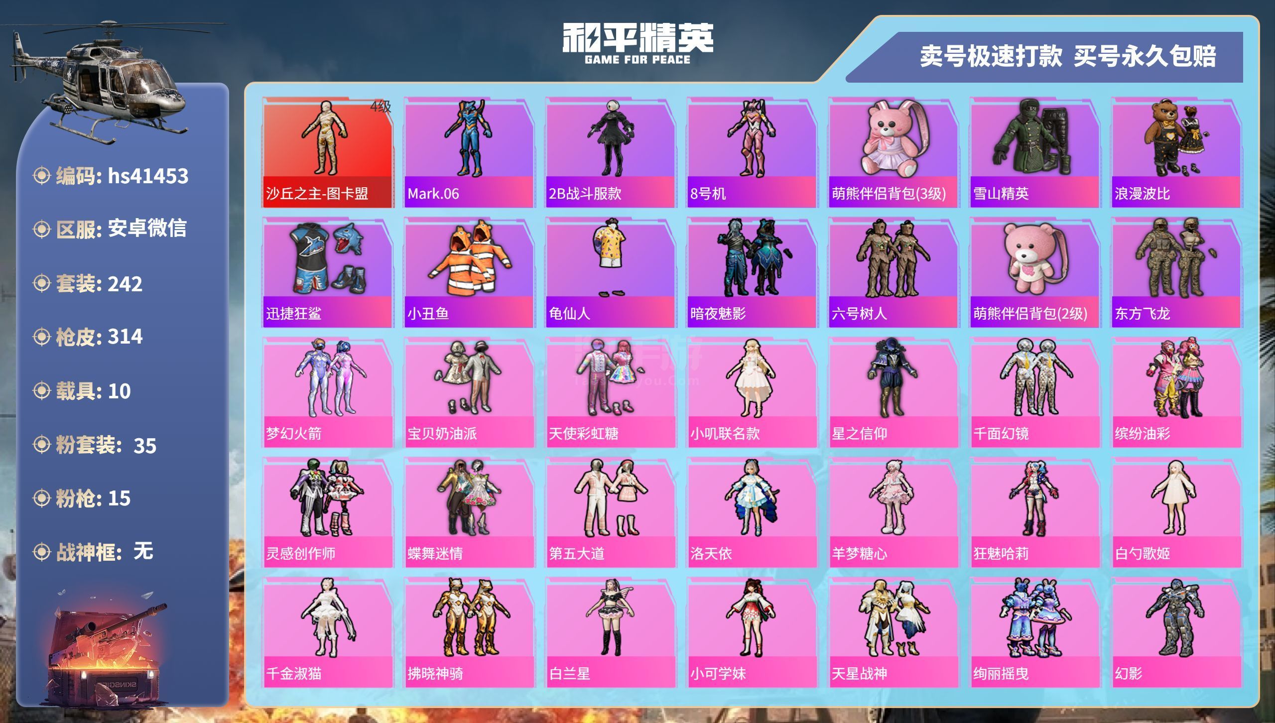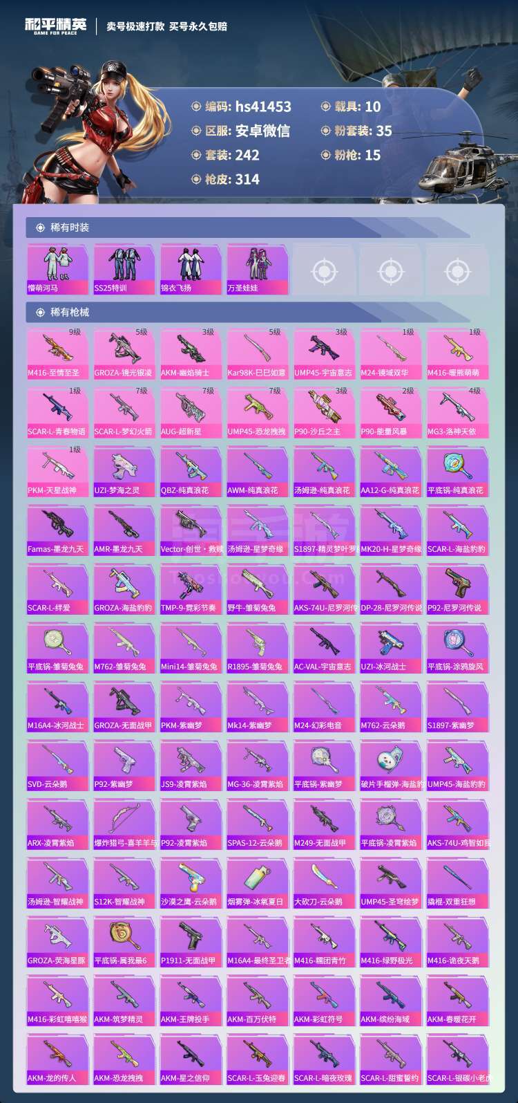 hs41453 安卓微-16王牌印记-35粉装-15特效枪-10载具-147768热力值-242套
