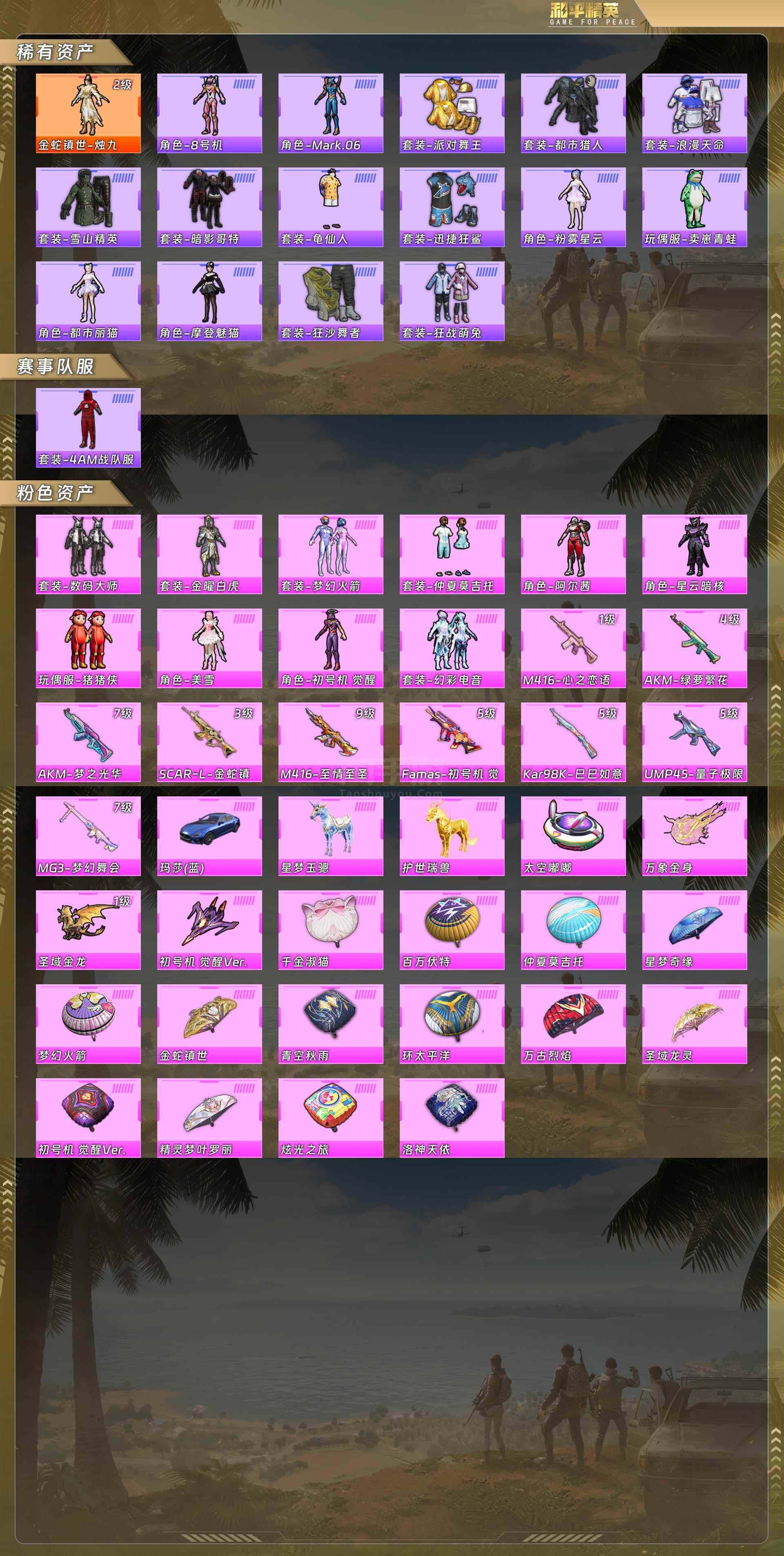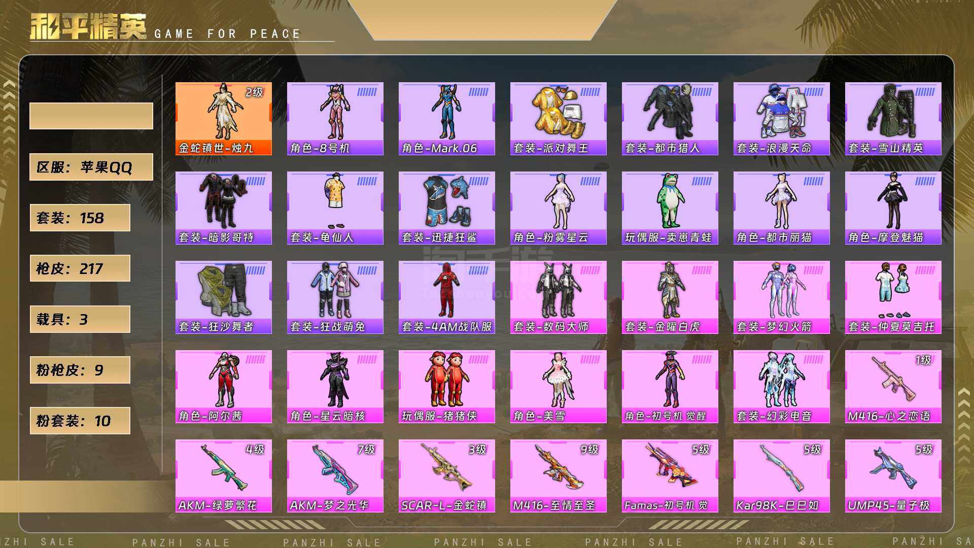 身法号-无敌战神框-2级神装烛九2级/满级至情至圣/三色螳螂/小金鞋/都市猎人/红眼罩/浪漫天命/雪山精英/迅捷狂鲨/粉雾星云/卖崽青蛙/都市丽猫/摩登魅猫/狂沙舞者/梦幻火箭/美雪/幻彩电音【粉色枪皮】AKM梦之光华7级/SCARL金蛇镇世3级/M416至情至圣9级/MG3梦幻舞会7级【载具】玛莎拉蒂(蓝)/星梦玉骢/护世瑞兽(1神装3载具9粉枪10粉套)HP1694 可立即换绑无需挂单养号-