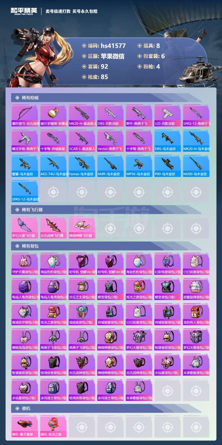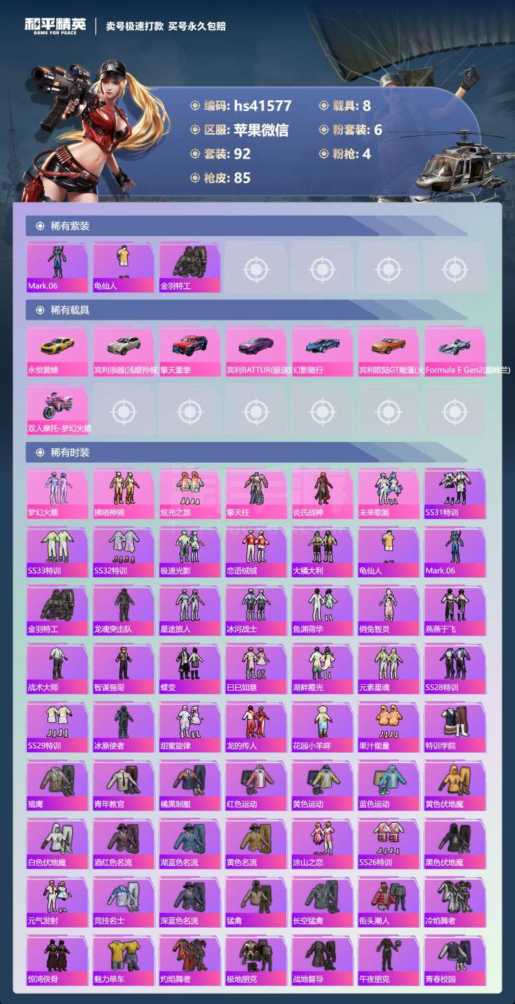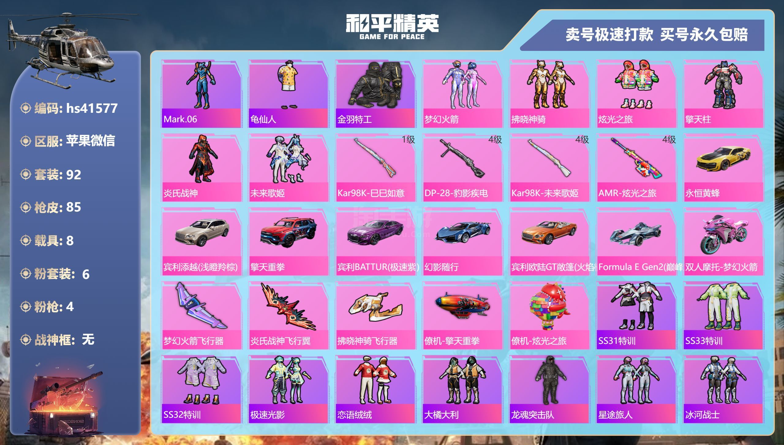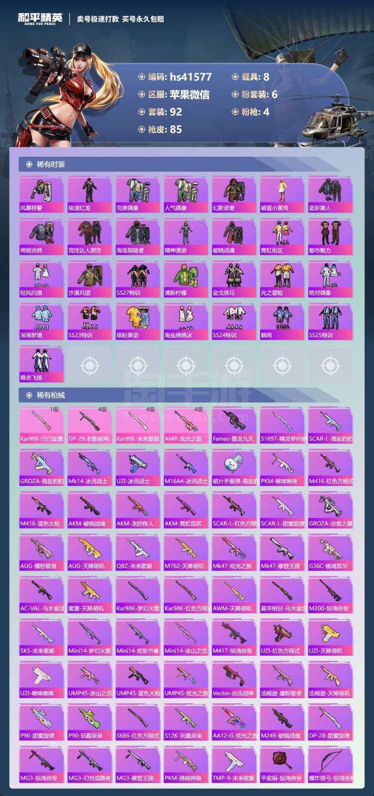 hs41577 苹果微-1王牌印记-6粉装-4特效枪-8载具-39166热力值-92套装-85枪皮