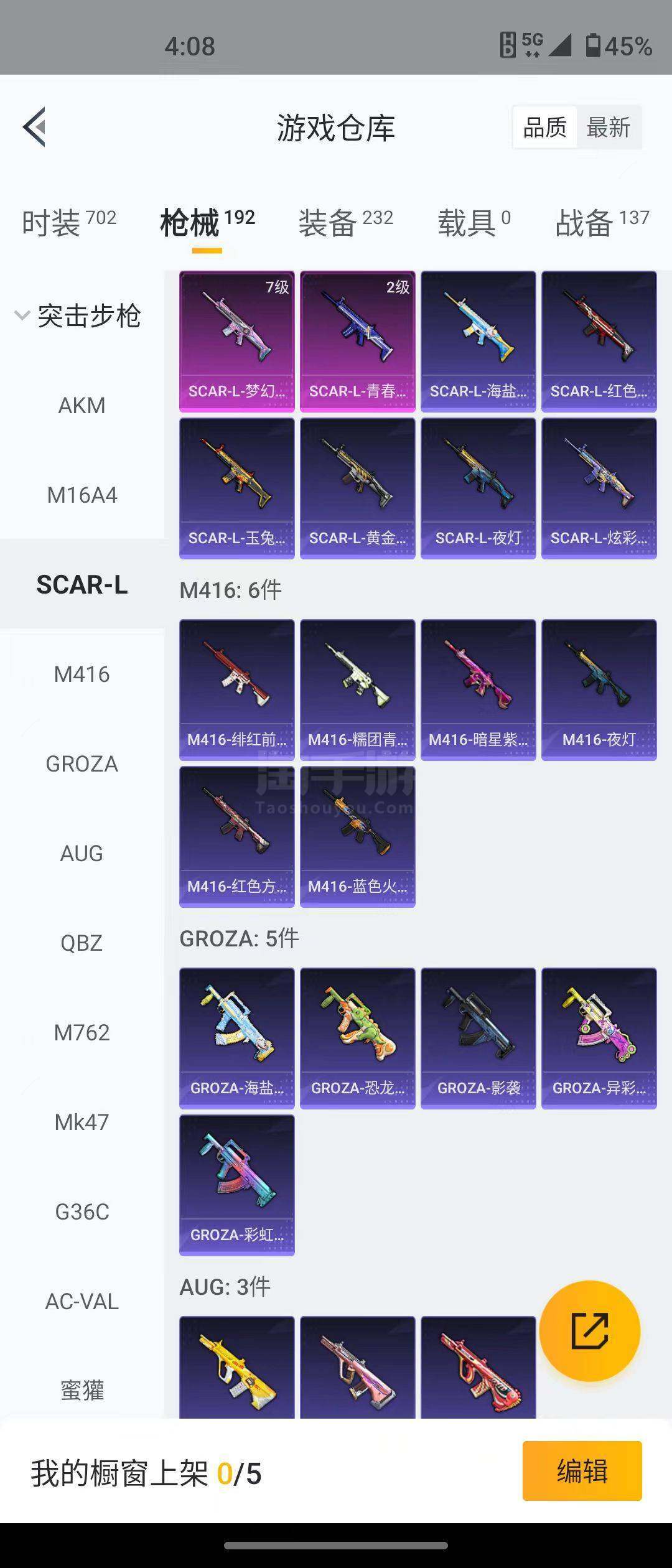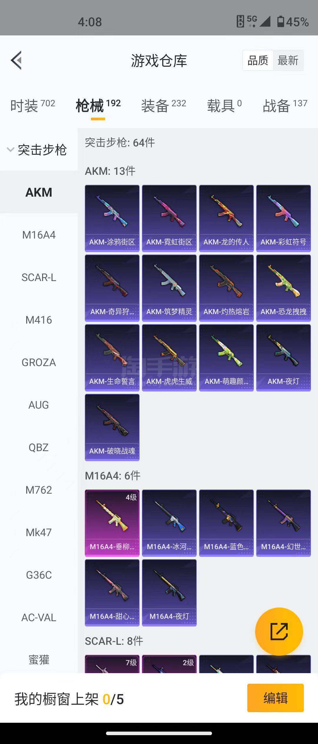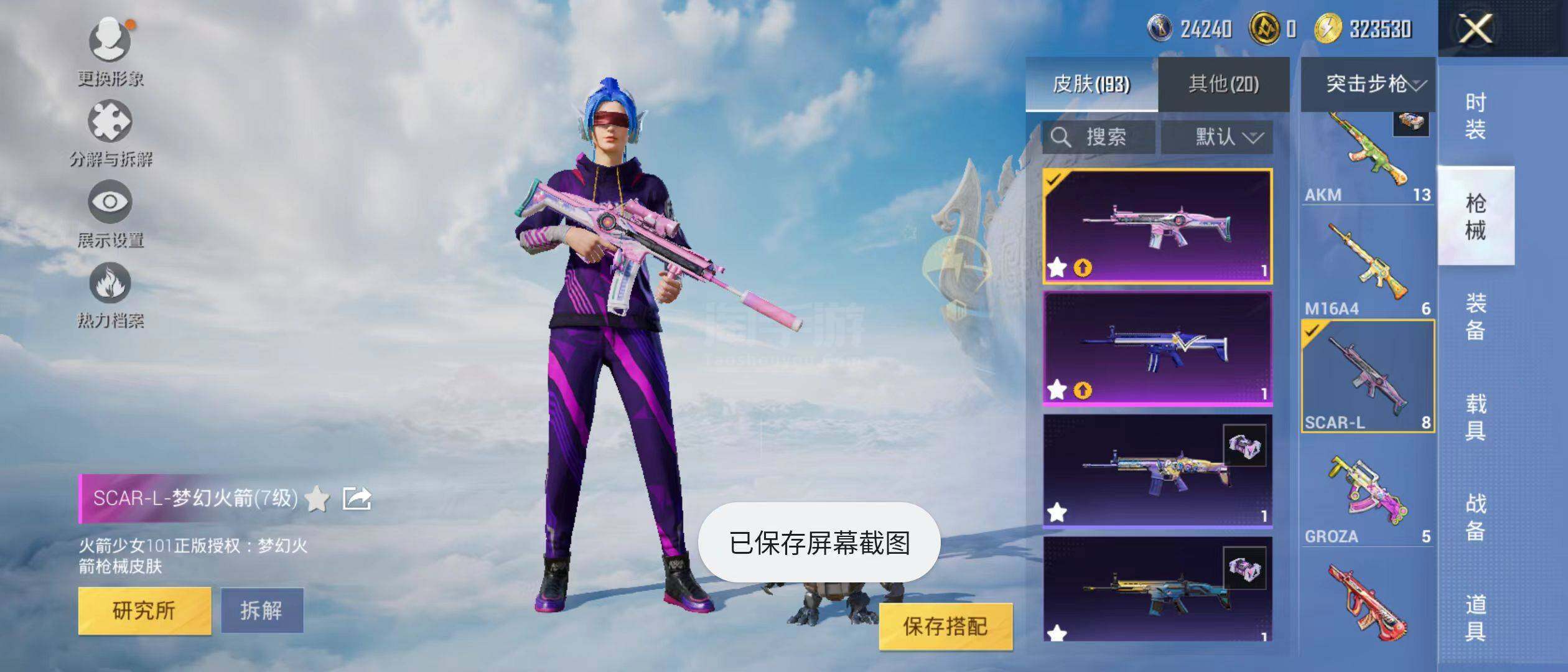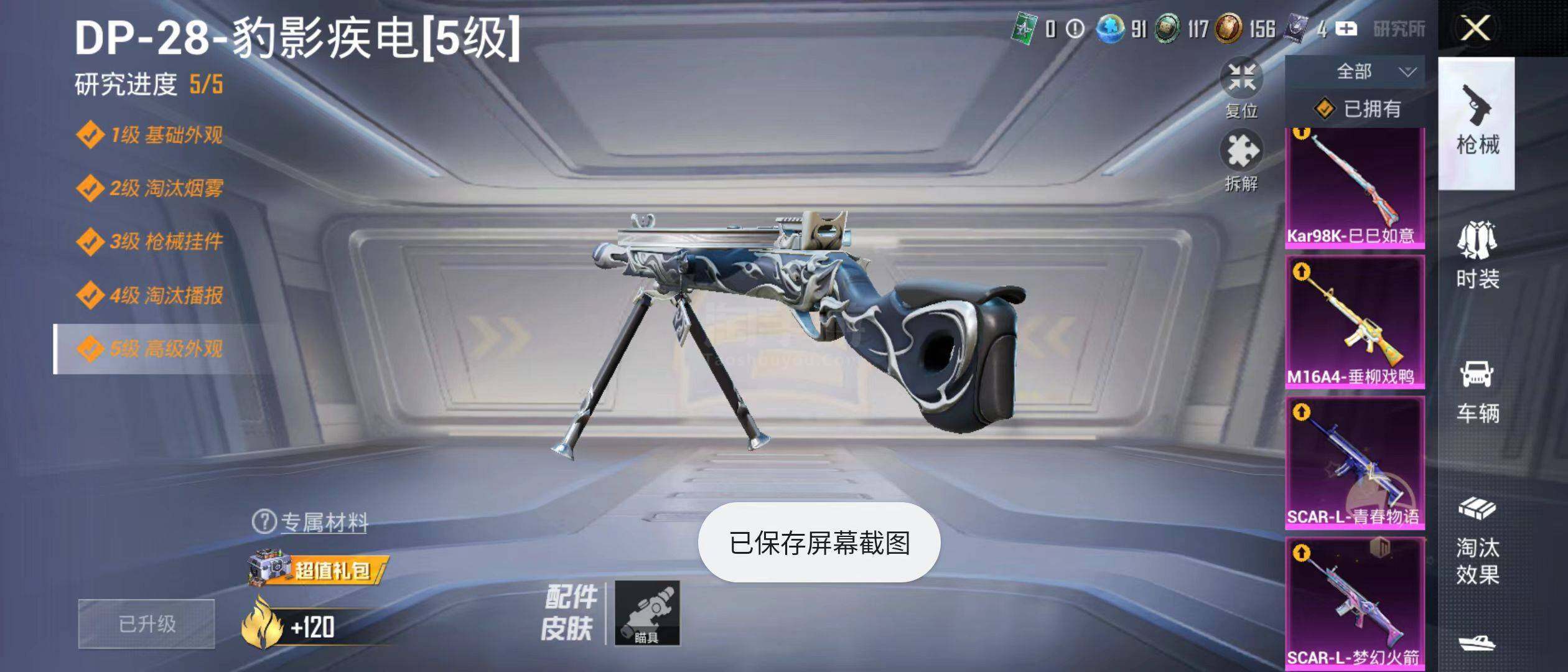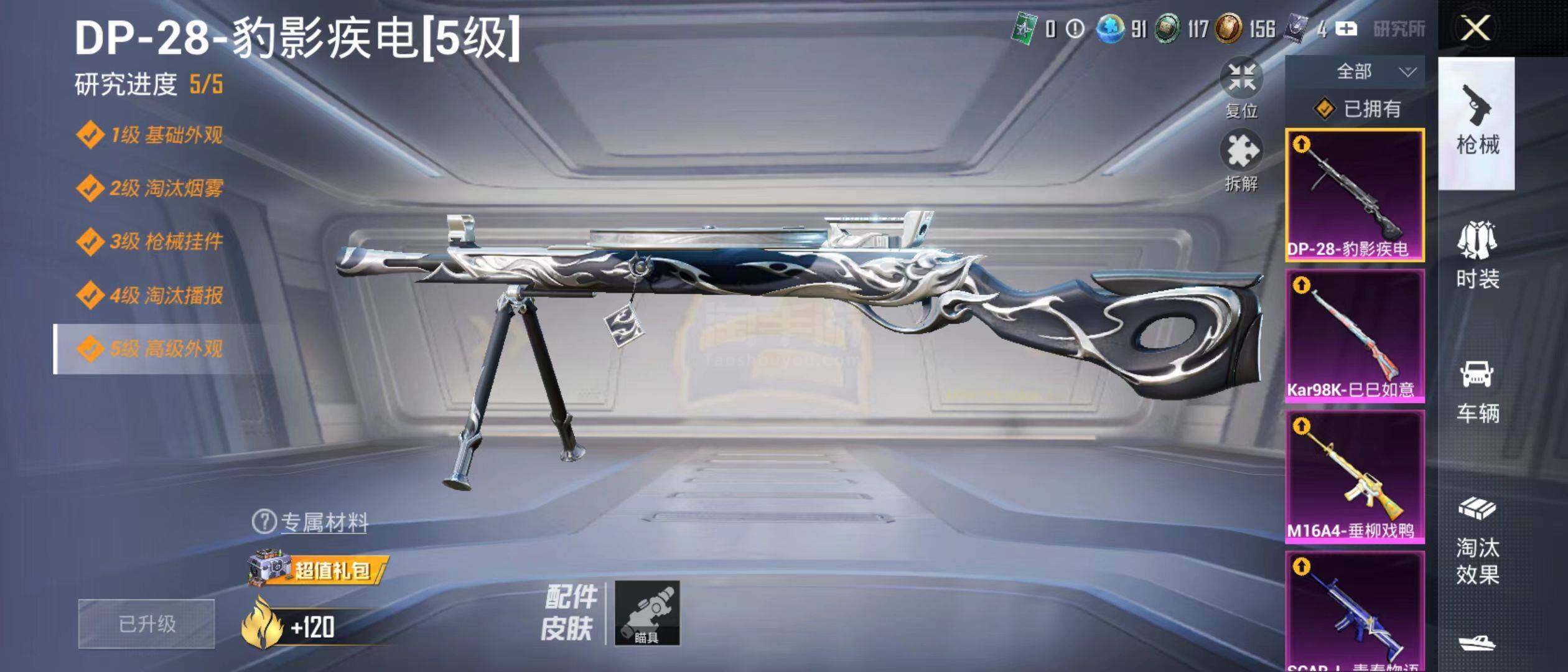 【特效枪等级】:M16A4-垂柳戏鸭(四级),SCAR-L-梦幻火箭(七级),SCAR-