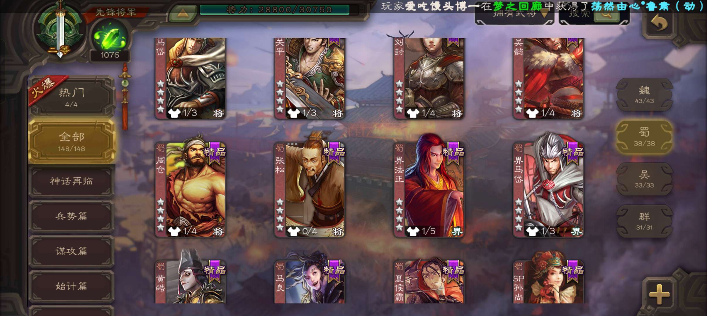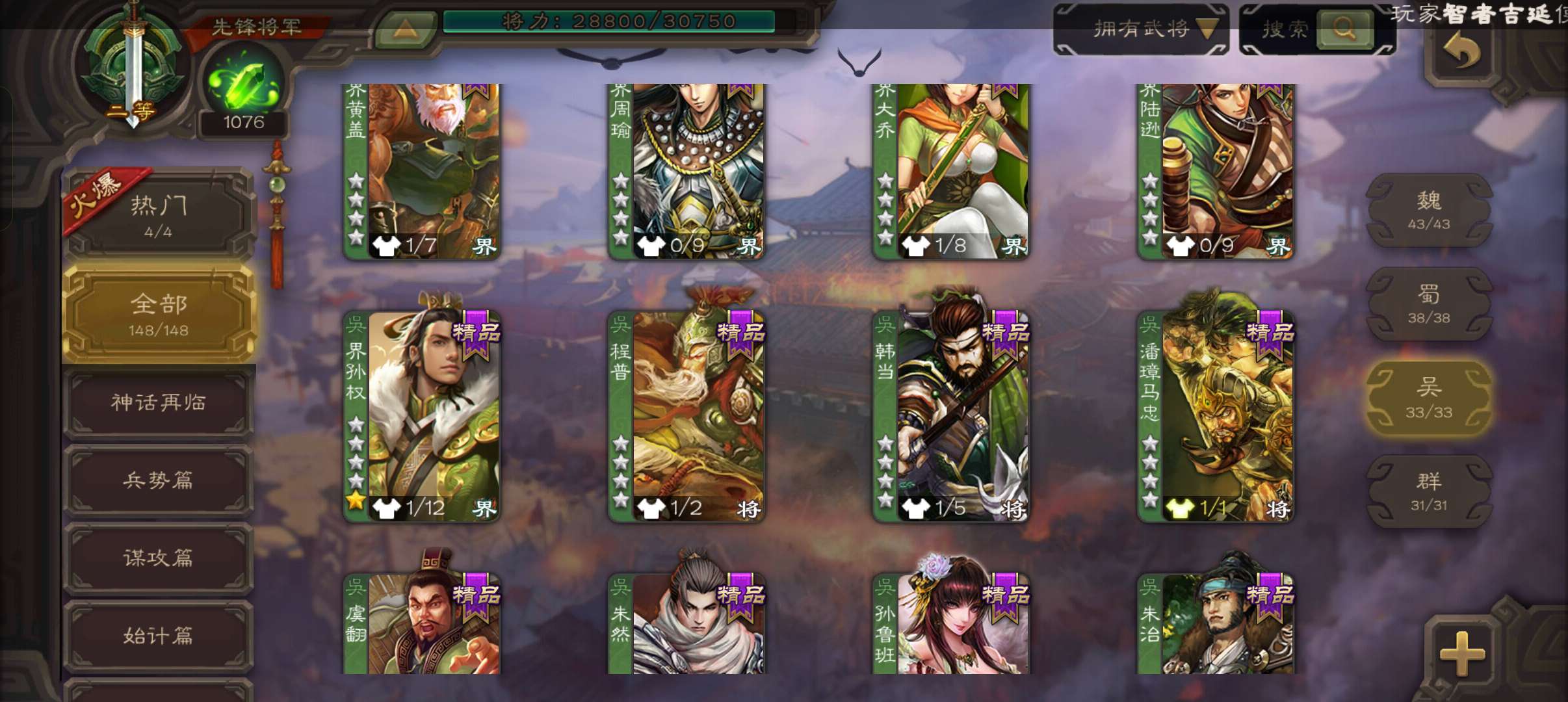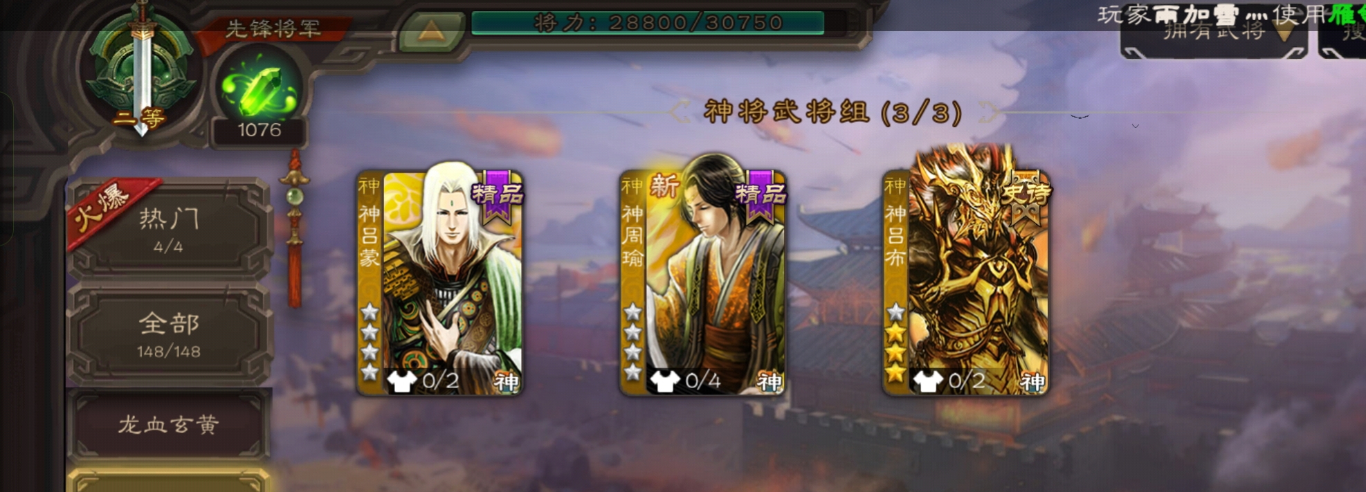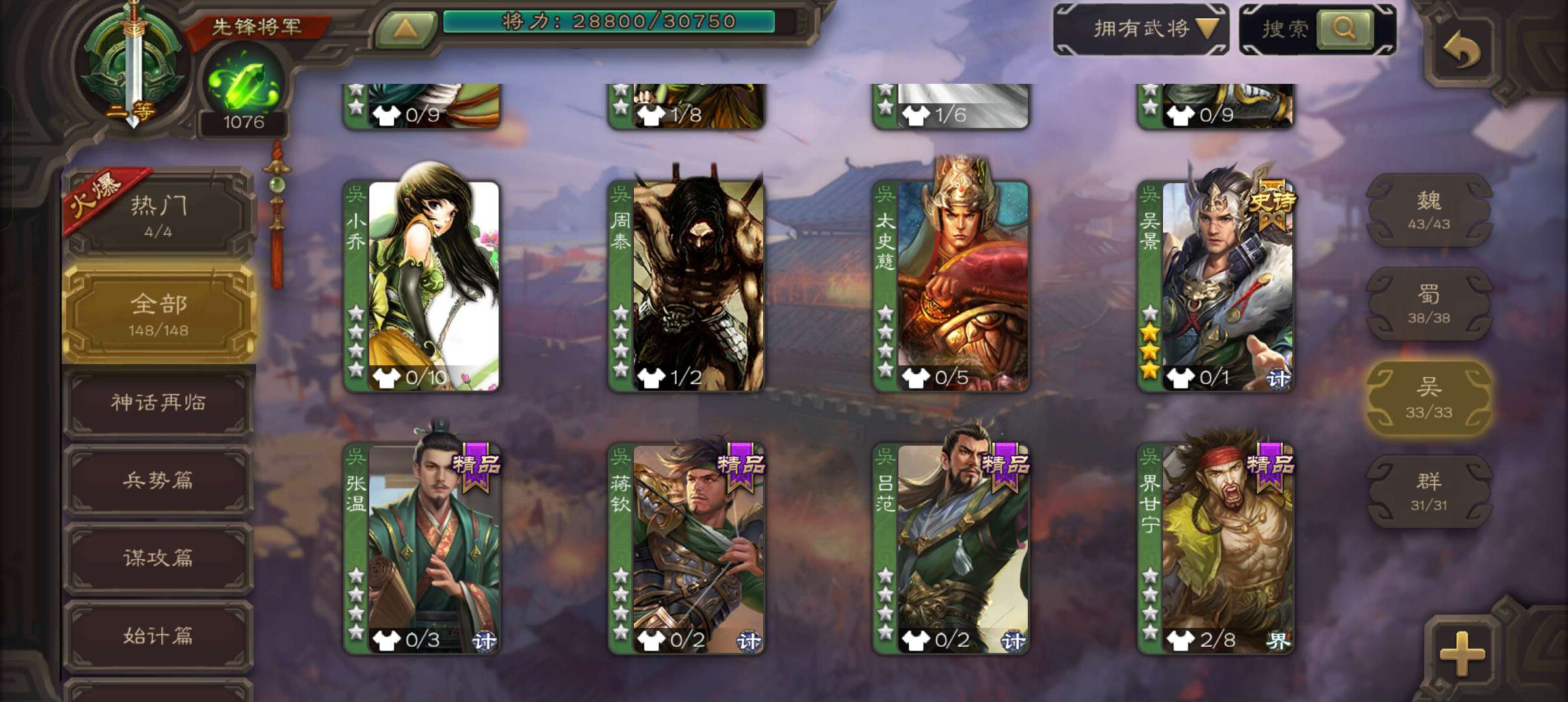 4史诗3神先锋,天工势庞羲,蒋济神吕布吴景赵襄,神周瑜神吕蒙界孙权界吕布崔琰甘夫人彭恙孙茹148将